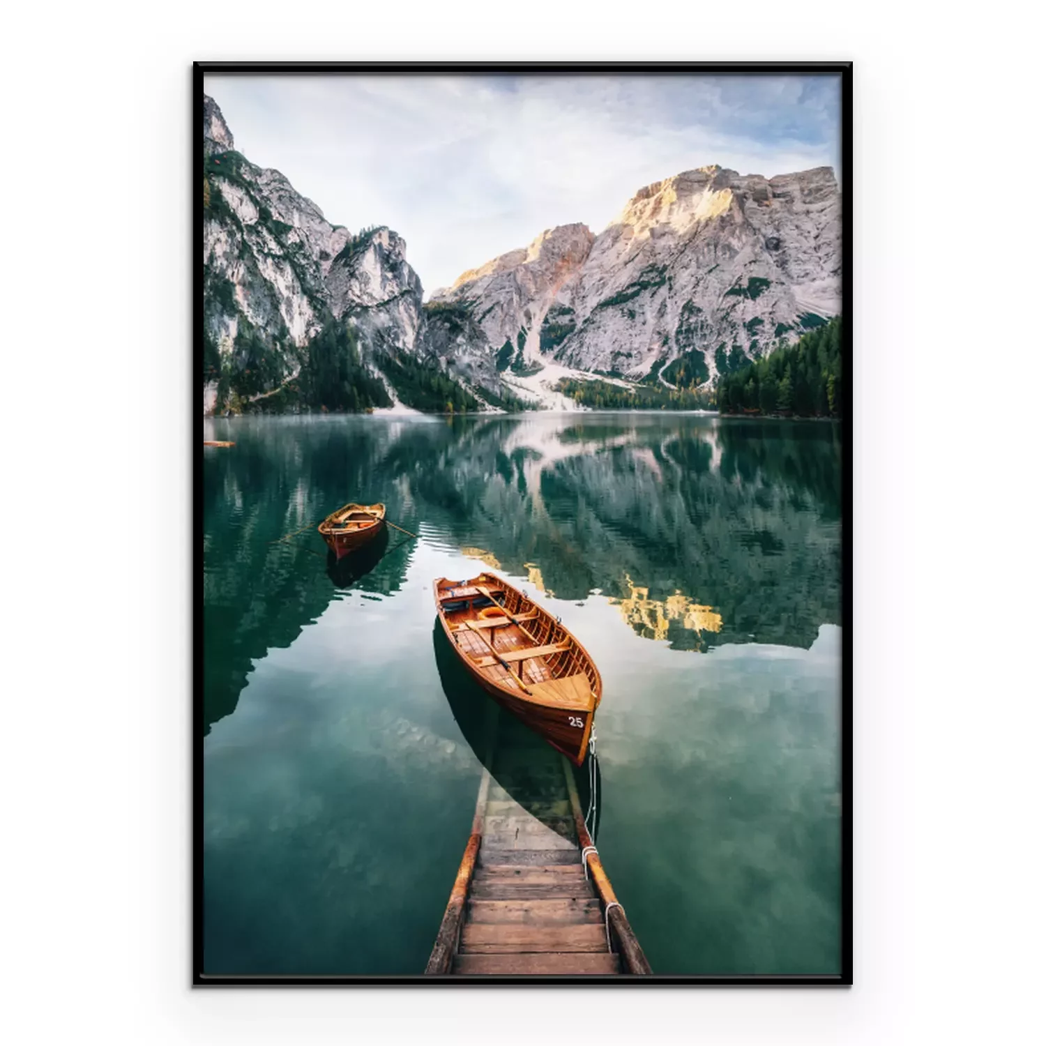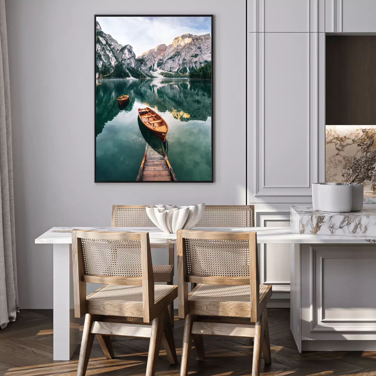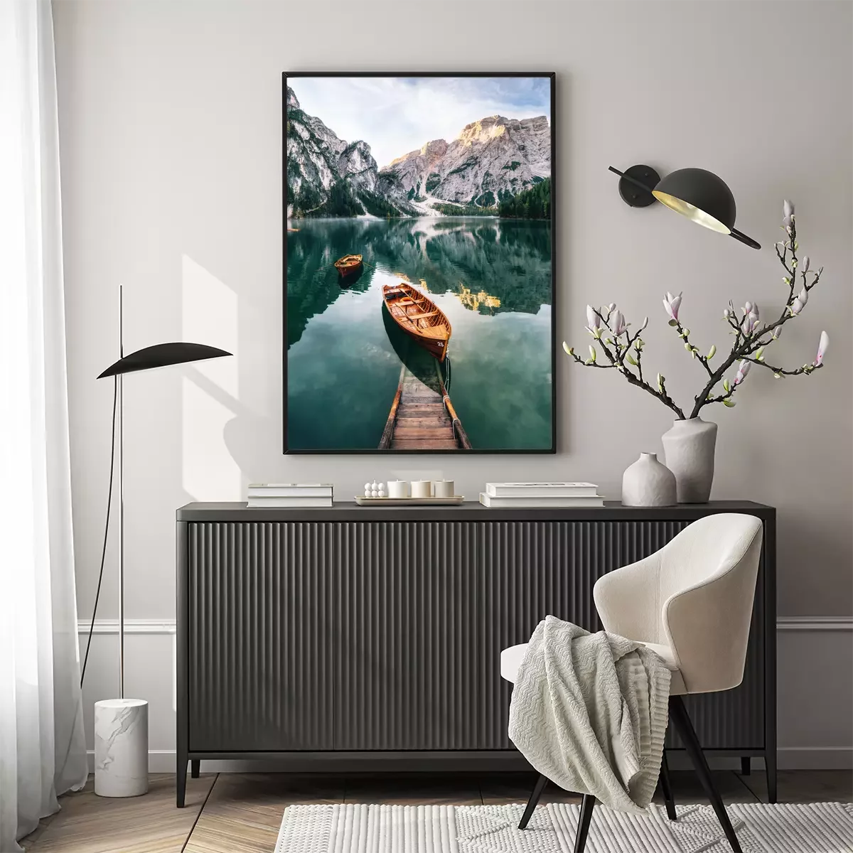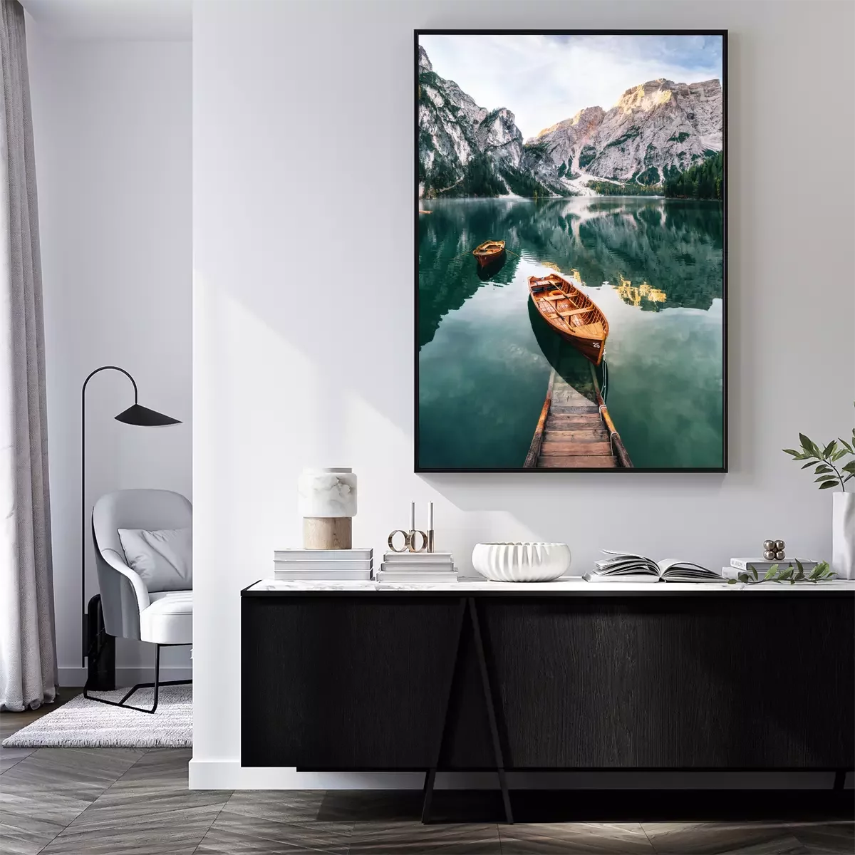Breng een vleugje natuur in je huis. Het is makkelijker dan je denkt. Hang een schilderachtige poster aan de muur. Boot op het meer met op de achtergrond rotsachtige hellingen is een prachtig uitzicht dat je ogen elke dag zal plezieren. Hoewel het een Italiaans landschap is, zorgt het bergklimaat ervoor dat deze compositie in veel verschillende stijlen gebruikt kan worden. We hebben ten minste drie decoratie-ideeën. In een Scandinavisch interieur zal zo'n poster prachtig staan. Bergen passen goed bij een interieur geïnspireerd op noordelijk design en natuur. De ruwe uitstraling van dit landschap kan worden verzacht door zachte, beige textiel, zoals een harig tapijt of pluchen sierkussens, toe te voegen. Het tweede idee is een industriële inrichting. In zo’n interieur zal de hier getoonde poster er geweldig uitzien. Meer met kristalhelder water in koele tinten past goed bij een ruimte met verschillende grijstinten. Dit motief kan tegen een betonnen muur worden gehangen. Aan de ene kant past het ruwe landschap bij de loftstijl, aan de andere kant helpt het om de ruimte visueel op te warmen. Een rustieke inrichting is het derde idee voor deze poster. Boot op het meer heeft iets idyllisch. Het is de moeite waard om deze sfeer in je huis te brengen, vooral als je in de stad woont en een ruimte wilt creëren die rustgevend is. De rustieke inrichting doet denken aan een houten berghut, waardoor de combinatie met deze poster volkomen gerechtvaardigd is. Aangezien het een verticale afbeelding is, zou het beter passen boven een meubelstuk, zoals een salontafel, in plaats van boven de bank in de woonkamer. In de slaapkamer past het goed boven een ladekast of een make-uptafel. Maar deze poster past niet alleen in deze twee kamers. Meer tussen rotsachtige toppen vormt een prachtig decor om te ontspannen tijdens een avondbad. Vaak wordt vergeten om de badkamer te decoreren, terwijl het heel eenvoudig is om deze ruimte karakter te geven. Hetzelfde geldt voor de gang. Een schilderachtige poster ophangen is hier zeker de moeite waard. Meer met kristalhelder water vult de lege ruimte en geeft de entree van je huis een indrukwekkende uitstraling.