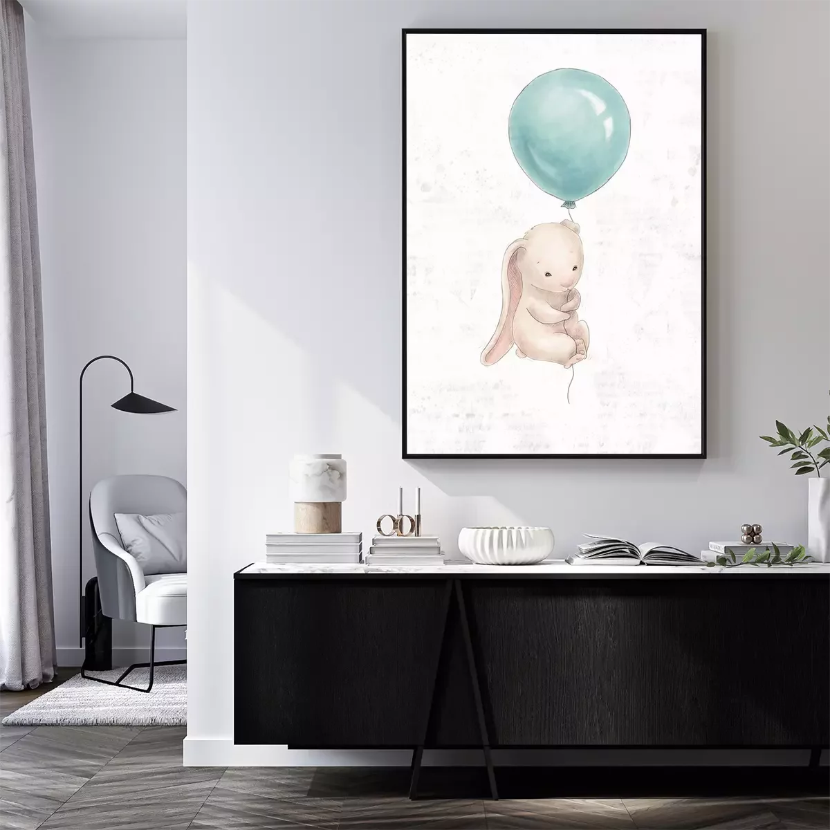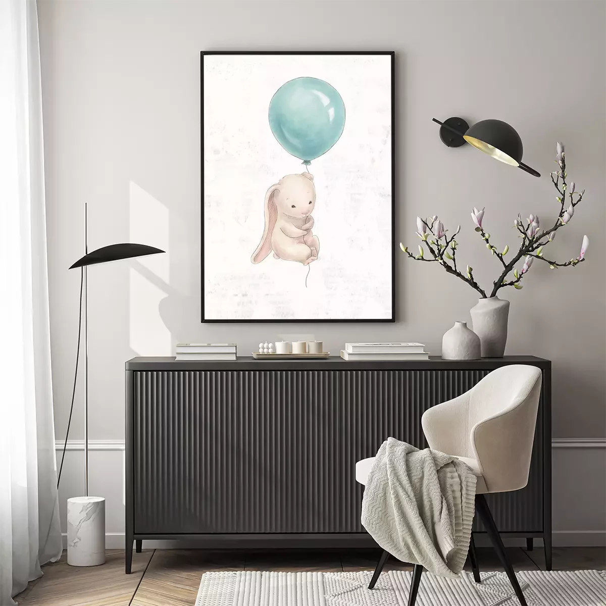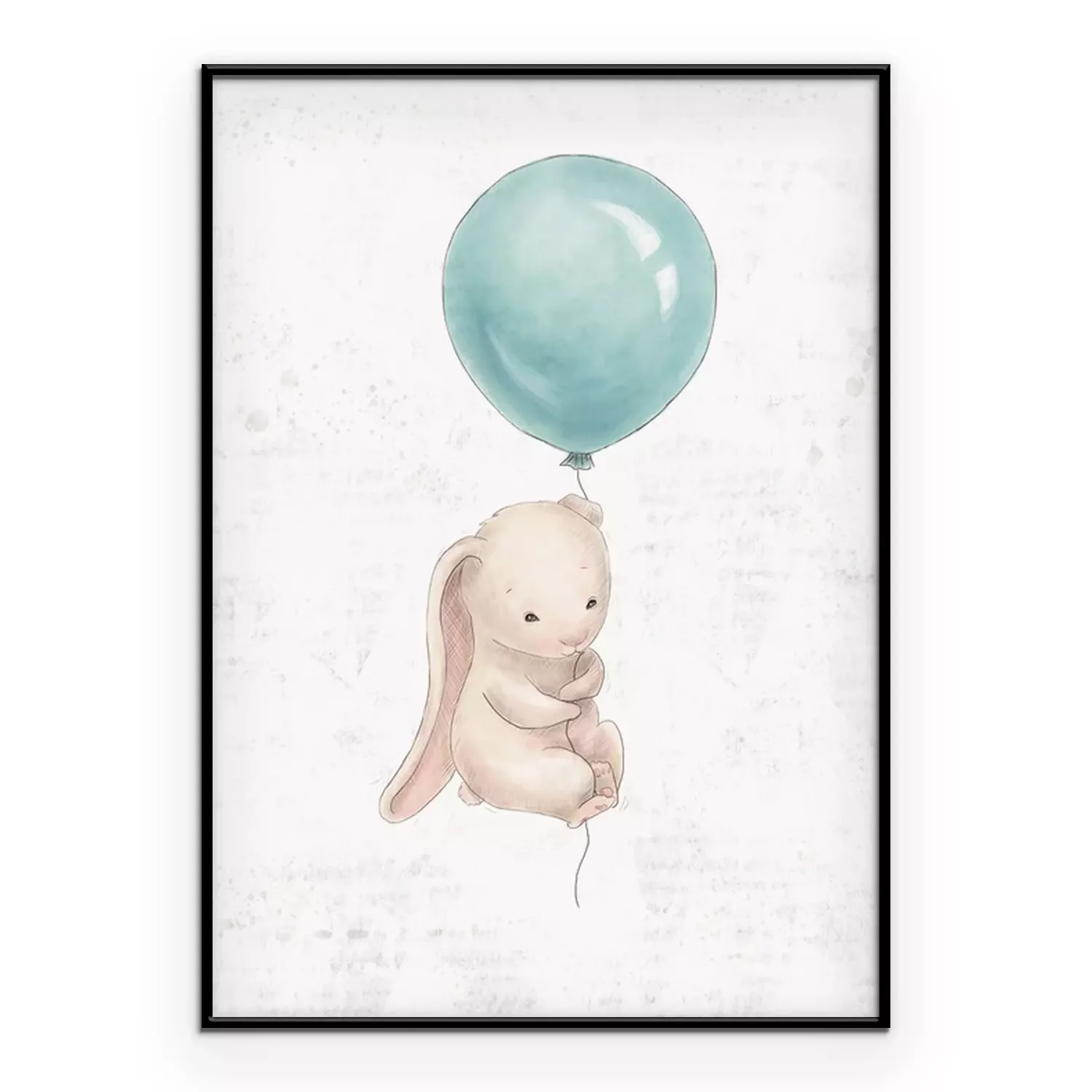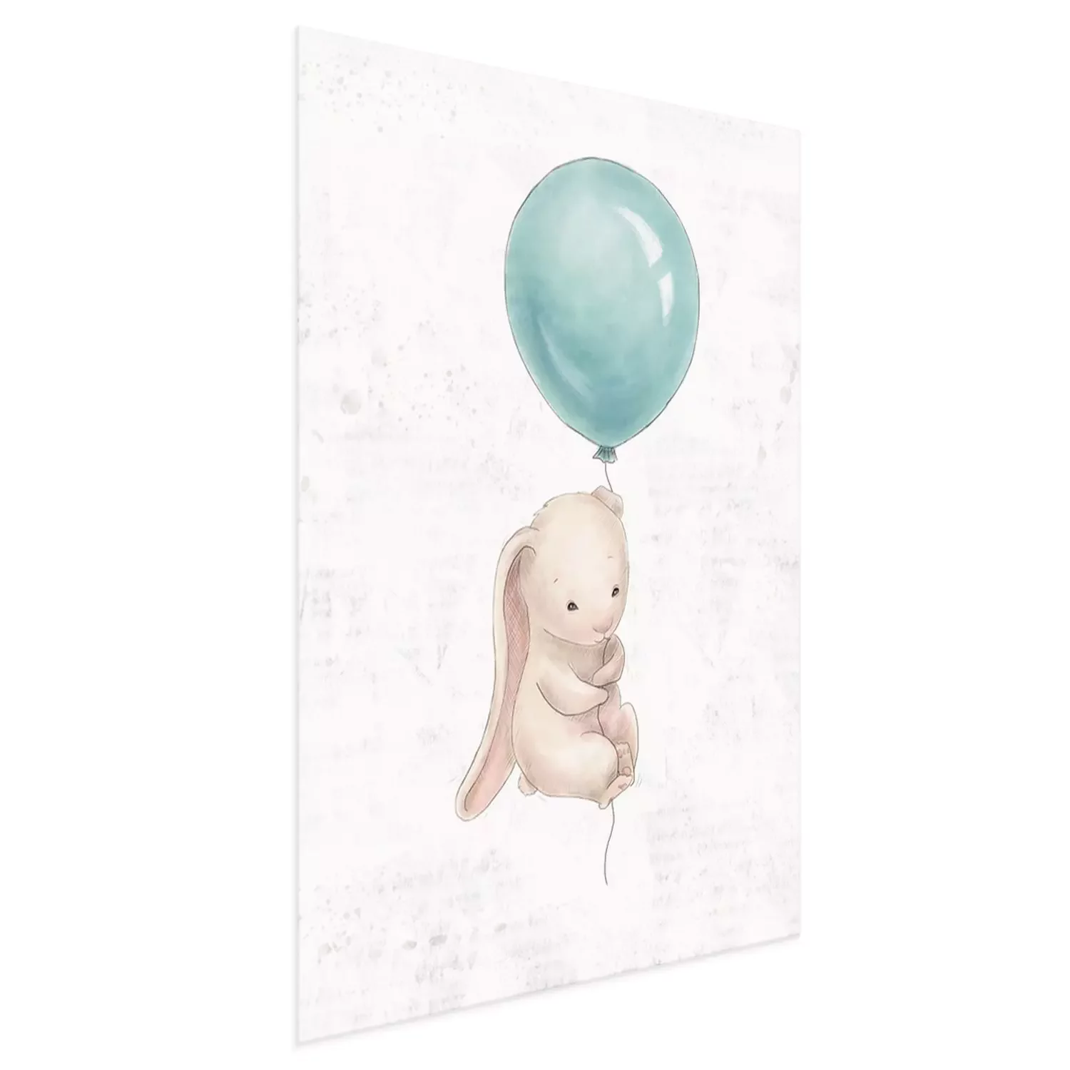 Poster: Beige konijntje vliegend op een blauwe ballon
