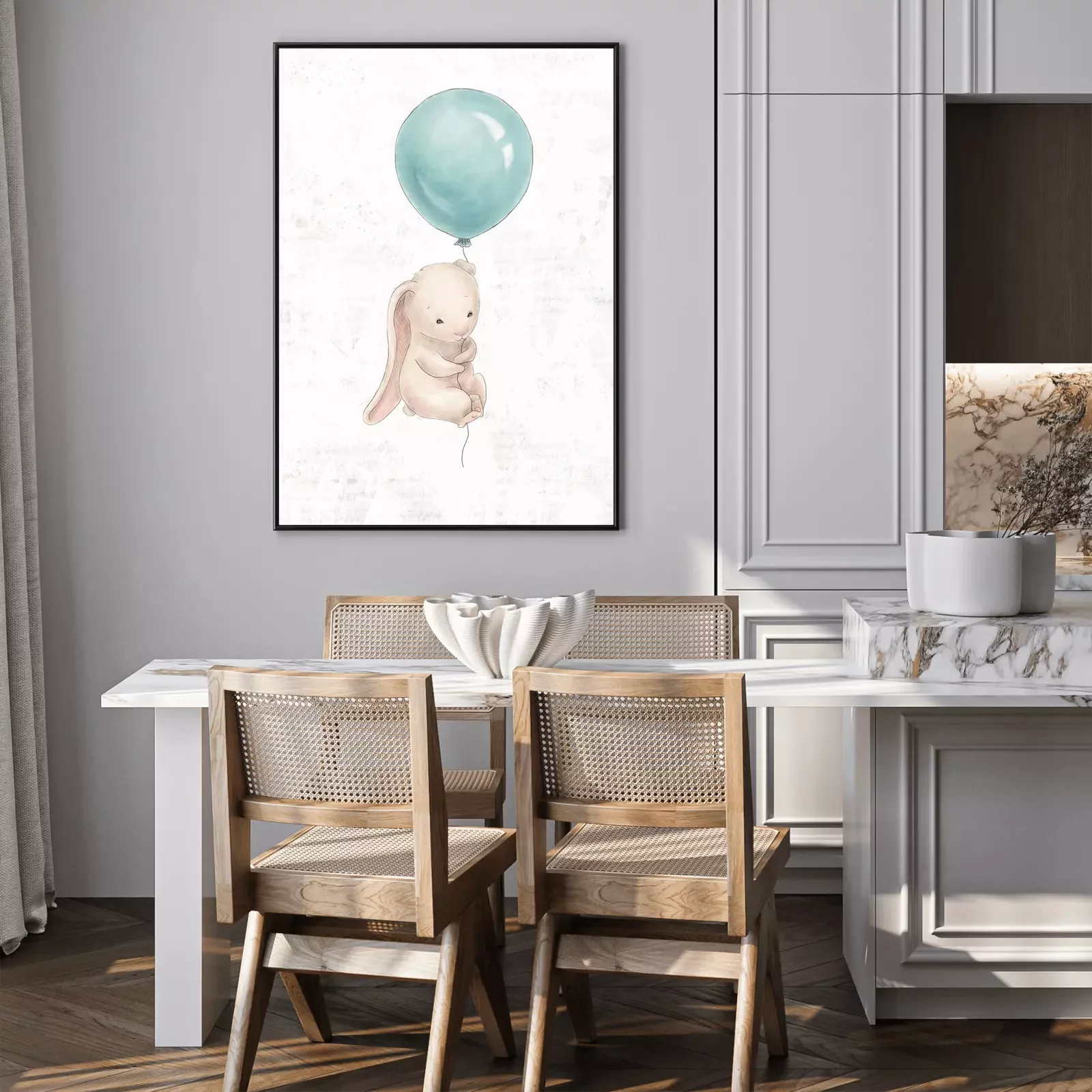 Poster Beige konijntje vliegend op een blauwe ballon