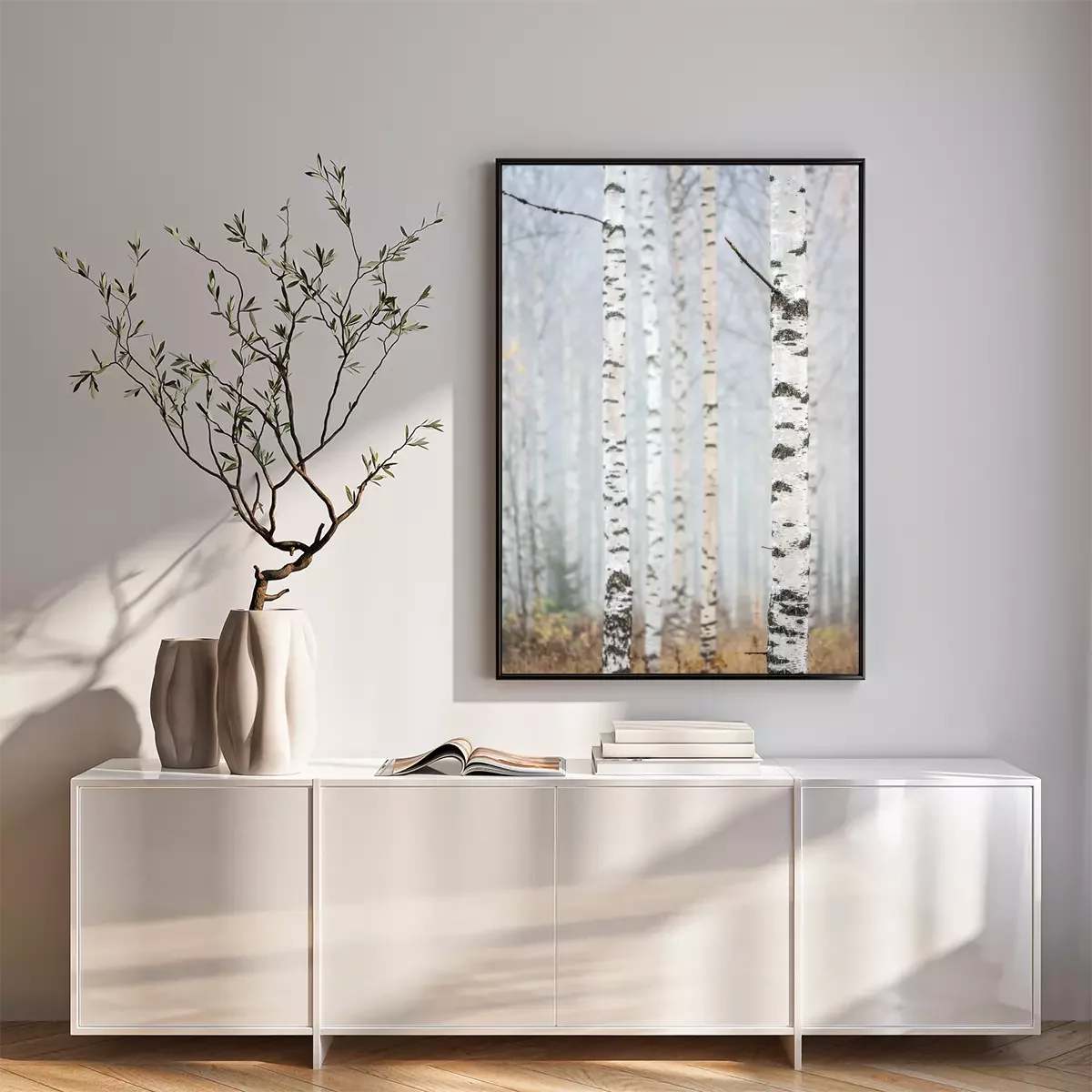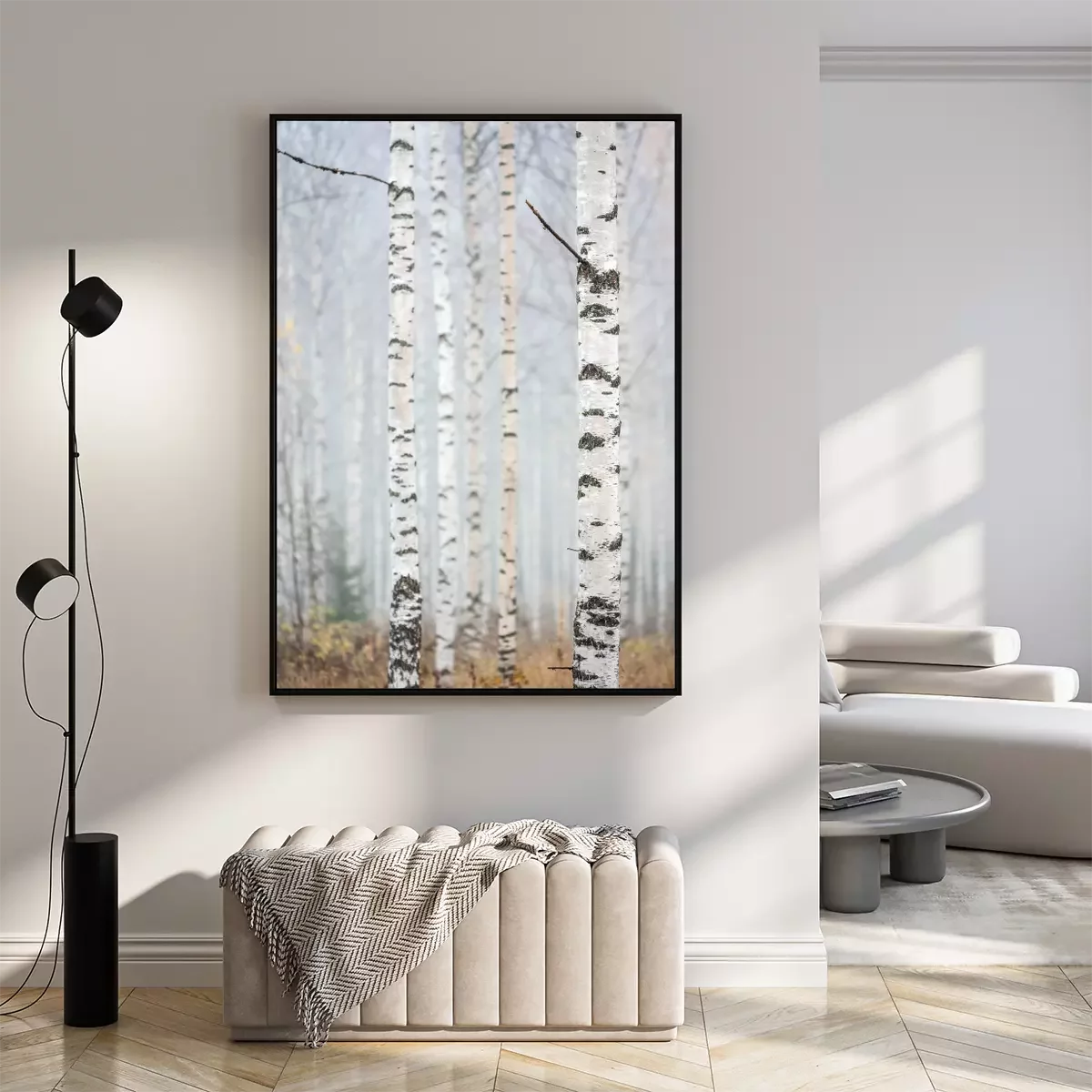 Birch forest in fog. Autumn view. Focus in foreground tree trunk.