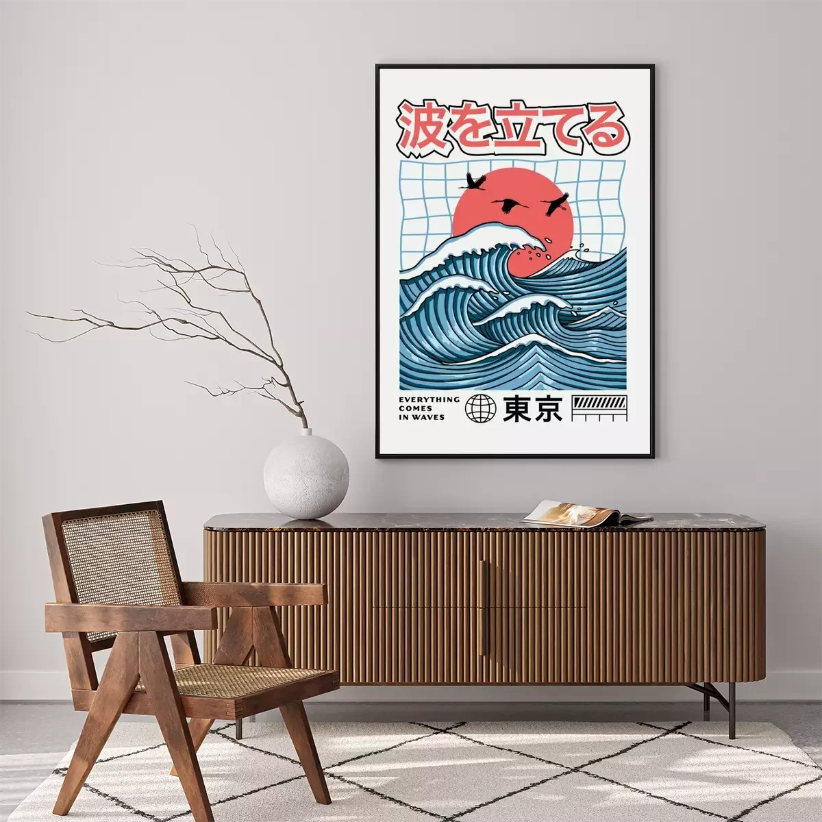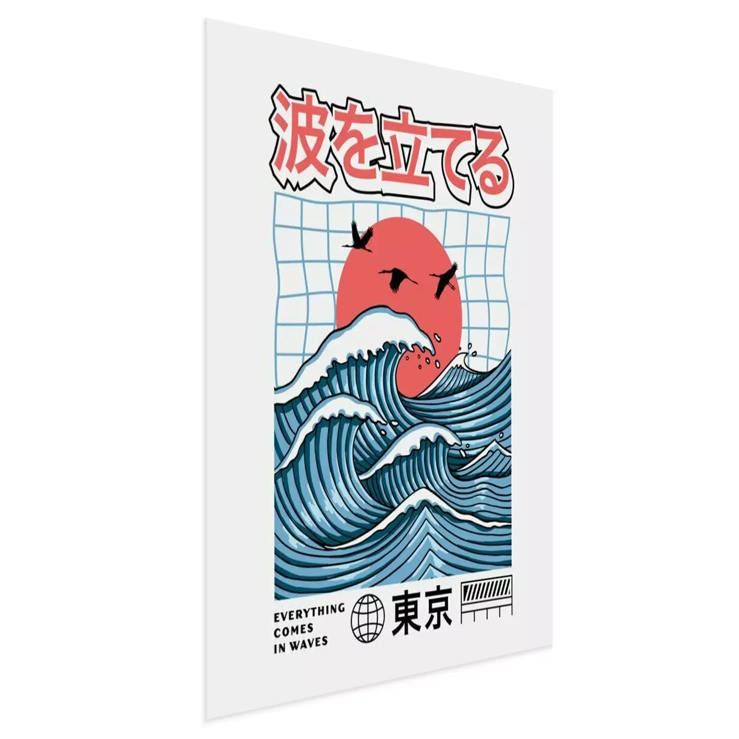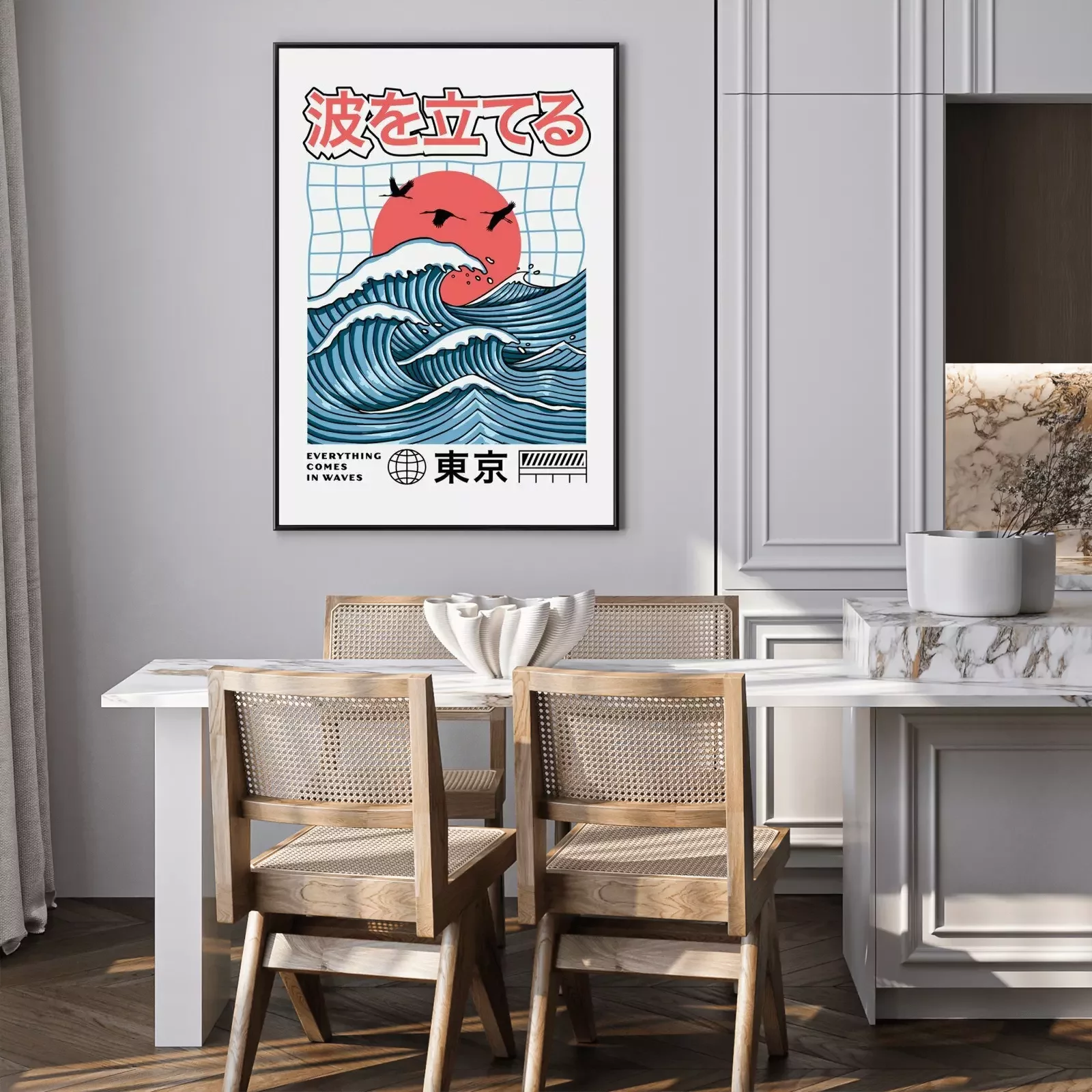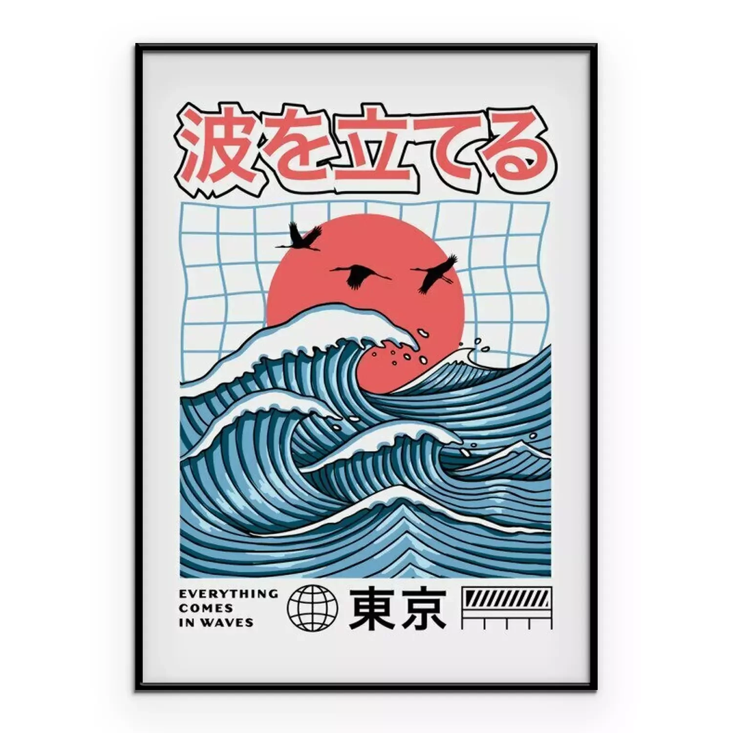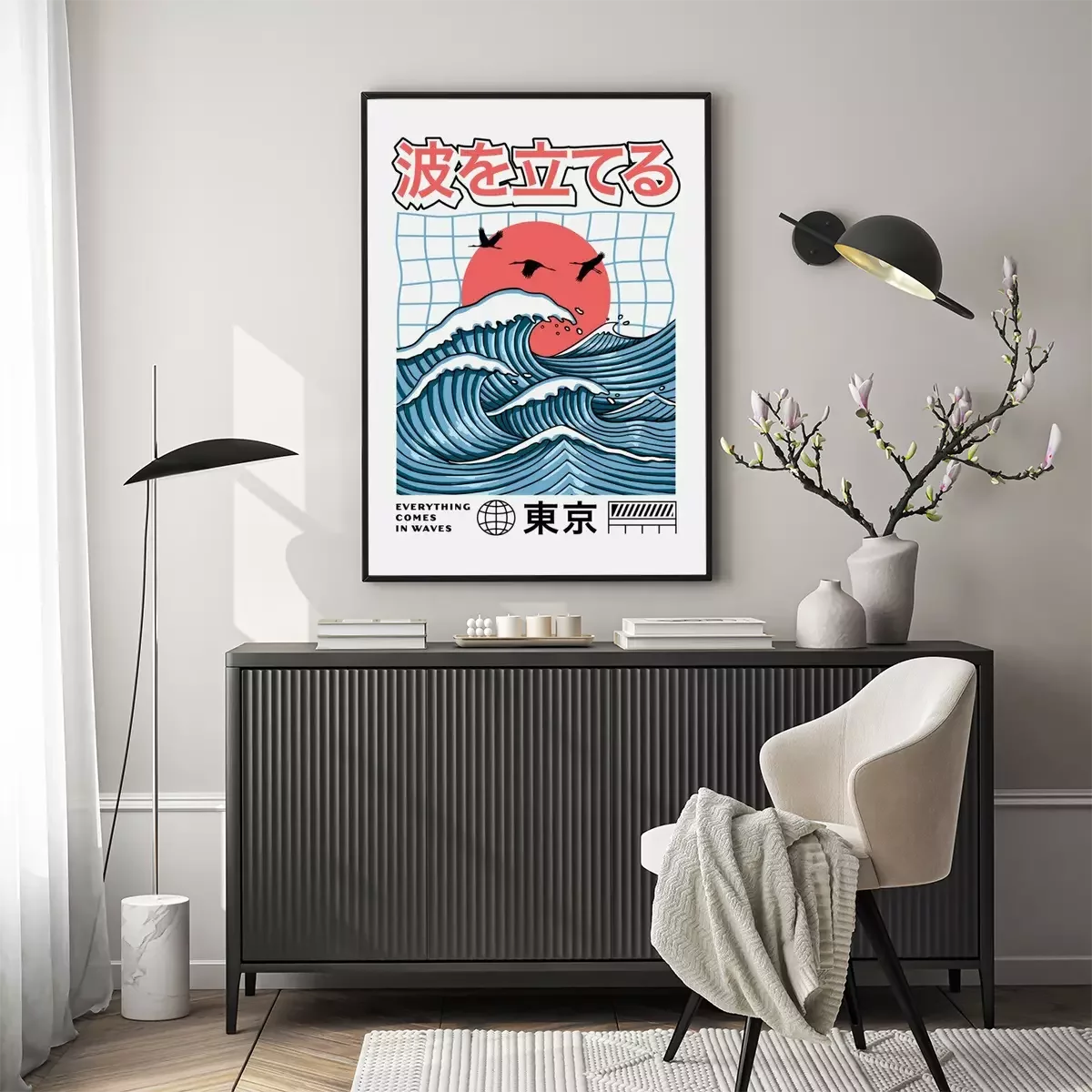 Poster Big waves with the red sun. Vector graphics for t-shirt prints, posters and other uses. Japanese text translation: Make Waves(above), Tokyo(below).