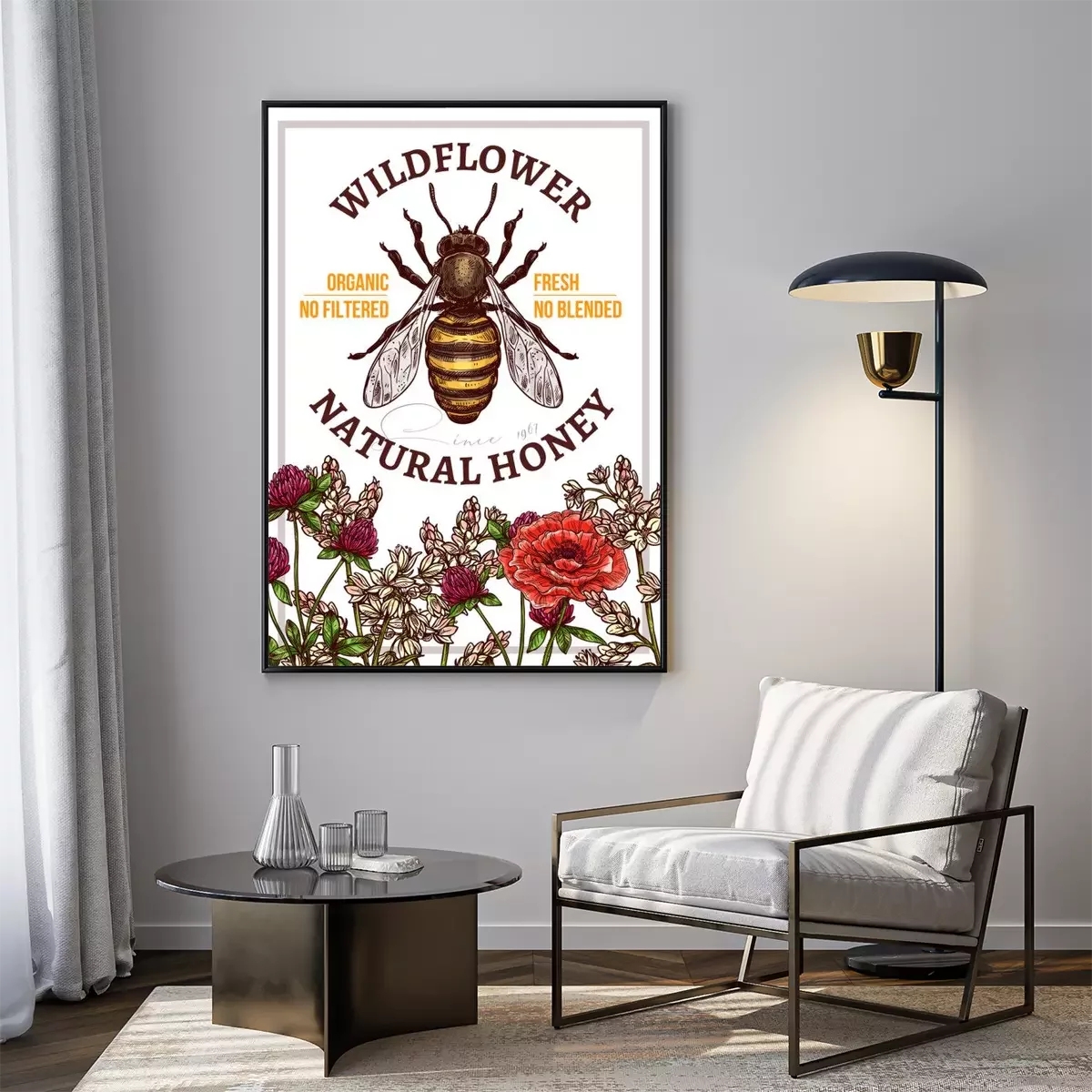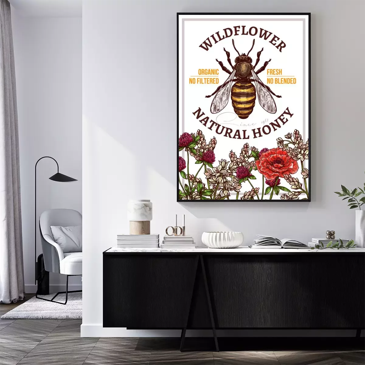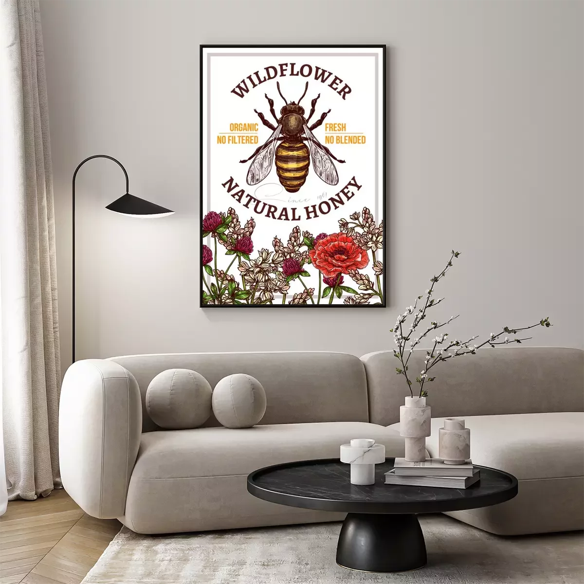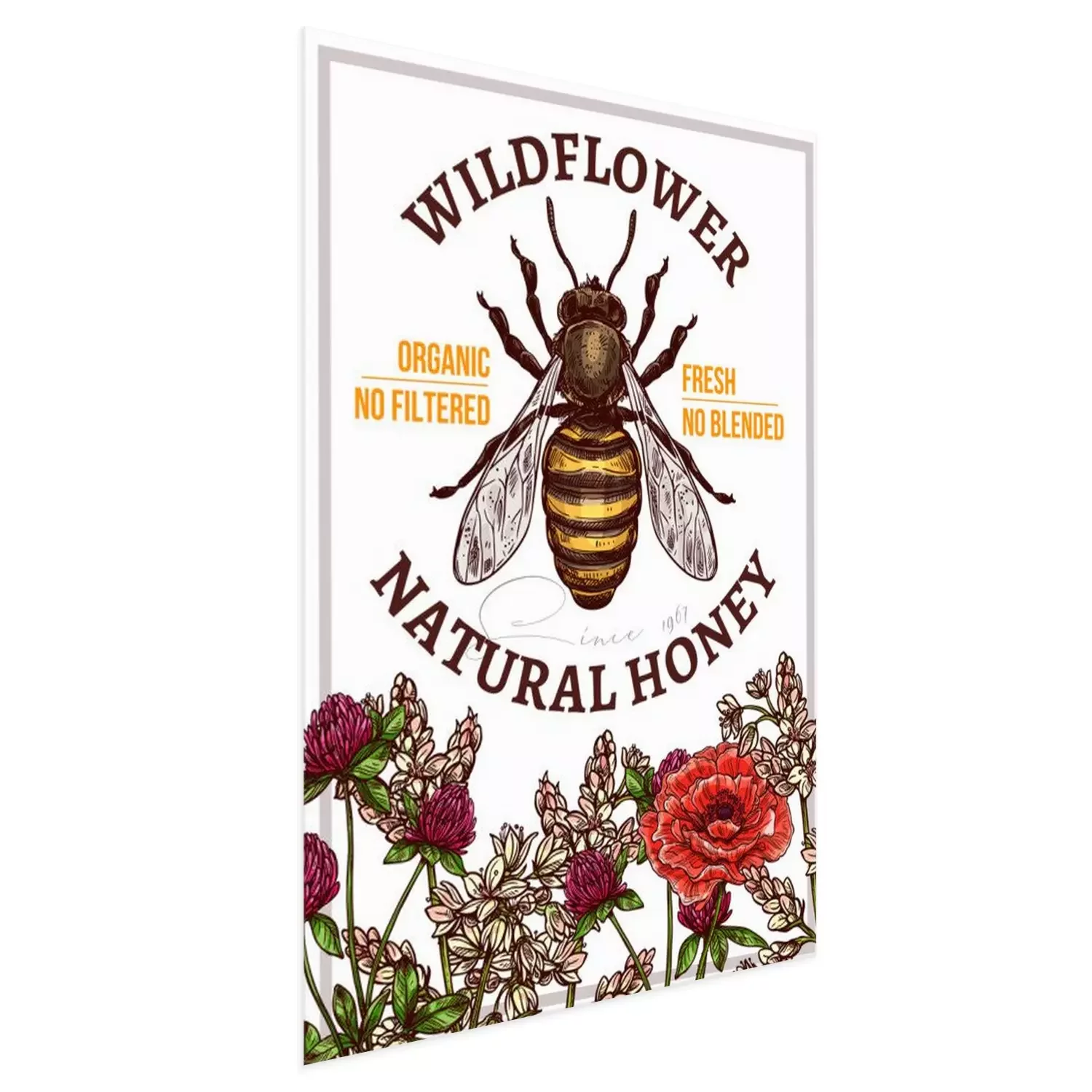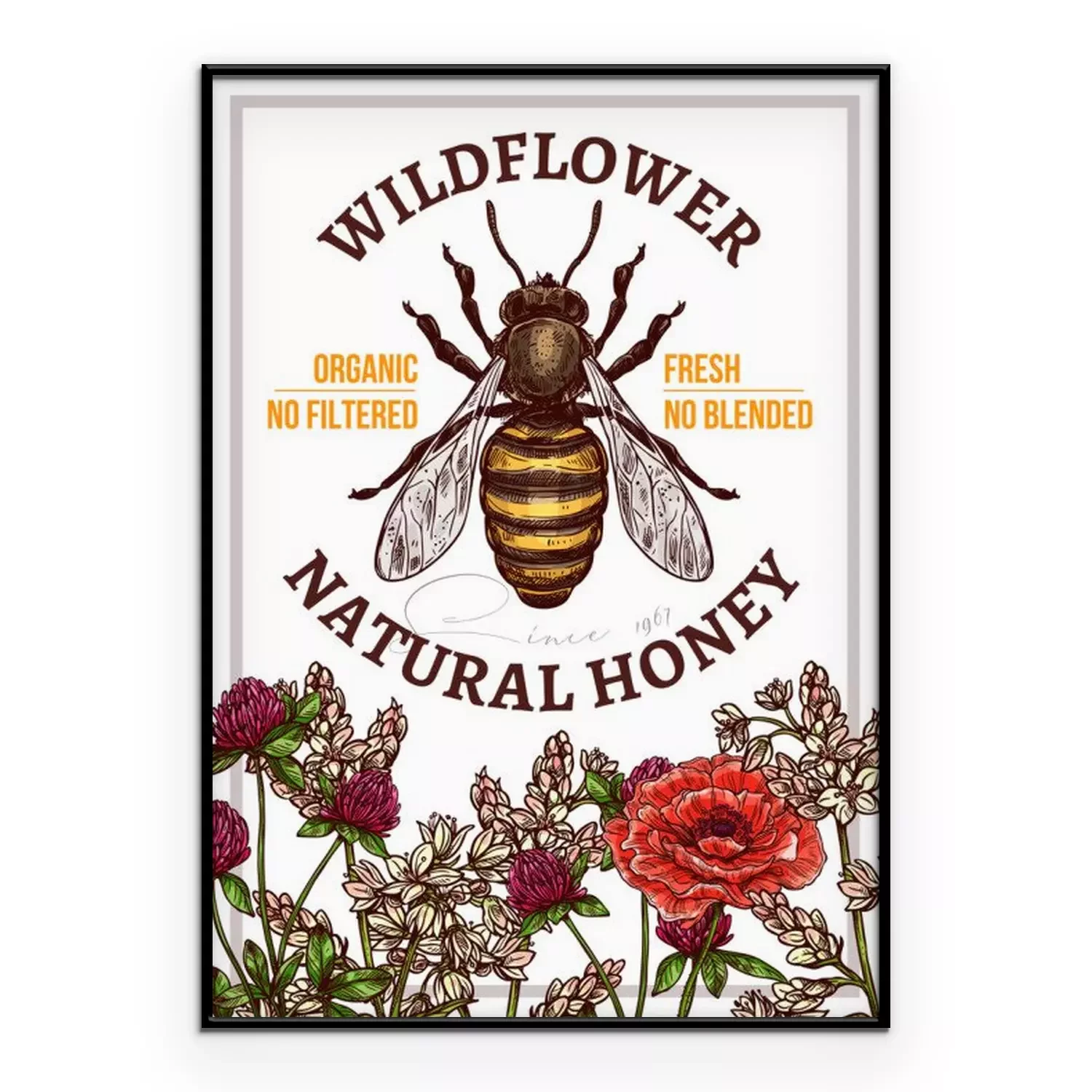 Poster: Bij, klaprozen en andere bloemen op de afbeelding