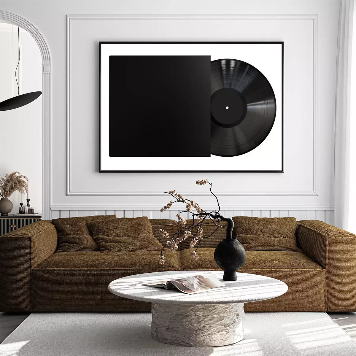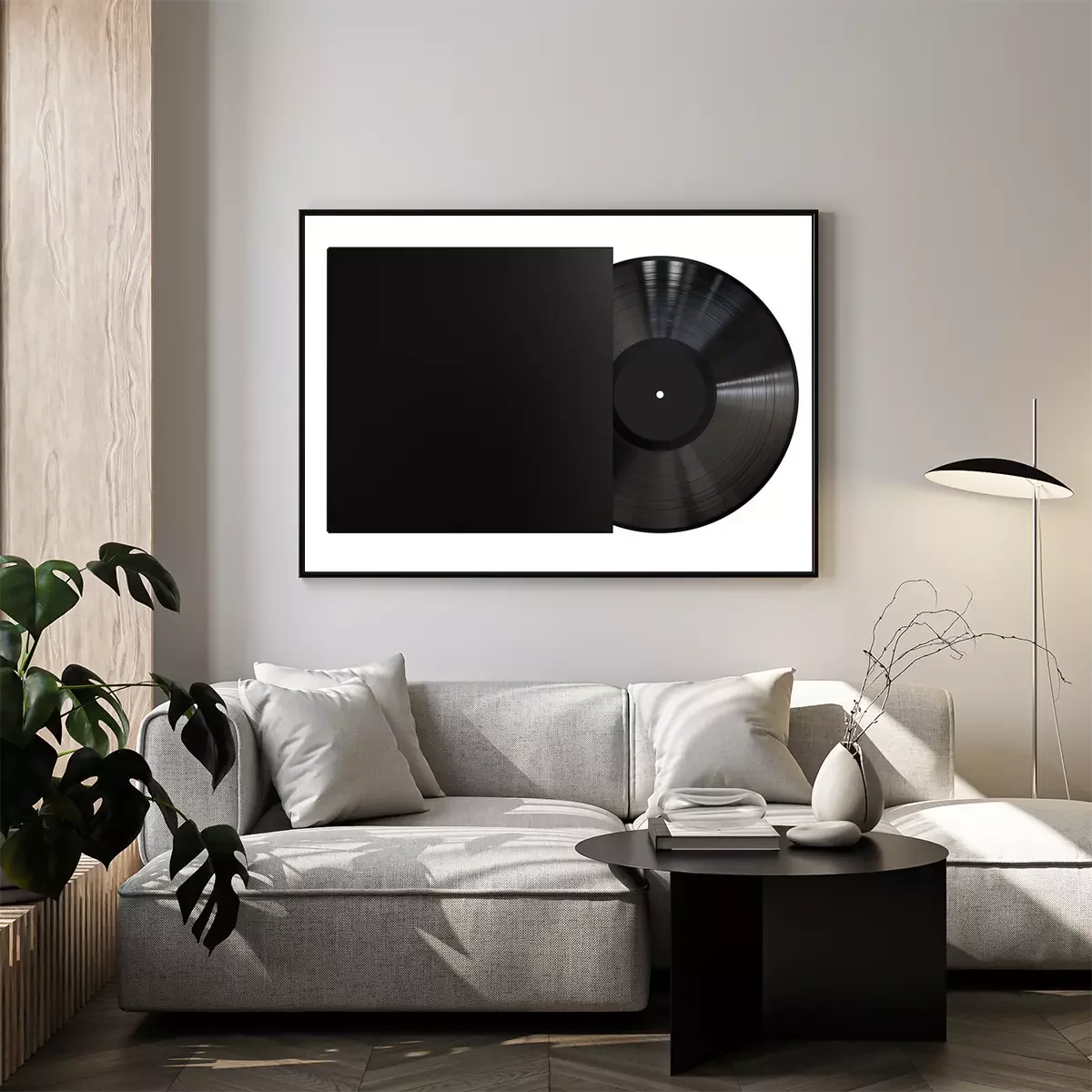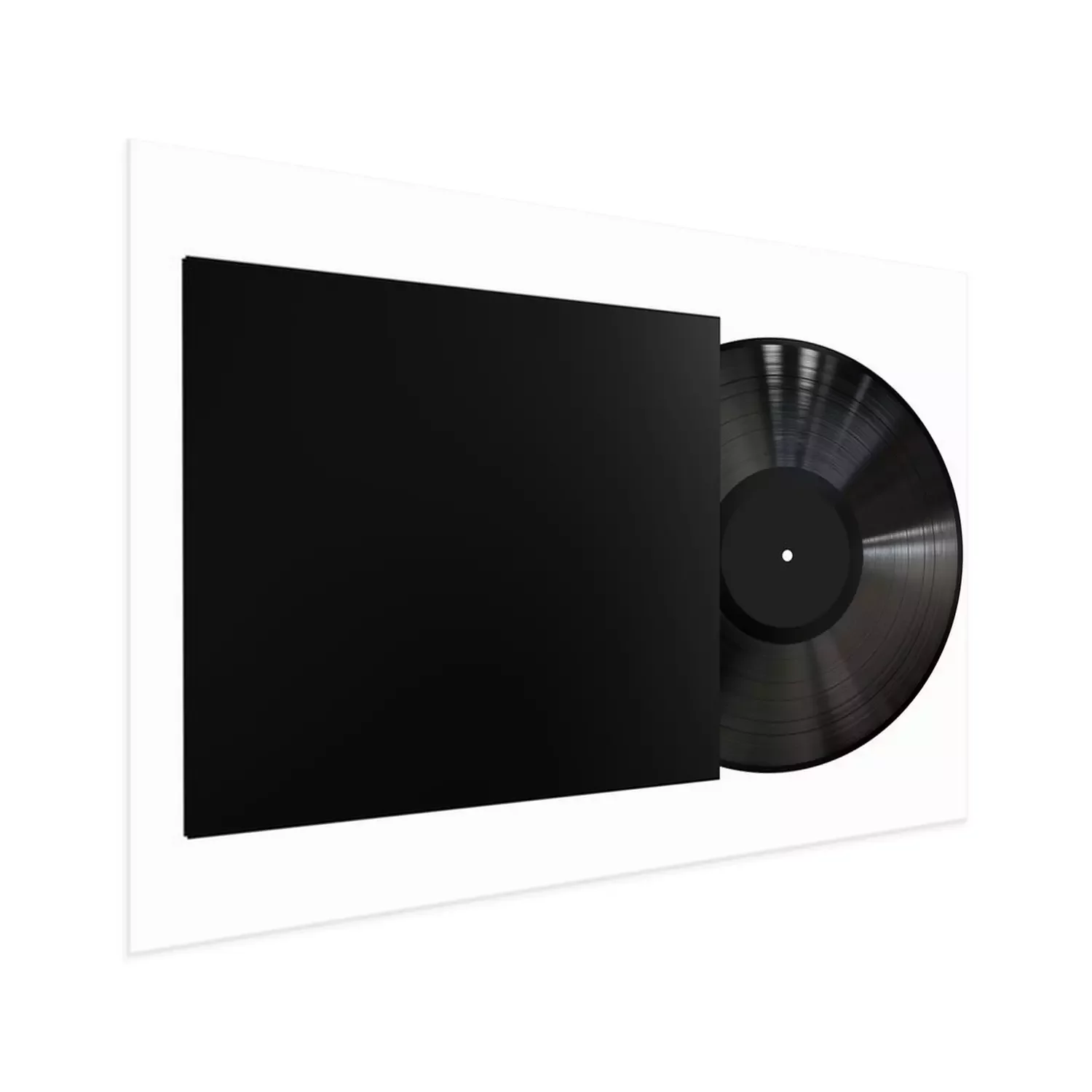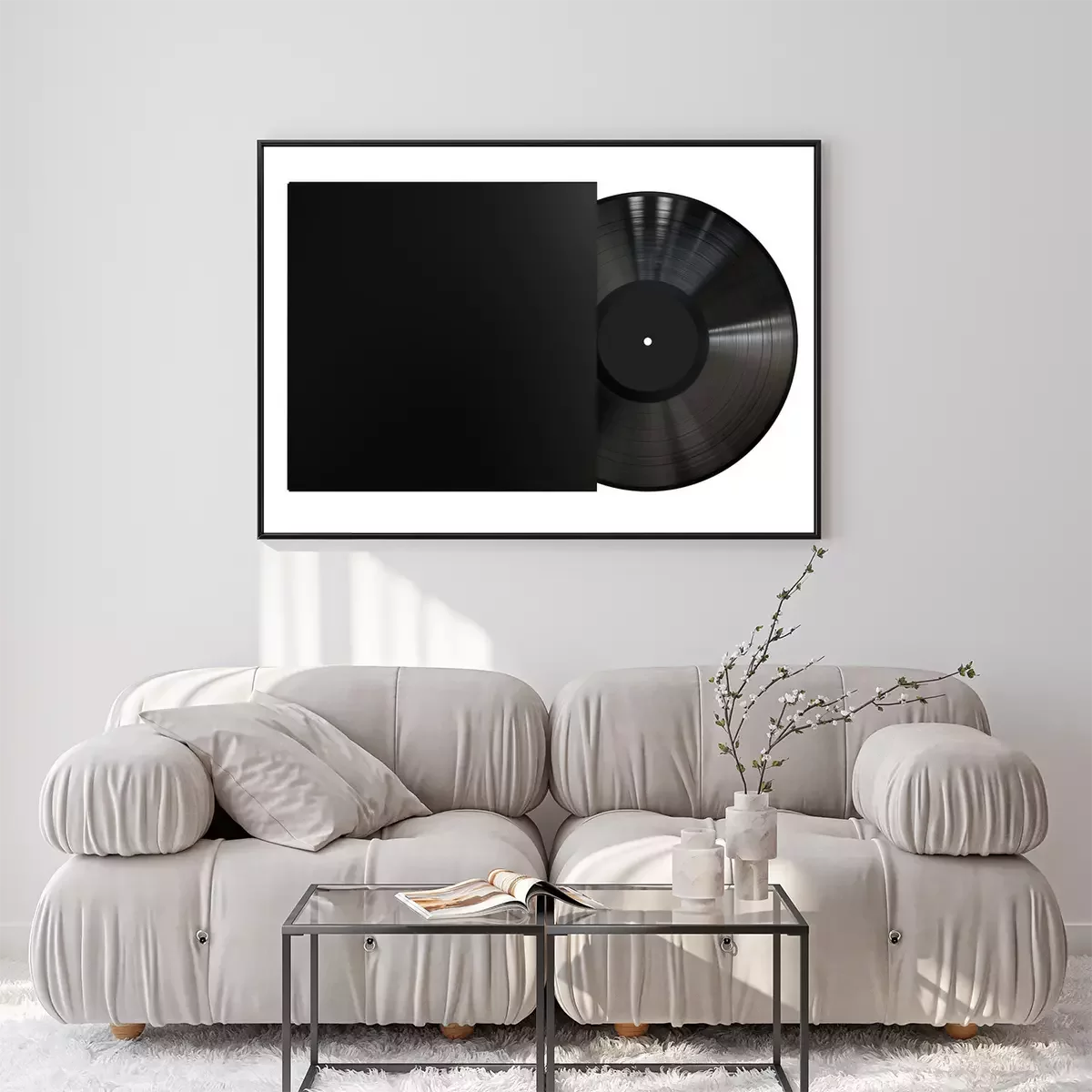 Poster: Black Vinyl Disc Record with Black Cover Sleeve and Black Label . 3D Render Isolated on White Background.