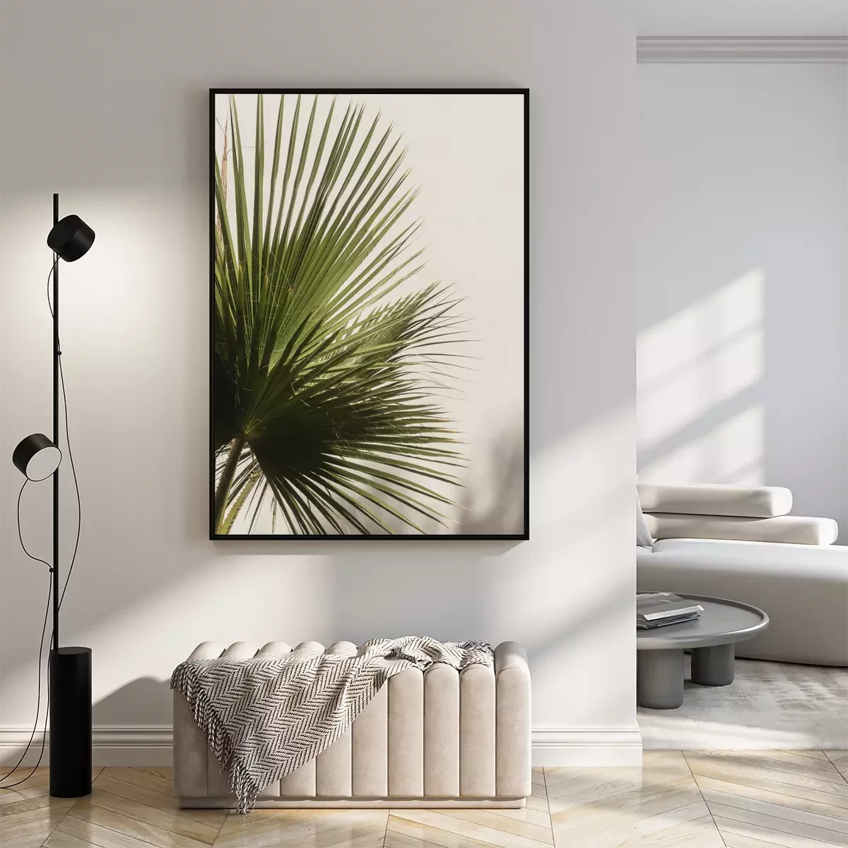 Palm leaf beautiful shadows on the wall. Creative, minimal, bright and airy styled concept.