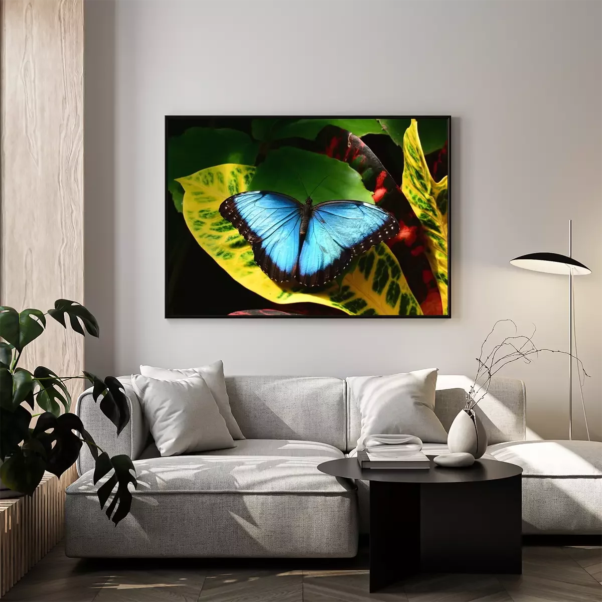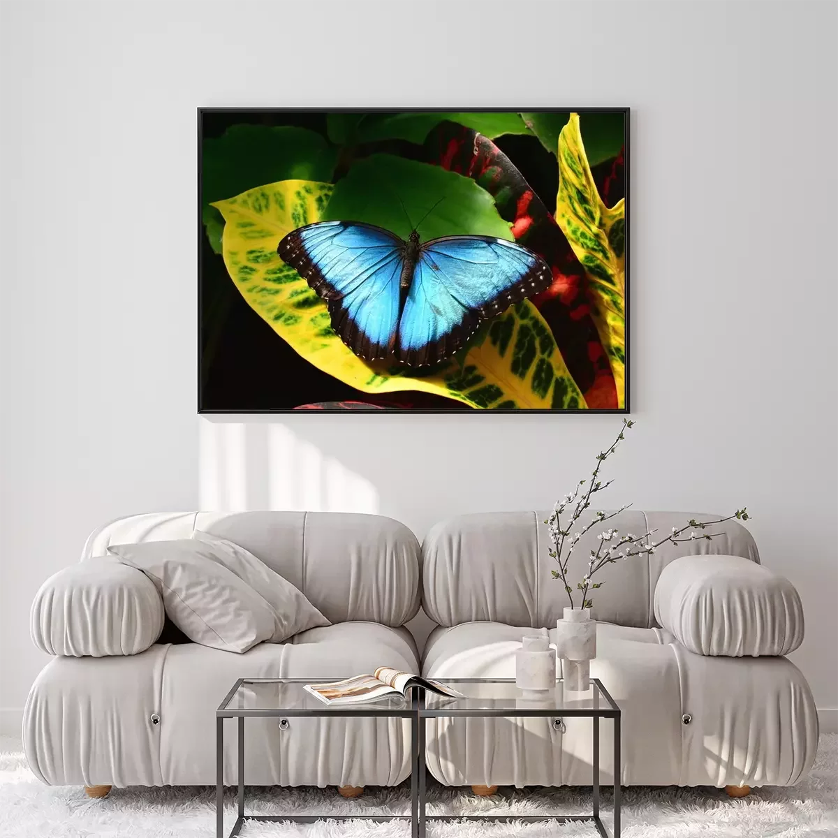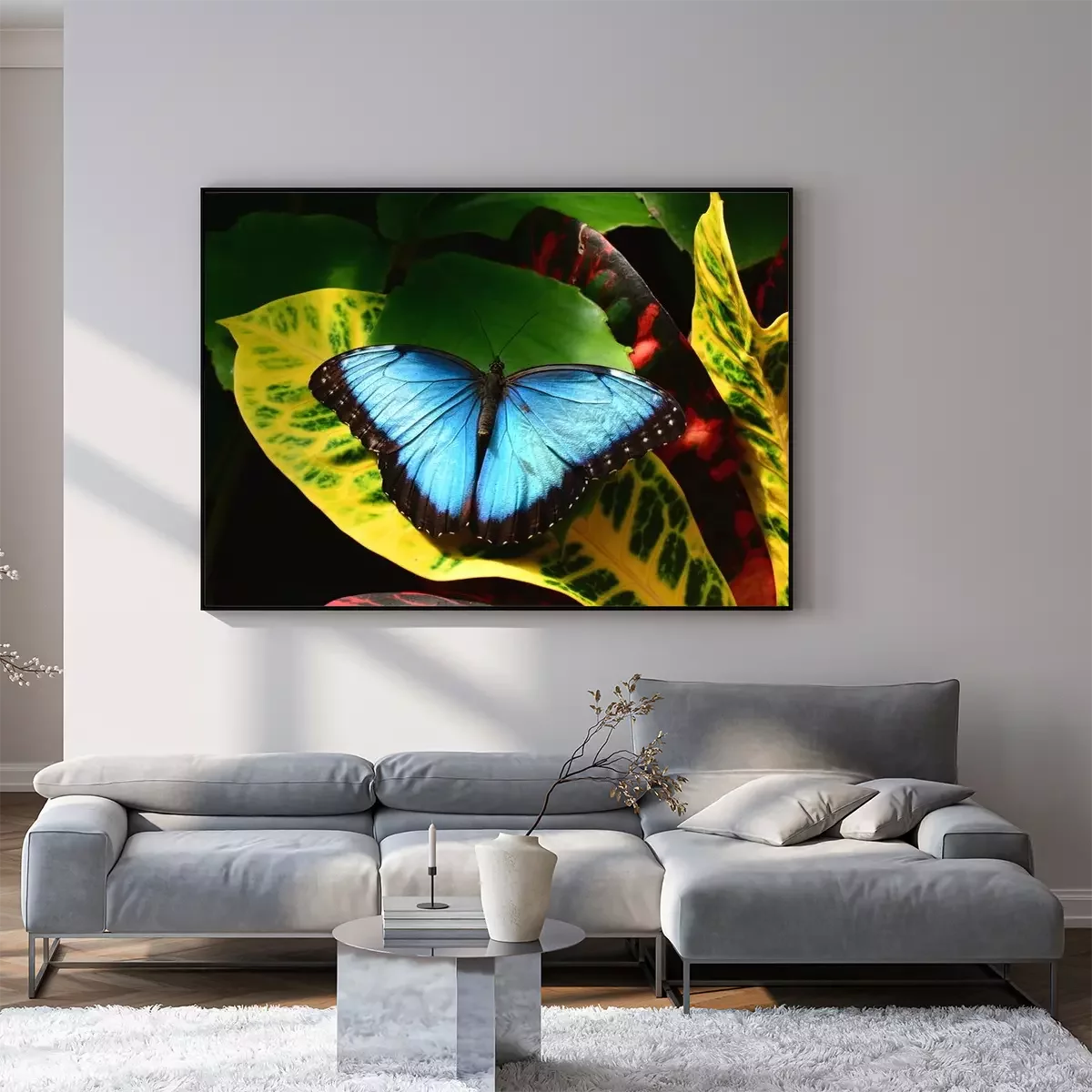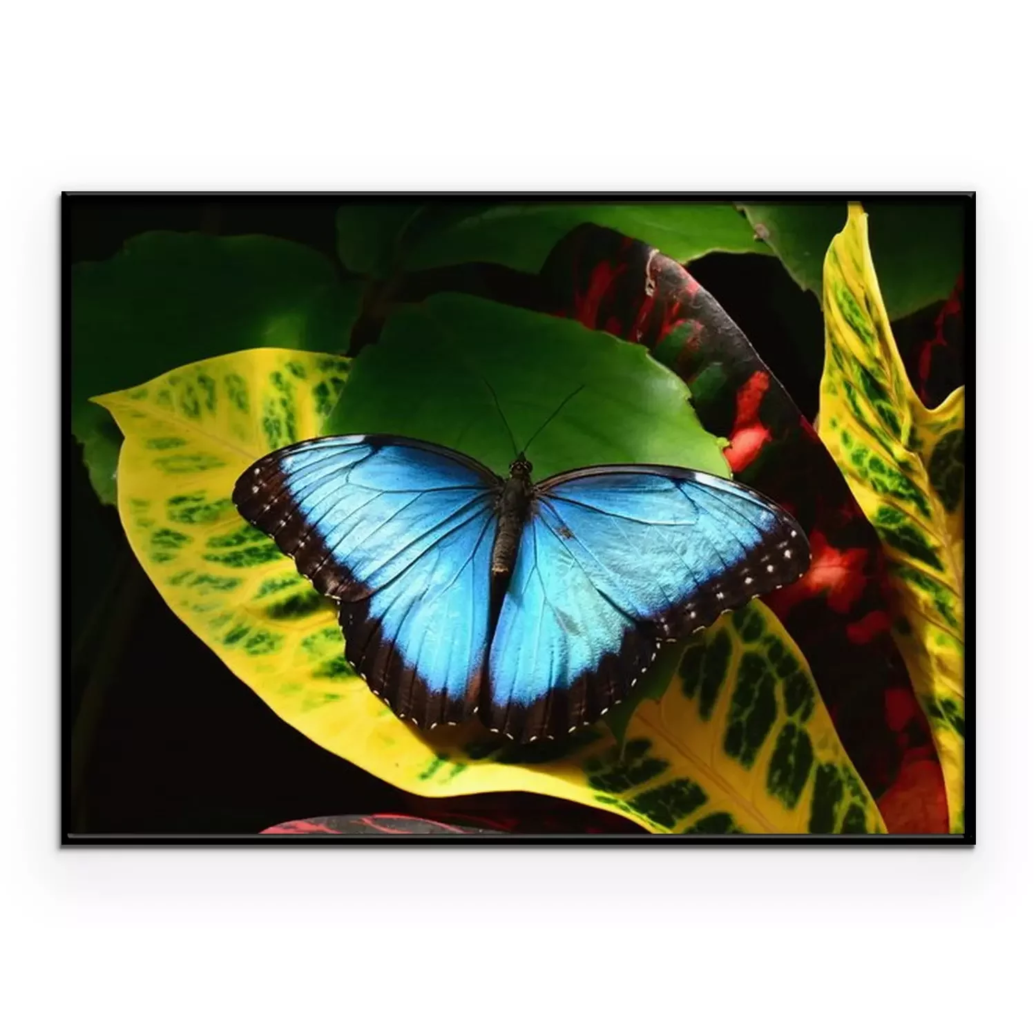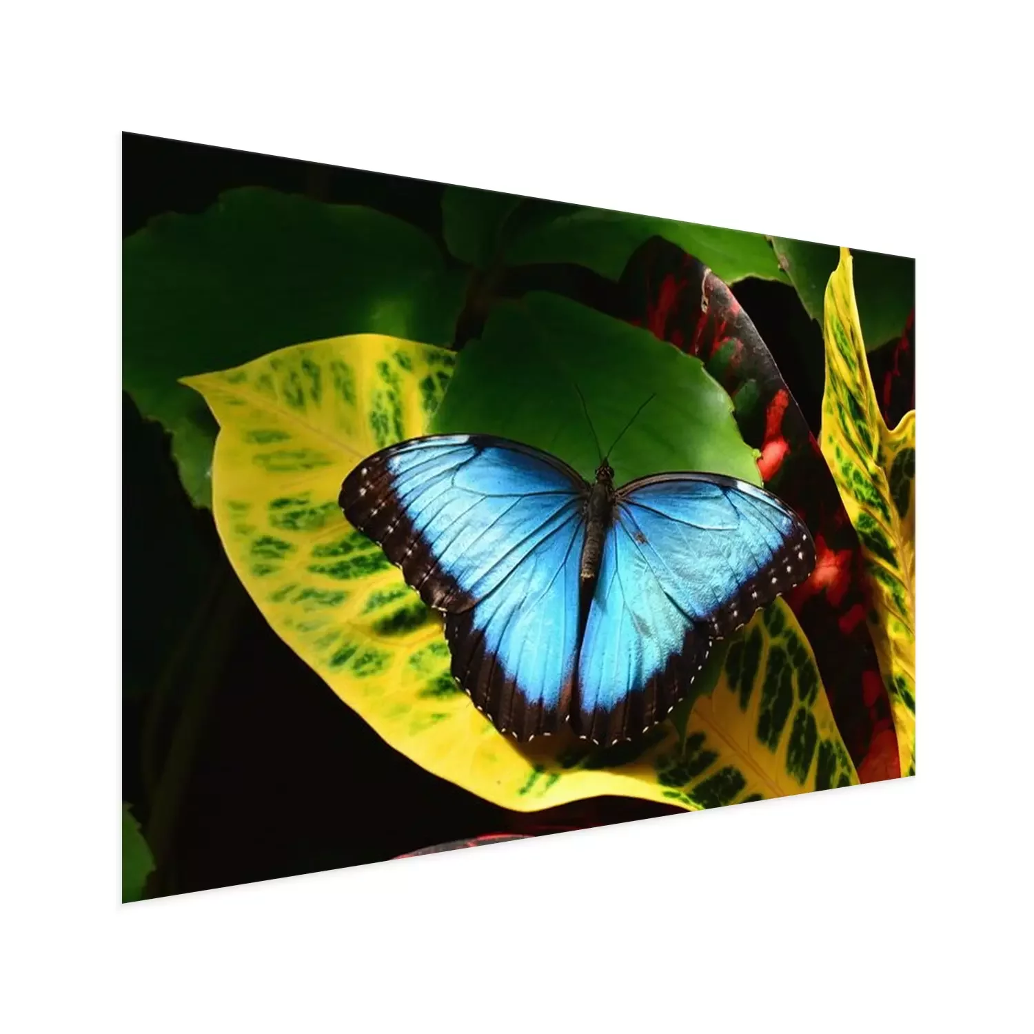 Poster: Blauwe vlinder op een blad