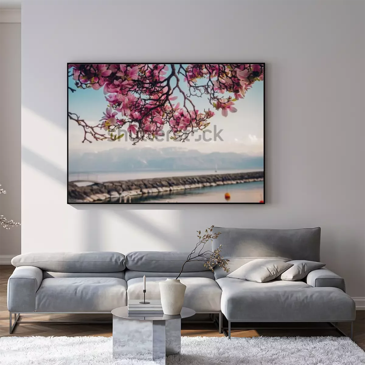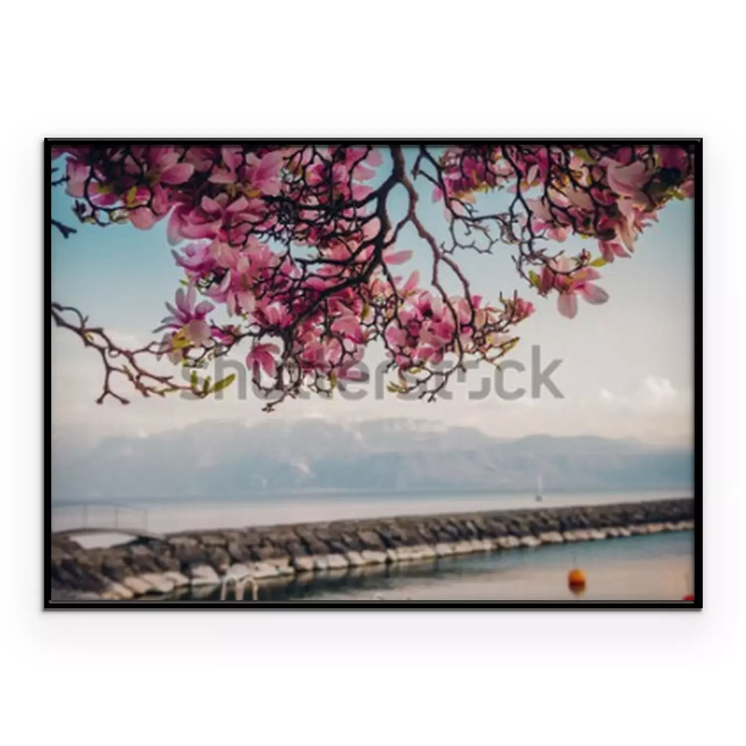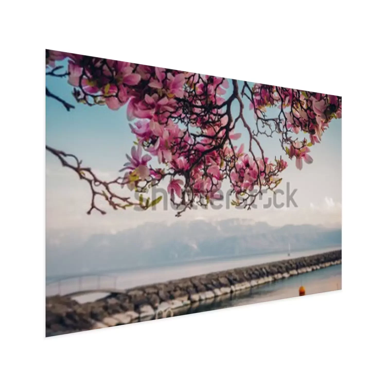 Poster: Bloeiende natuur tegen de achtergrond van wateren en bergen