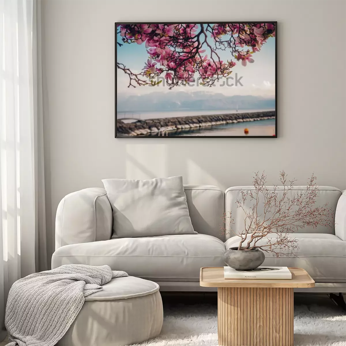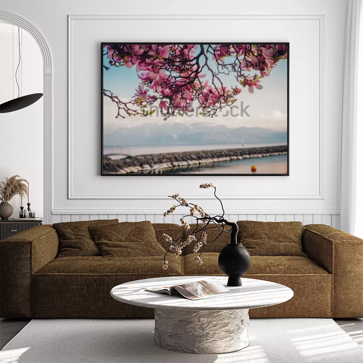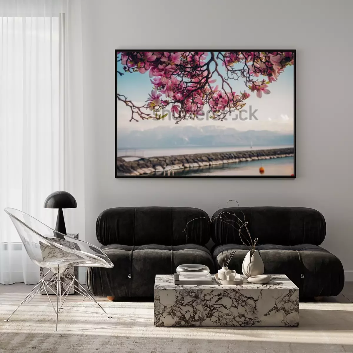 Poster: Bloeiende natuur tegen de achtergrond van wateren en bergen