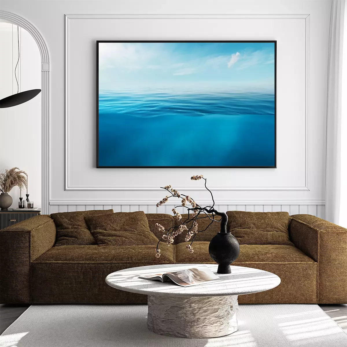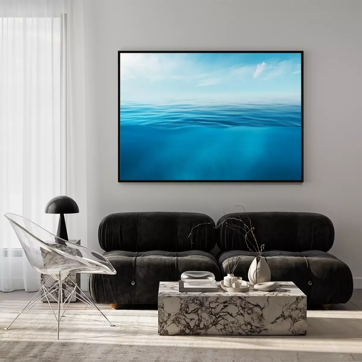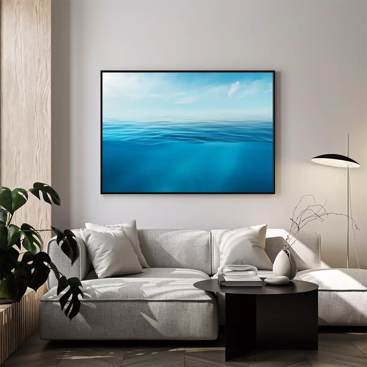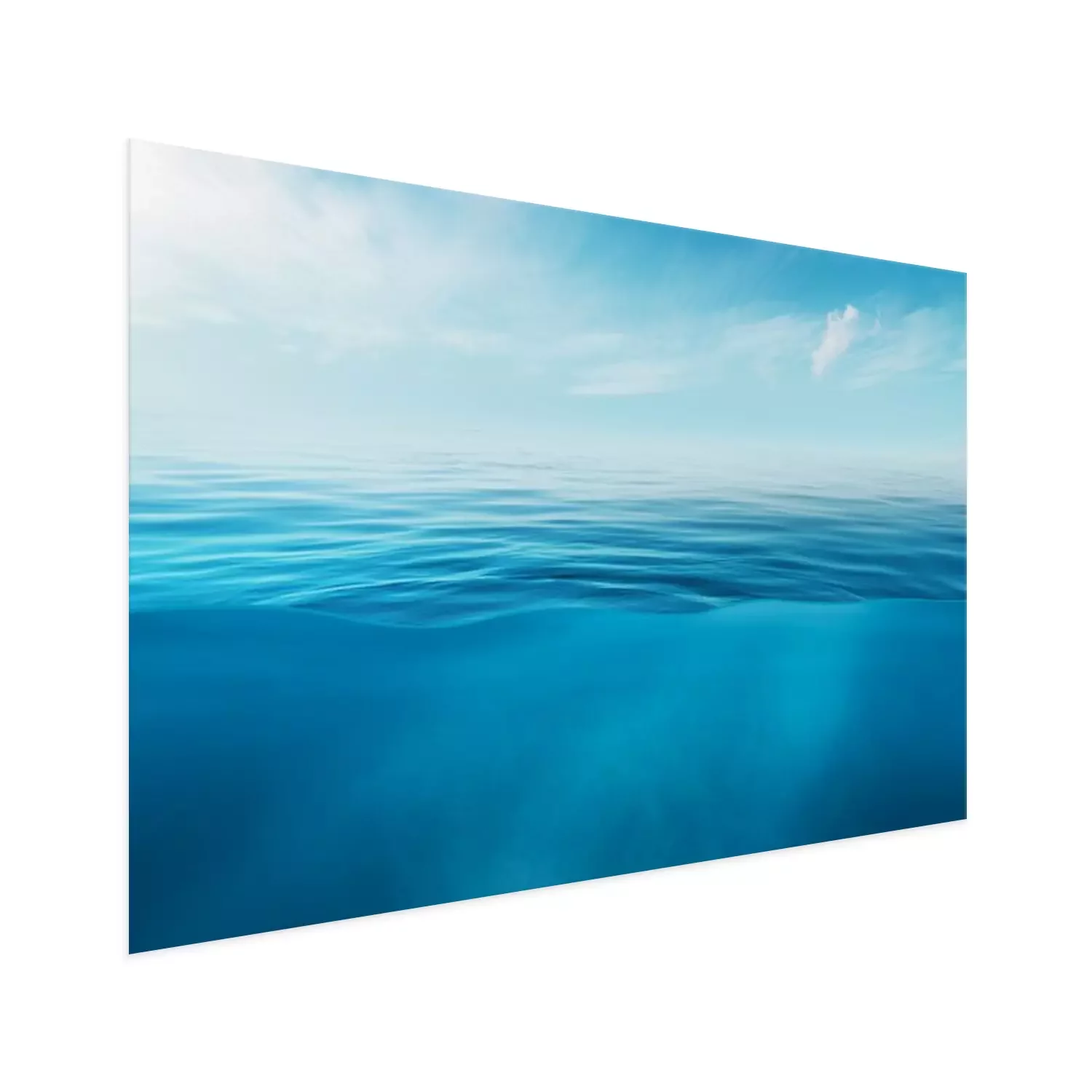 Poster Blue sea or ocean water surface and underwater with sunny and cloudy sky