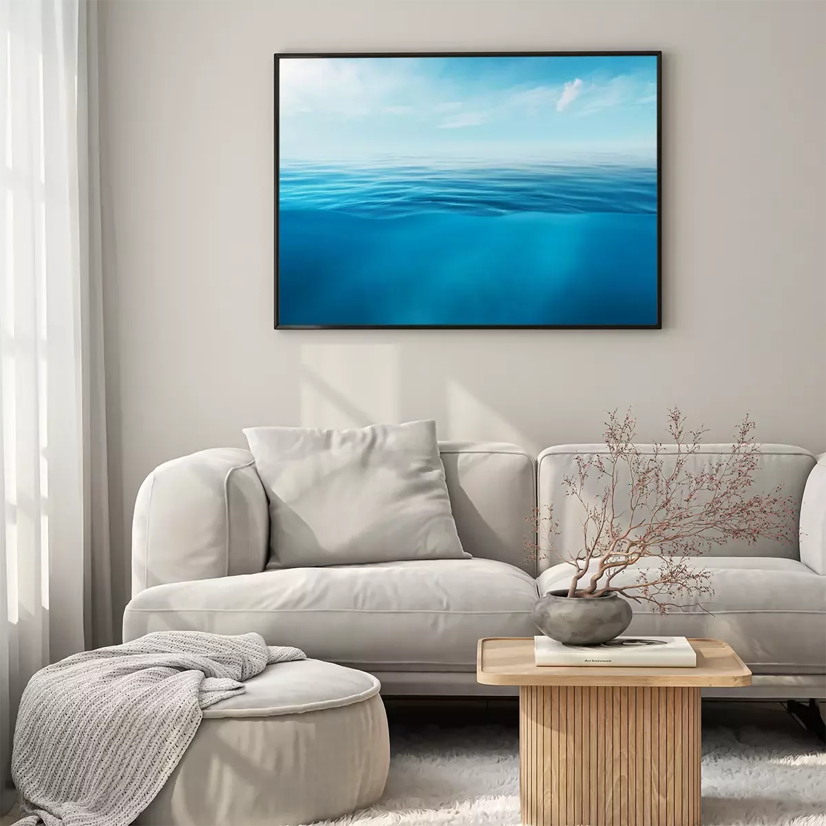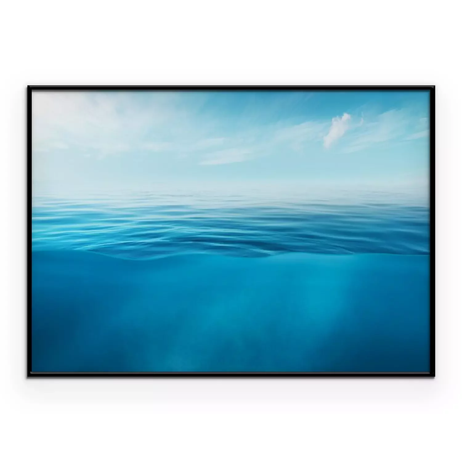 Poster: Blue sea or ocean water surface and underwater with sunny and cloudy sky