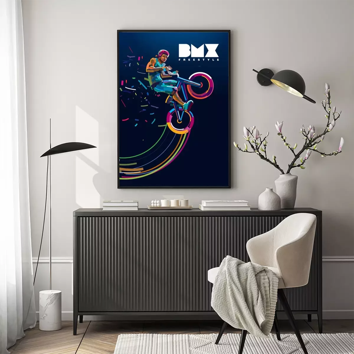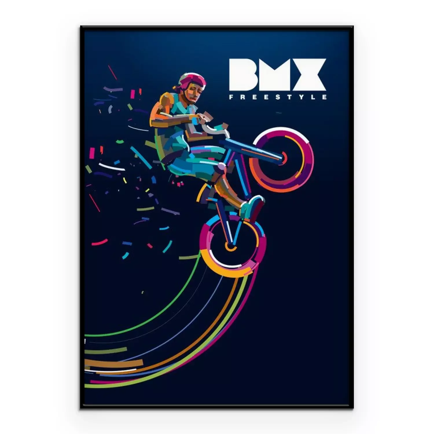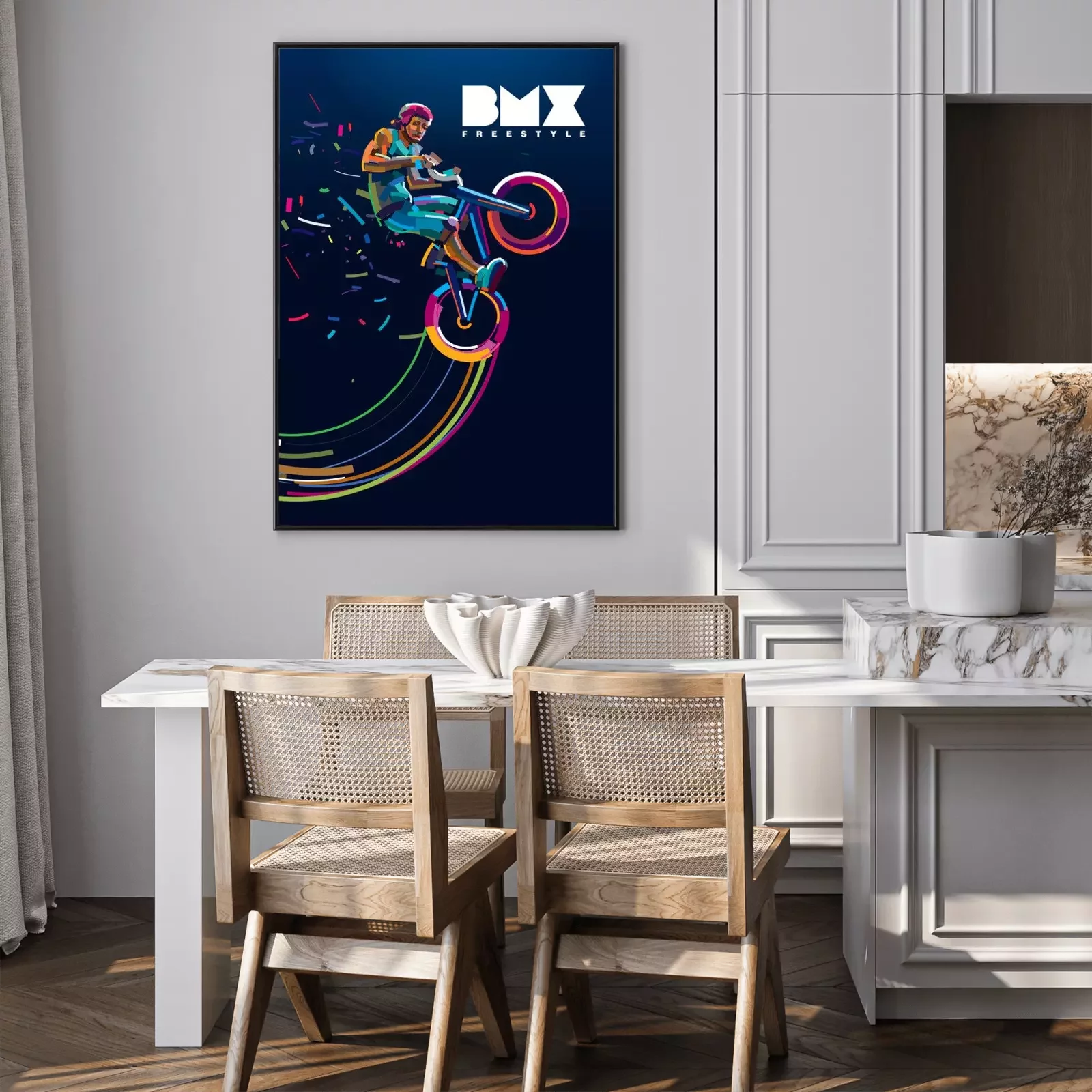 Poster: bmx. Fietser in een sprong. Poster in een digitaal schilderij.