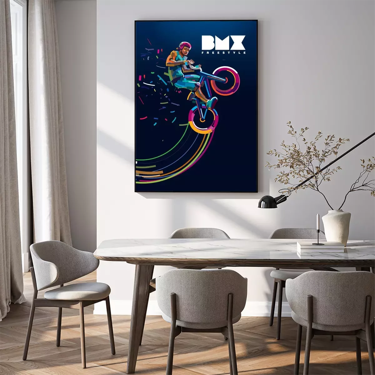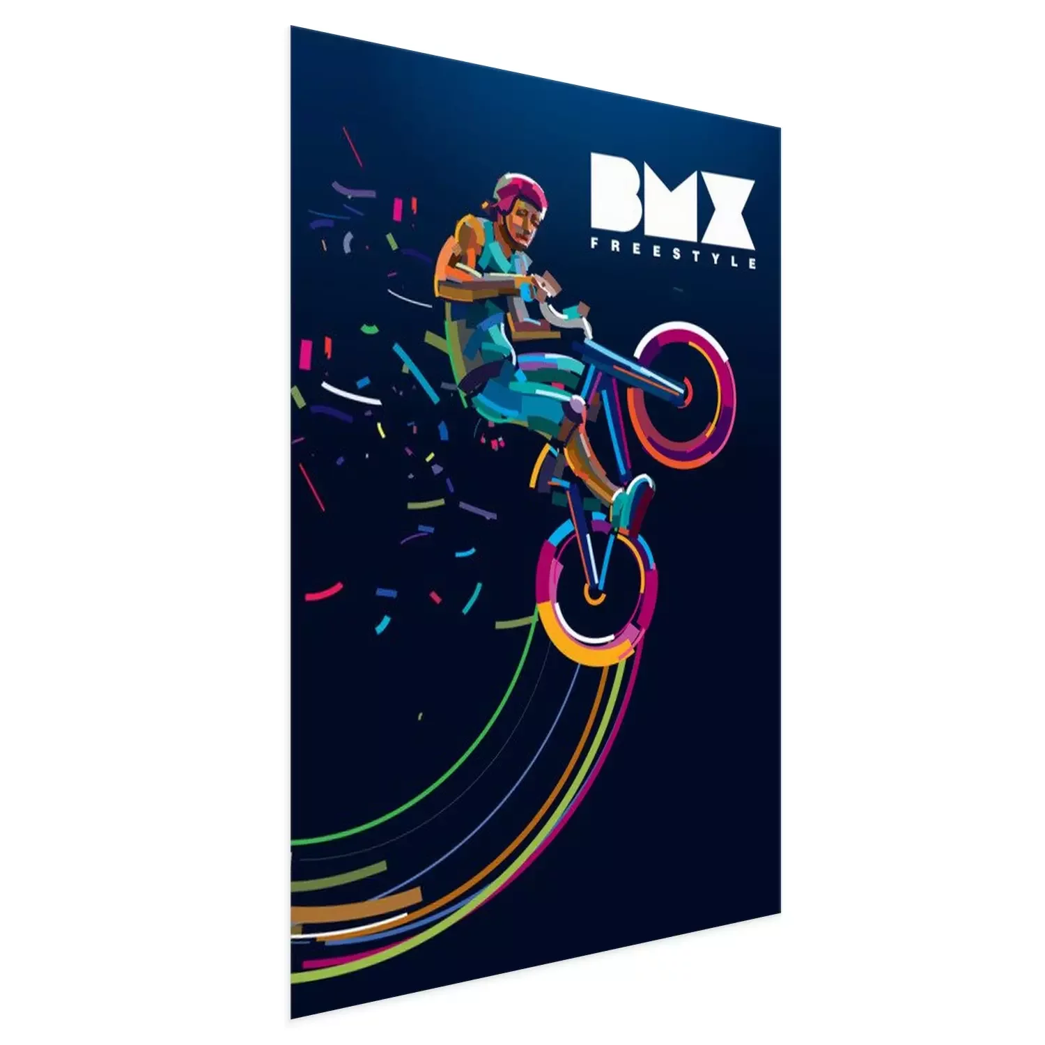 Poster bmx. Fietser in een sprong. Poster in een digitaal schilderij.