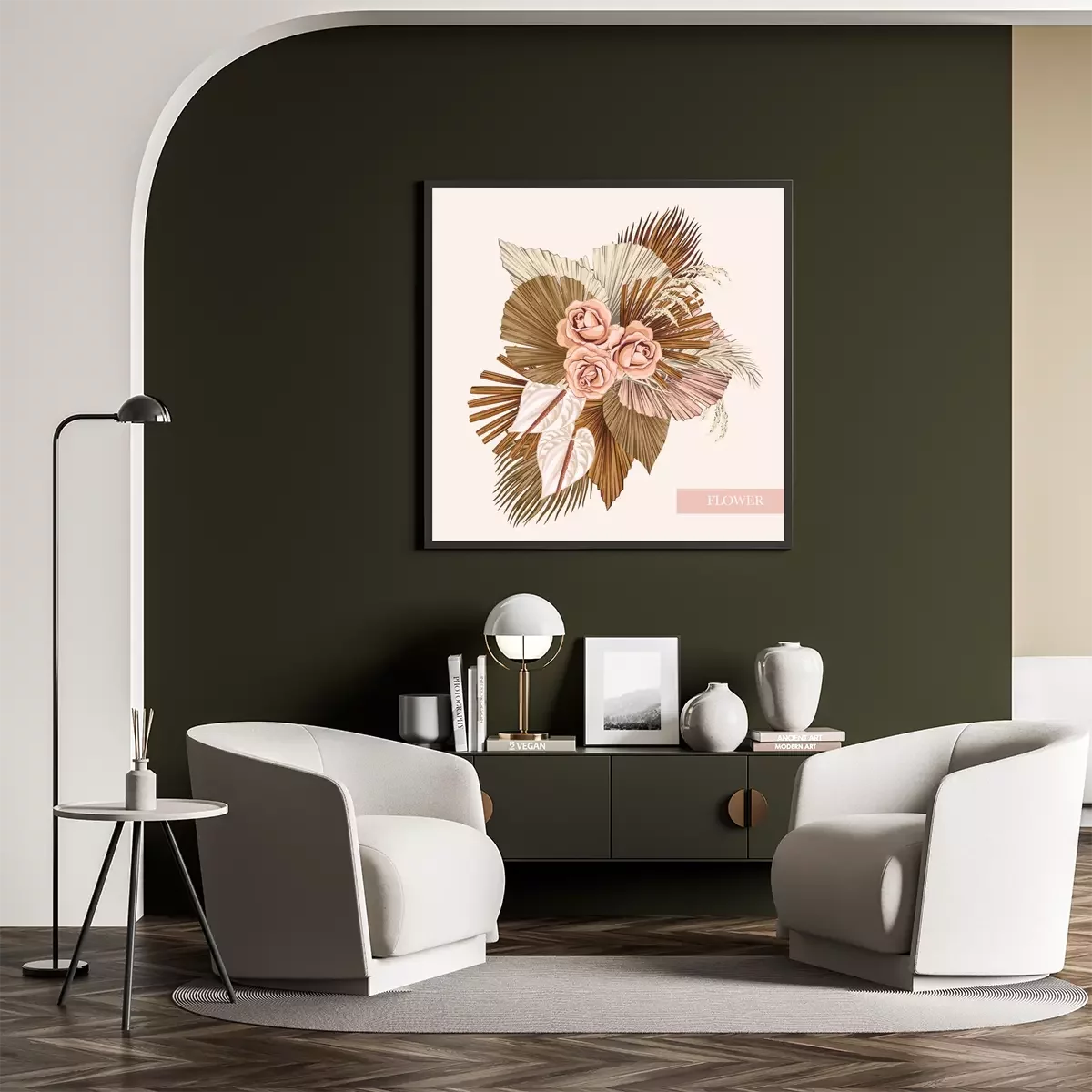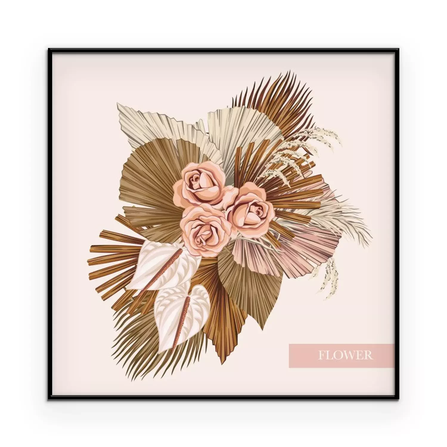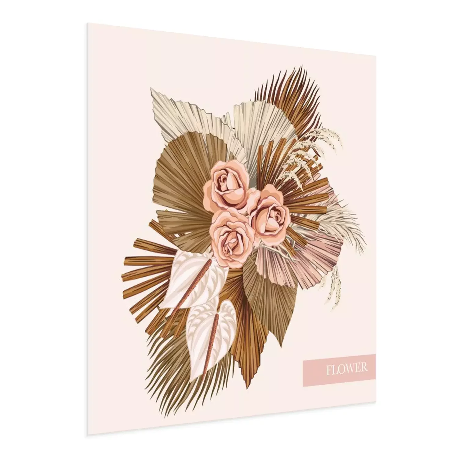 Poster: Boho bouquet dried palm leaves rose anthurium flower illustration. Tropical jungle floral vector composition.