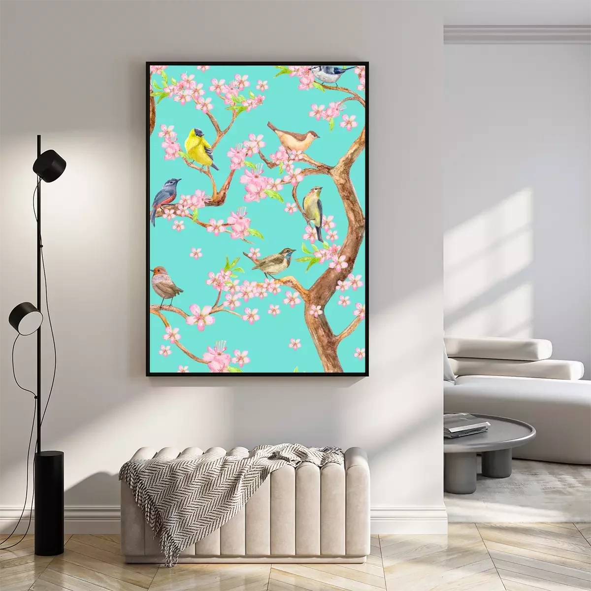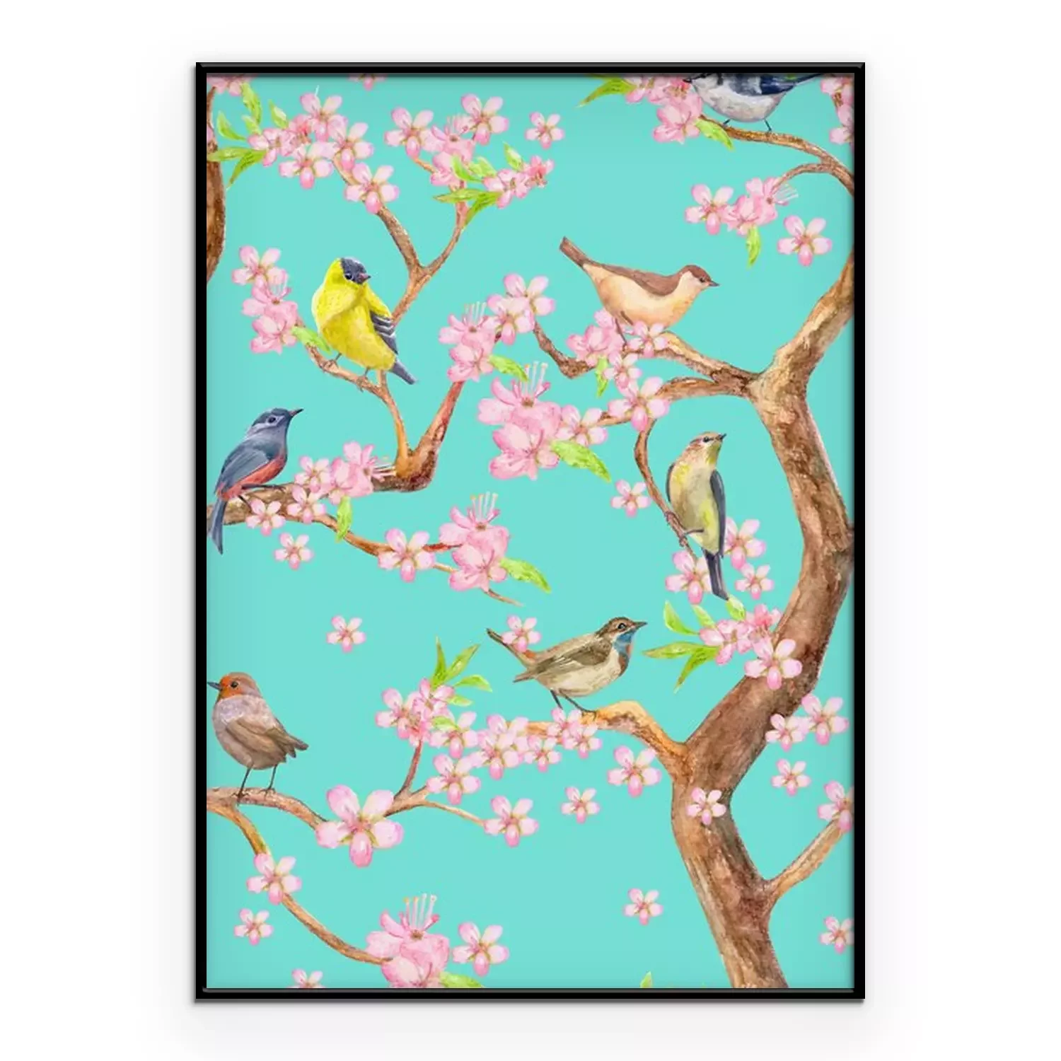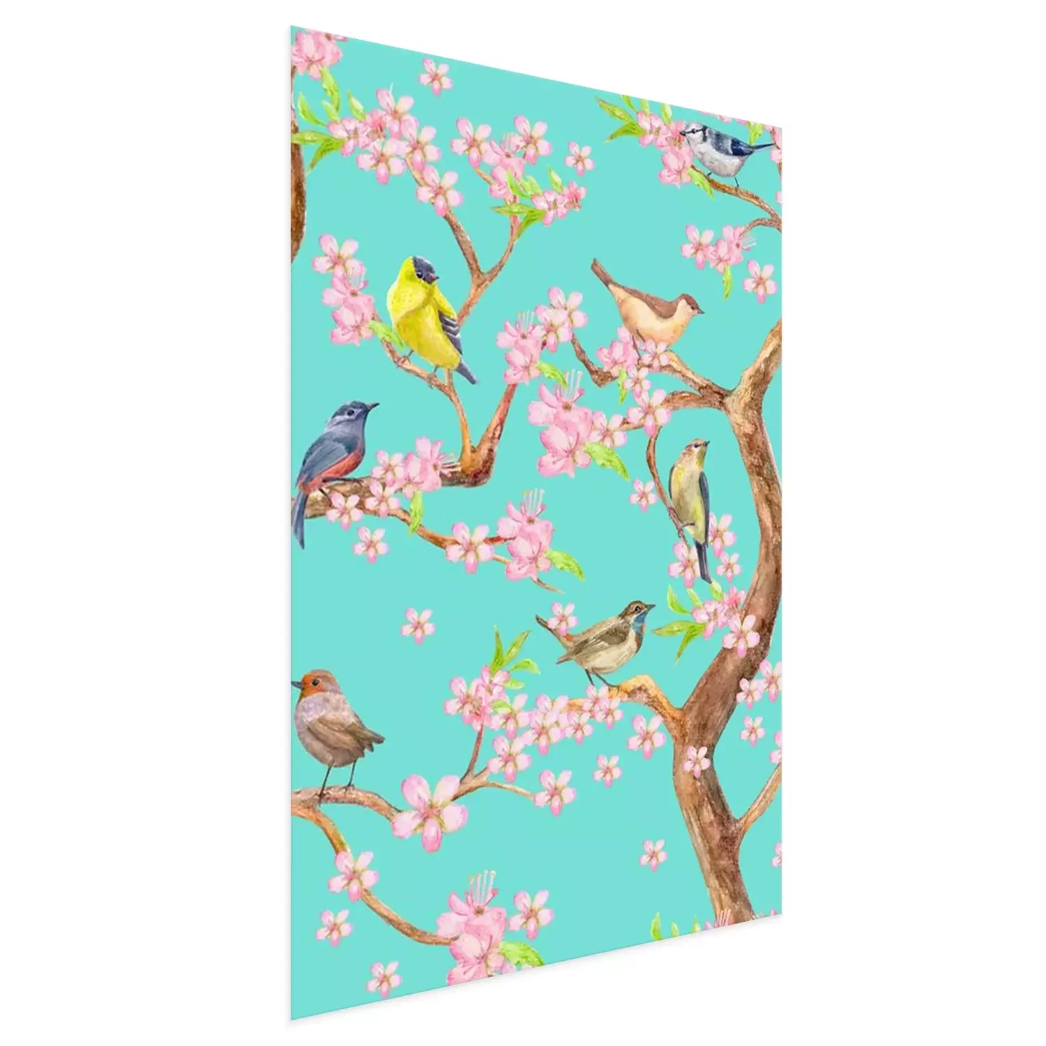 Poster: Boom met roze bloemen en vogels