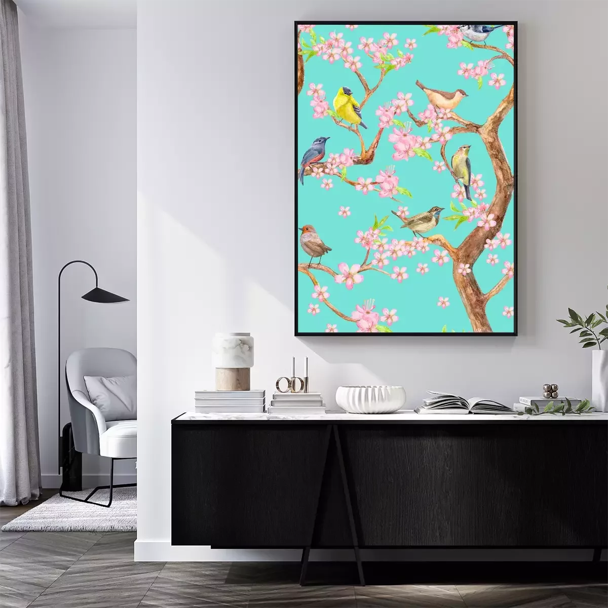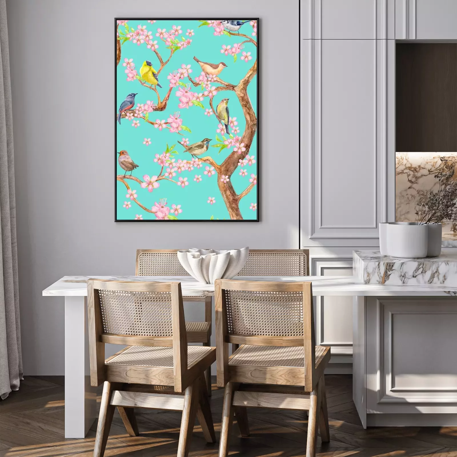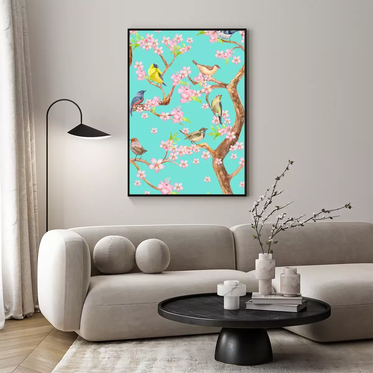 Poster: Boom met roze bloemen en vogels