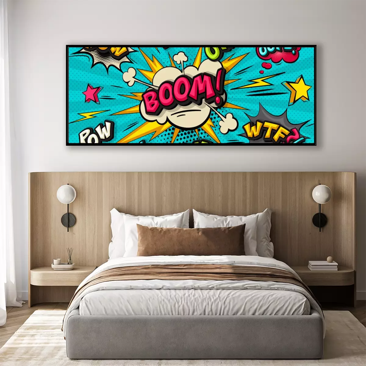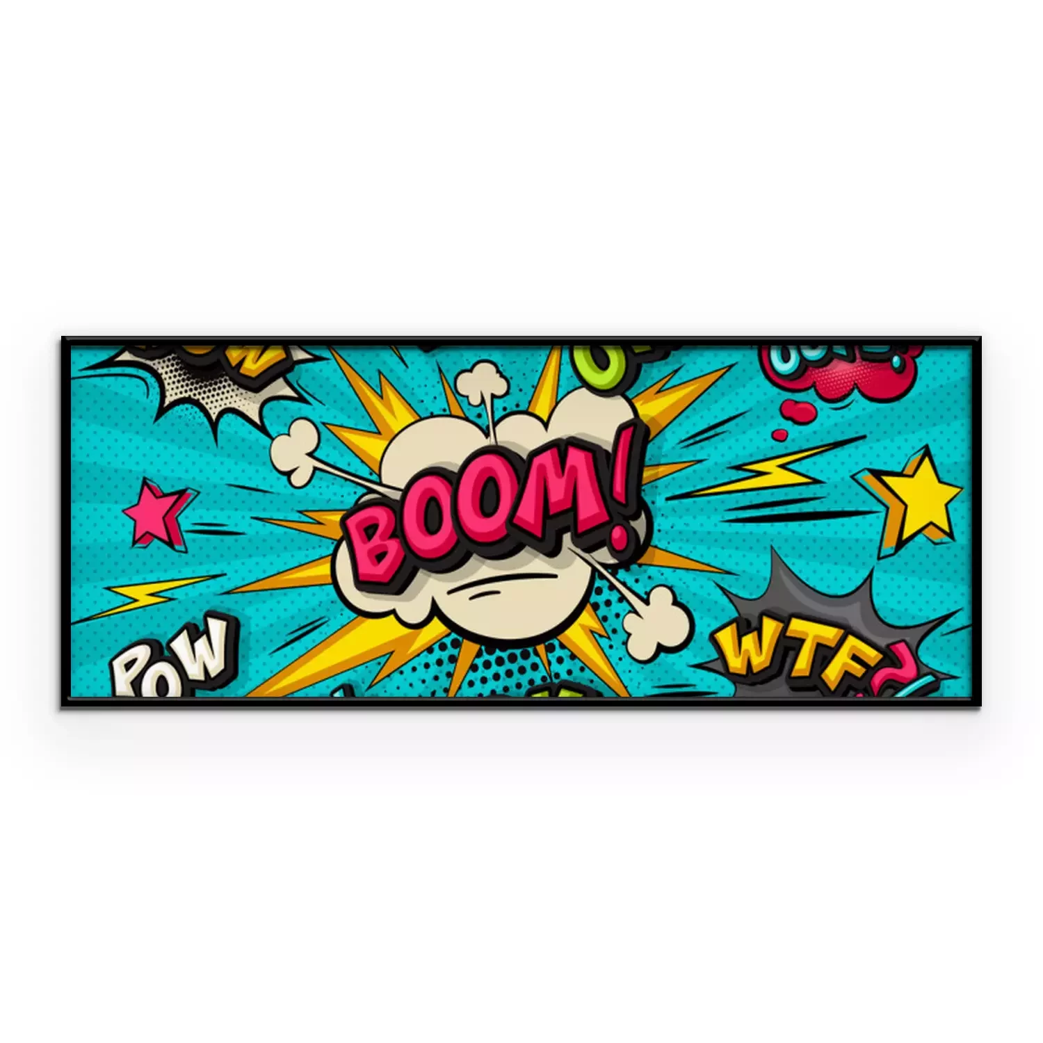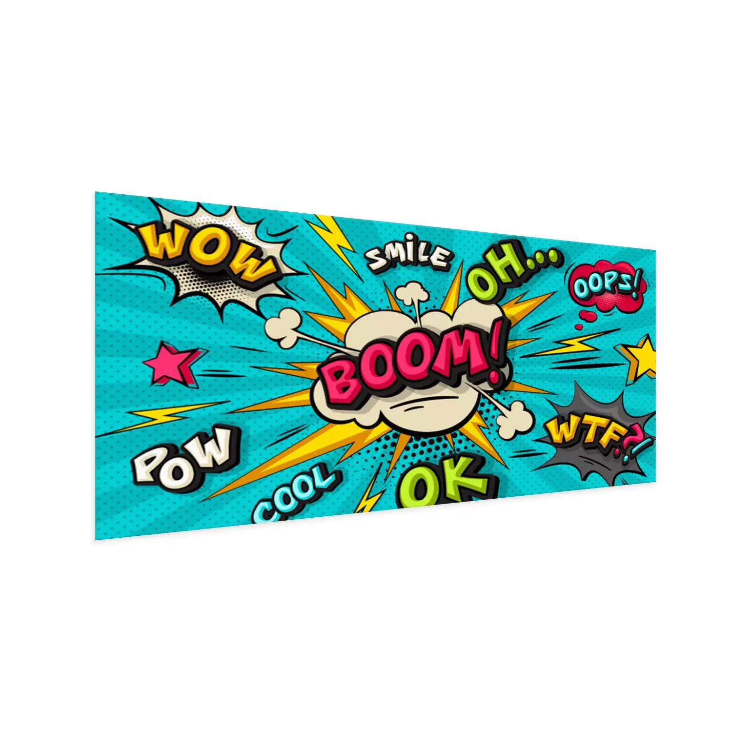 Poster: Boom pop art cloud bubble. Smile, wow, pow, cool, ok, oops, wtf funny speech bubble. Trendy Colorful retro vintage background in pop art retro comic style. Illustration easy editable for Your design.