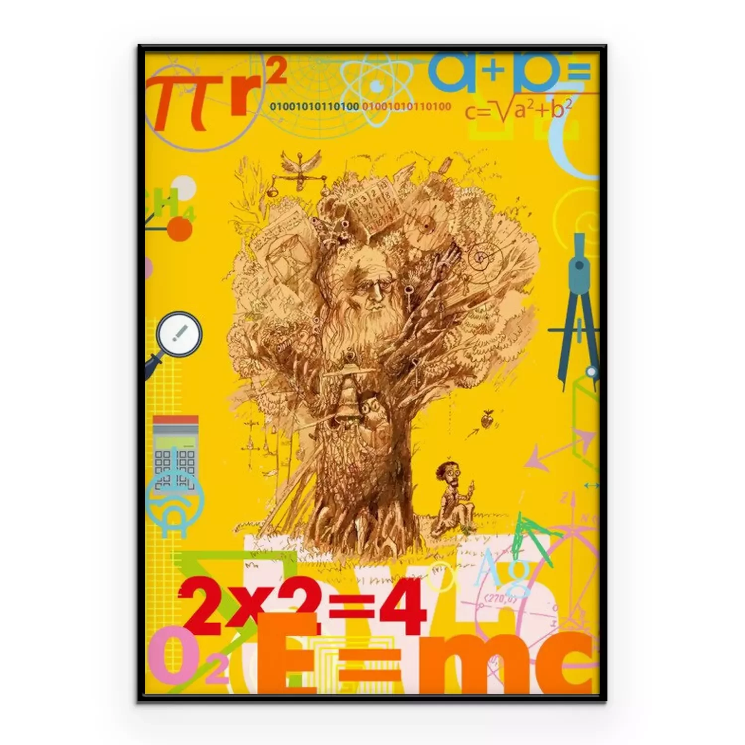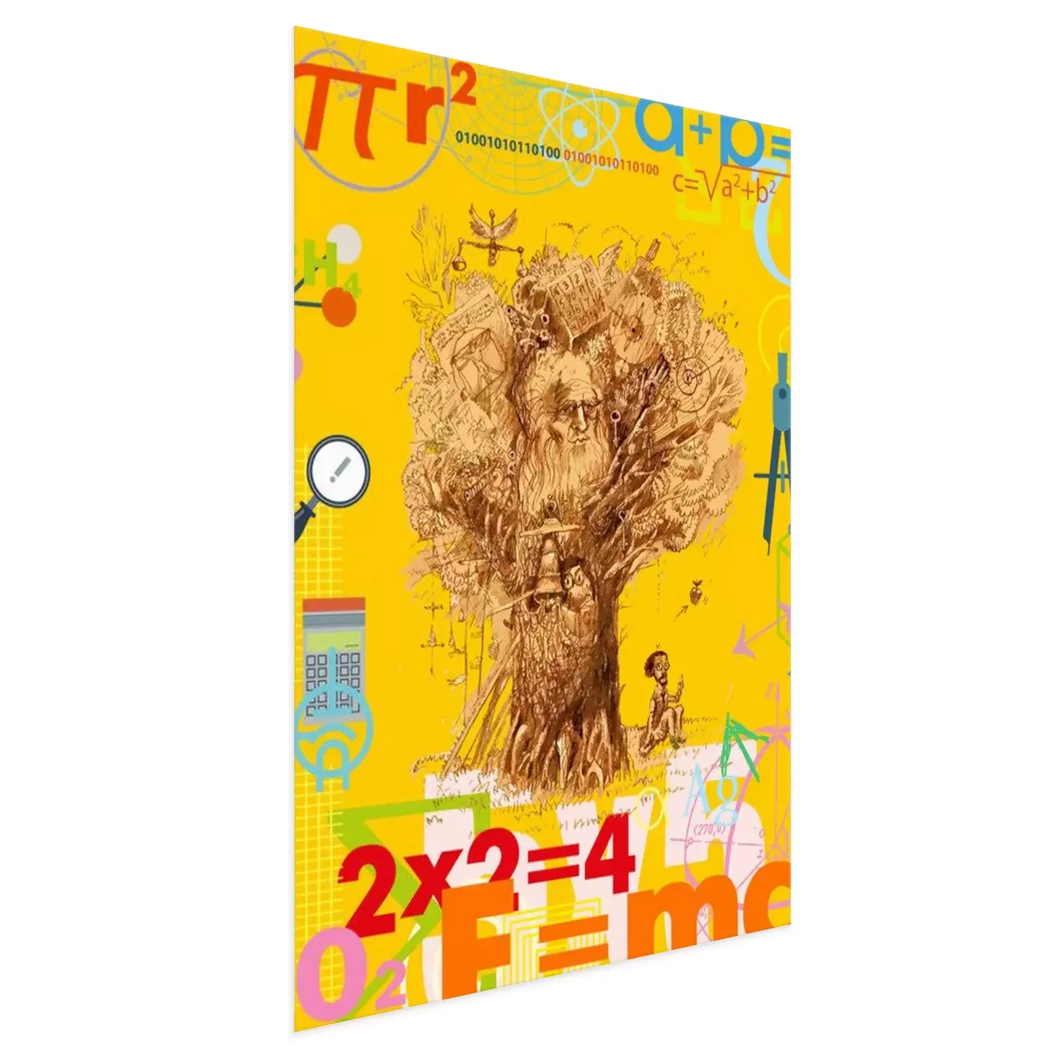 Poster: Boom van kennis. Terug naar school. Wetenschapper maakt ontdekking. Achtergrondmalplaatje van wetenschappelijke formules. Wiskunde, natuurkunde, scheikunde. Concept vectorillustratie