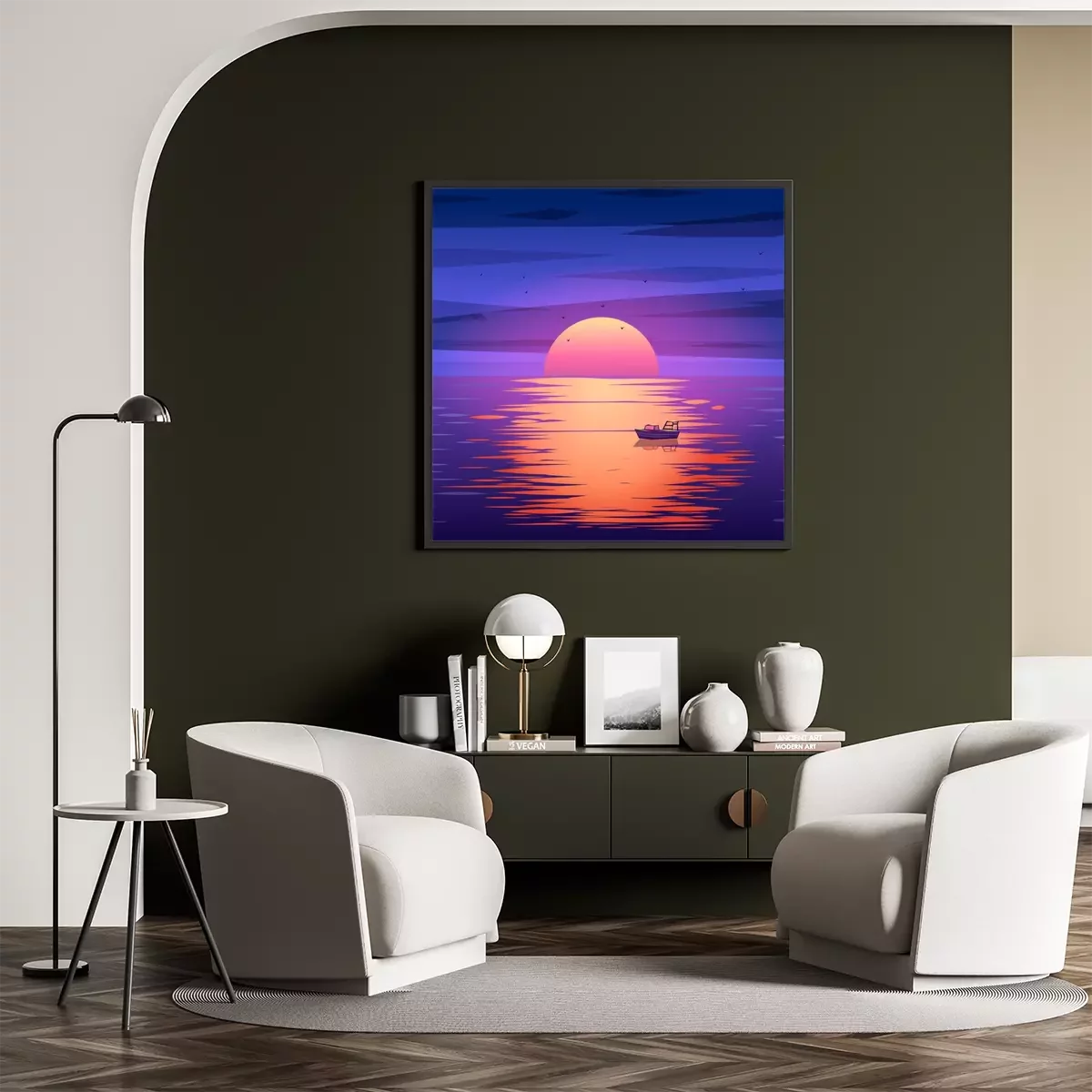 Poster: Boot tegen een achtergrond van de ondergaande zon