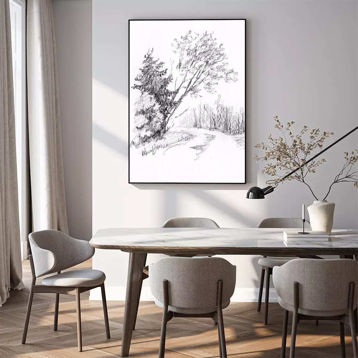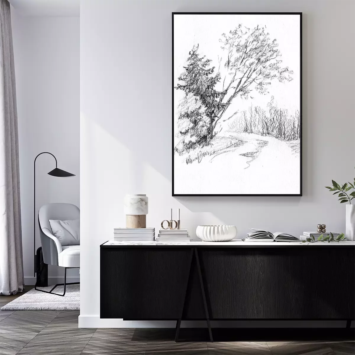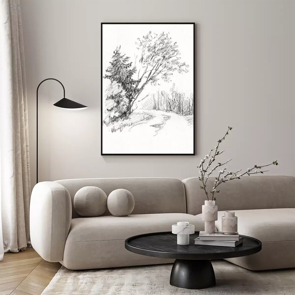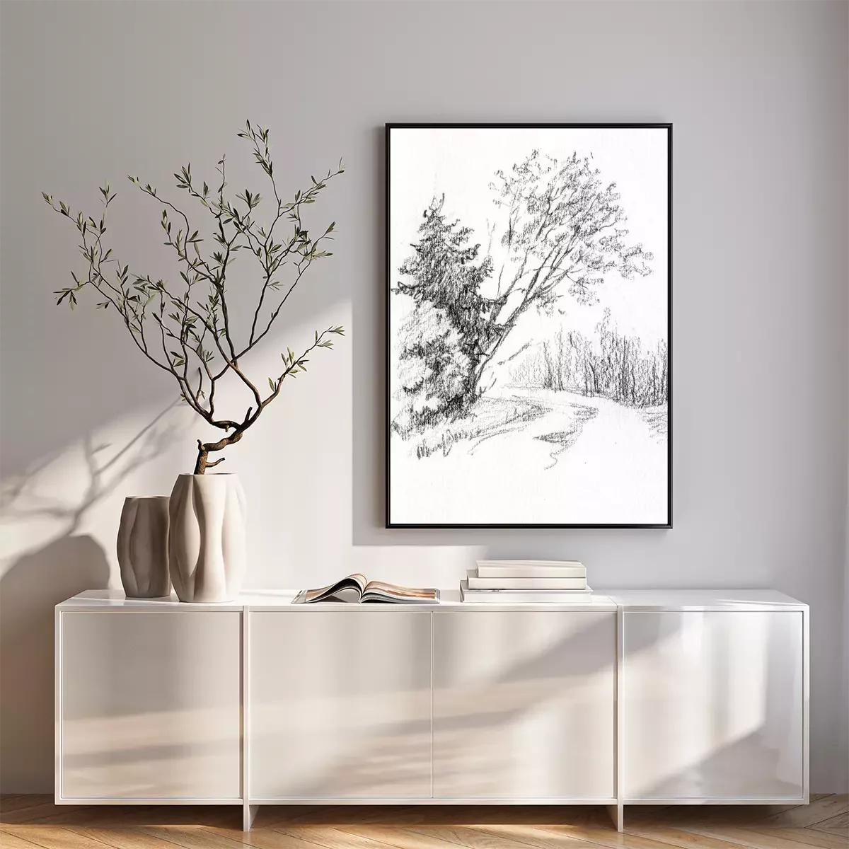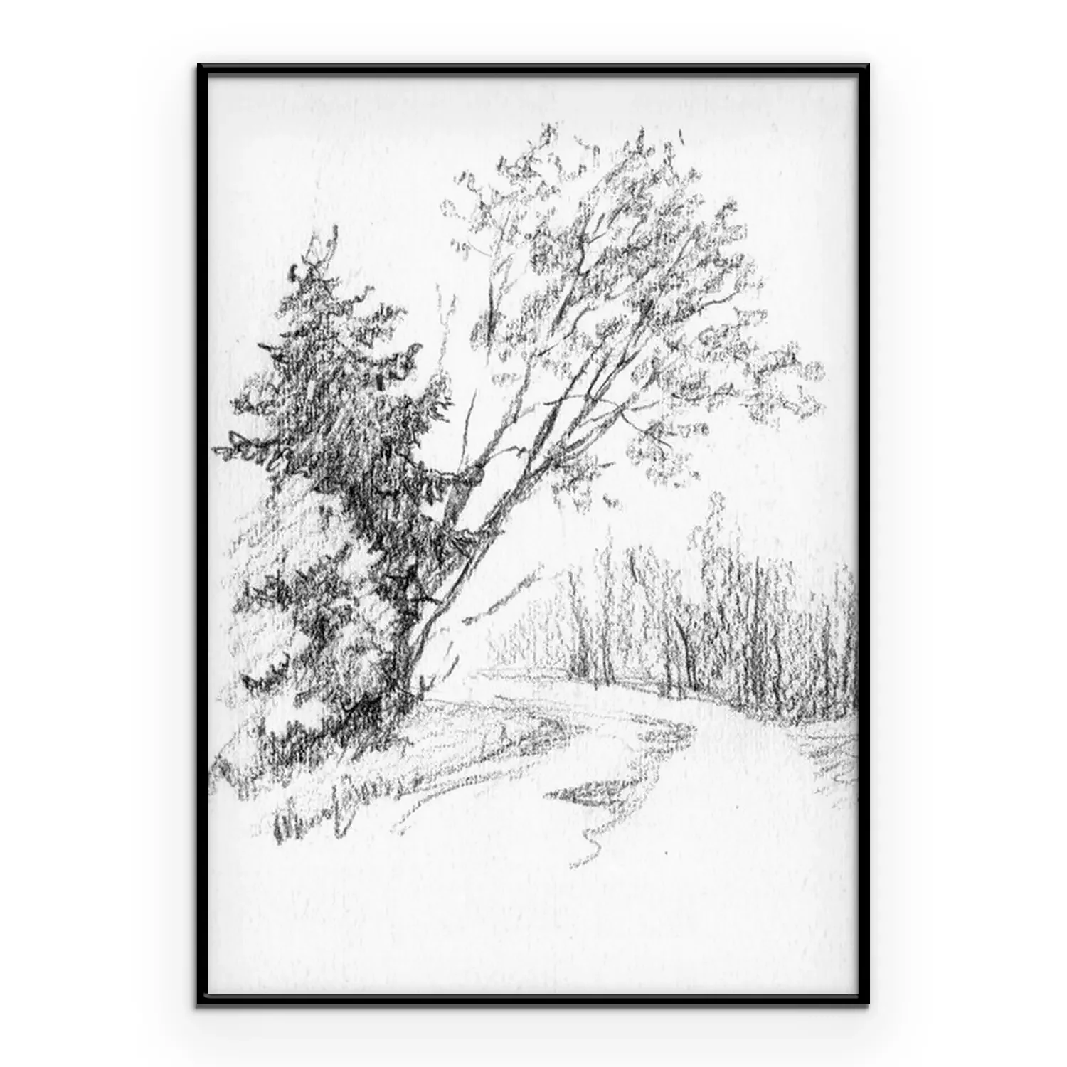 Poster: Bos. Berken en sparren. Potloodschets op papier. Met de hand getekend. Voor het interieur, wenskaart.
