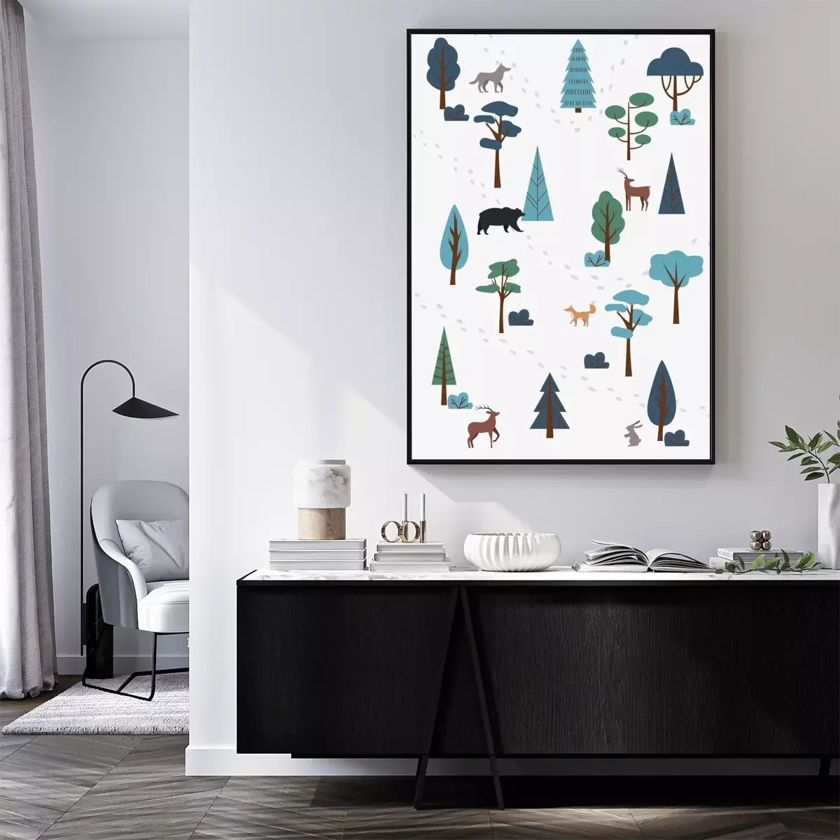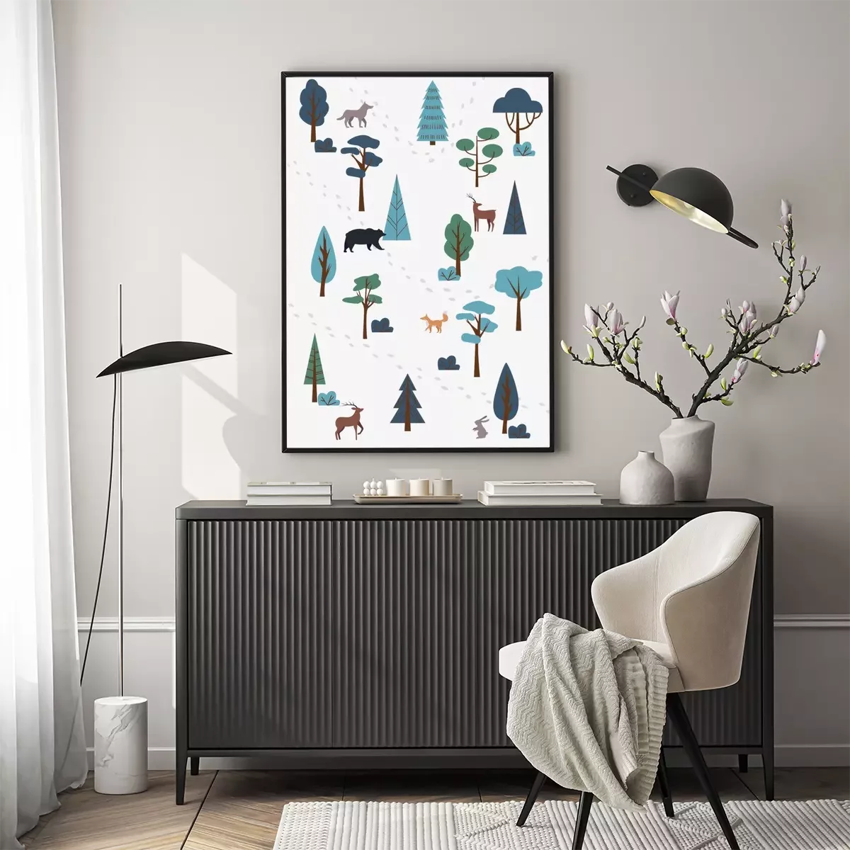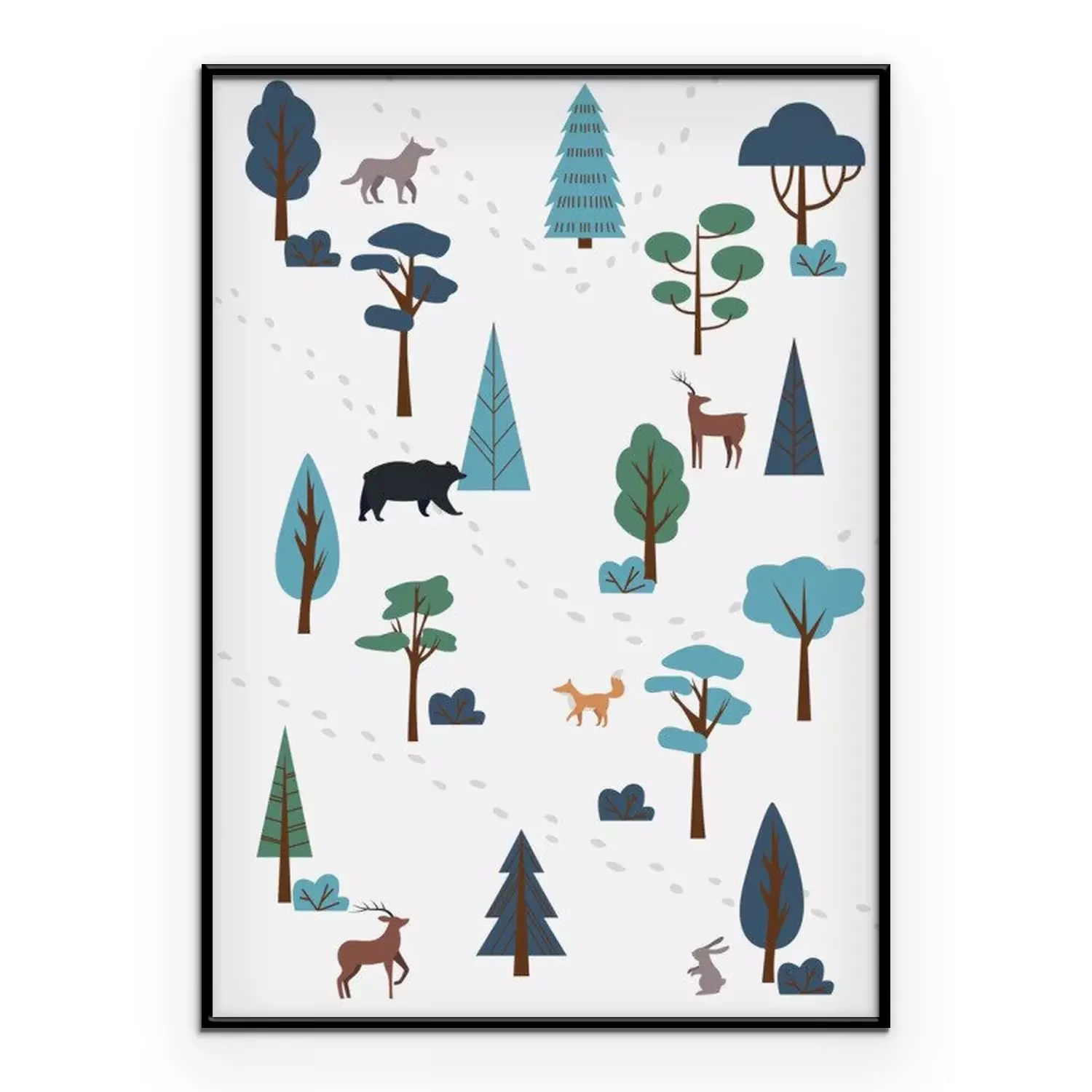 Poster: Bos met afbeeldingen van dieren in gedempte kleuren