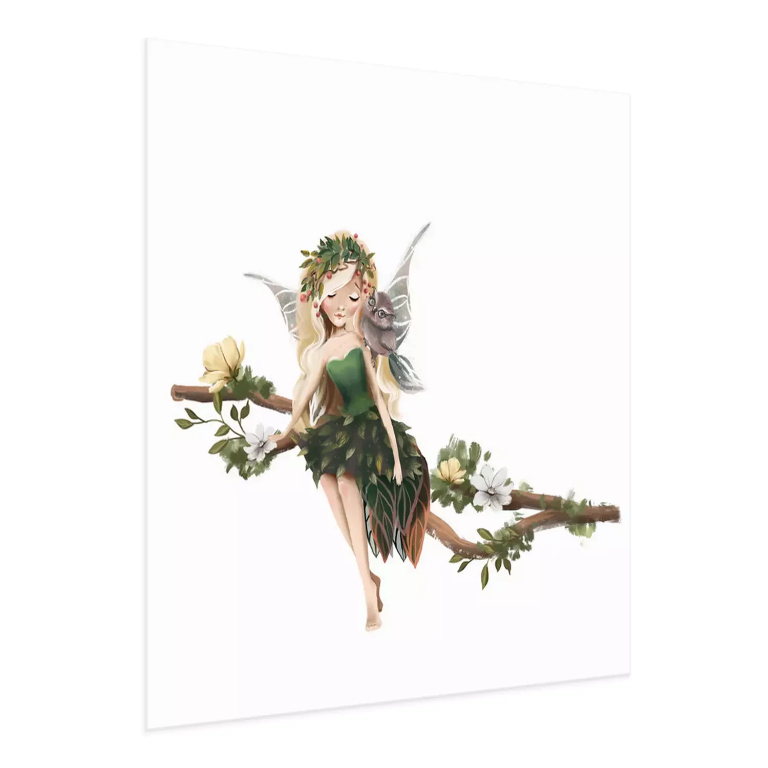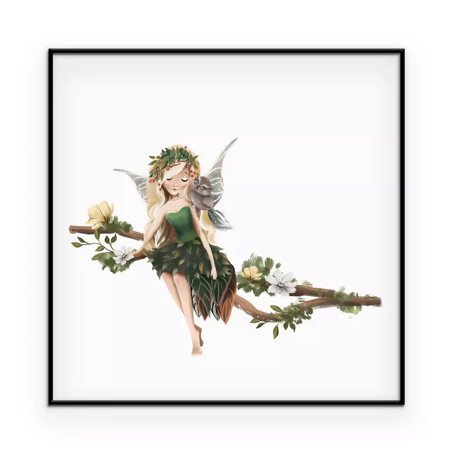 Cute hand drawn fairy with owl in floral wreath, flowers bouquet, woodland watercolor illustration