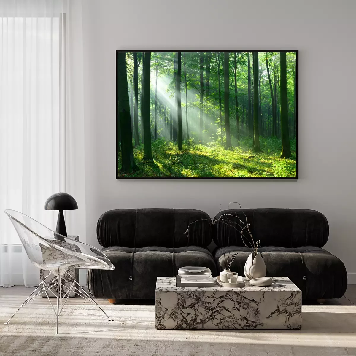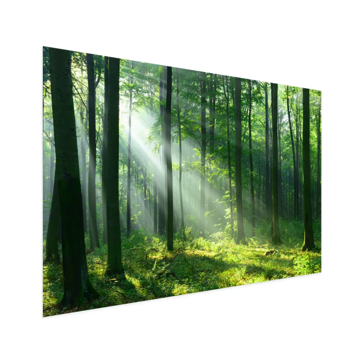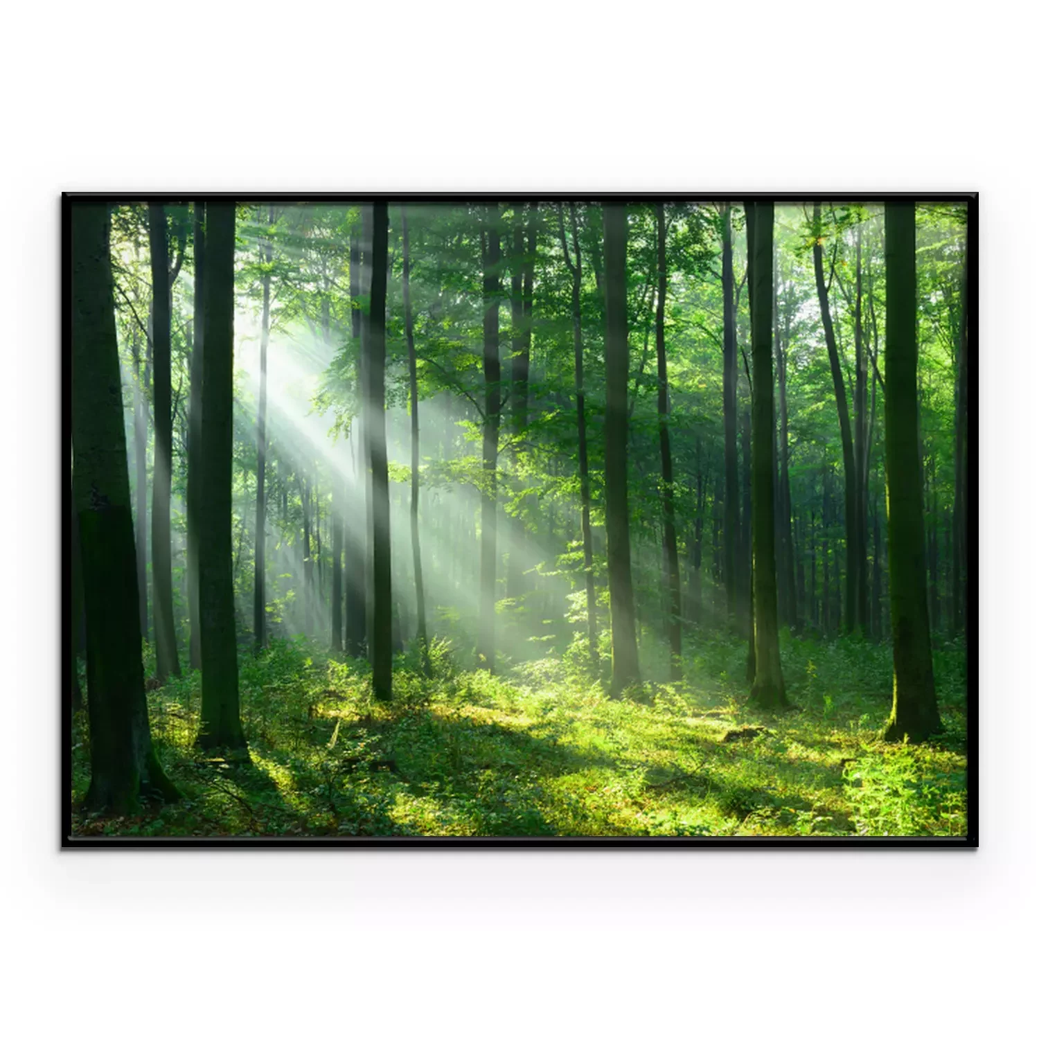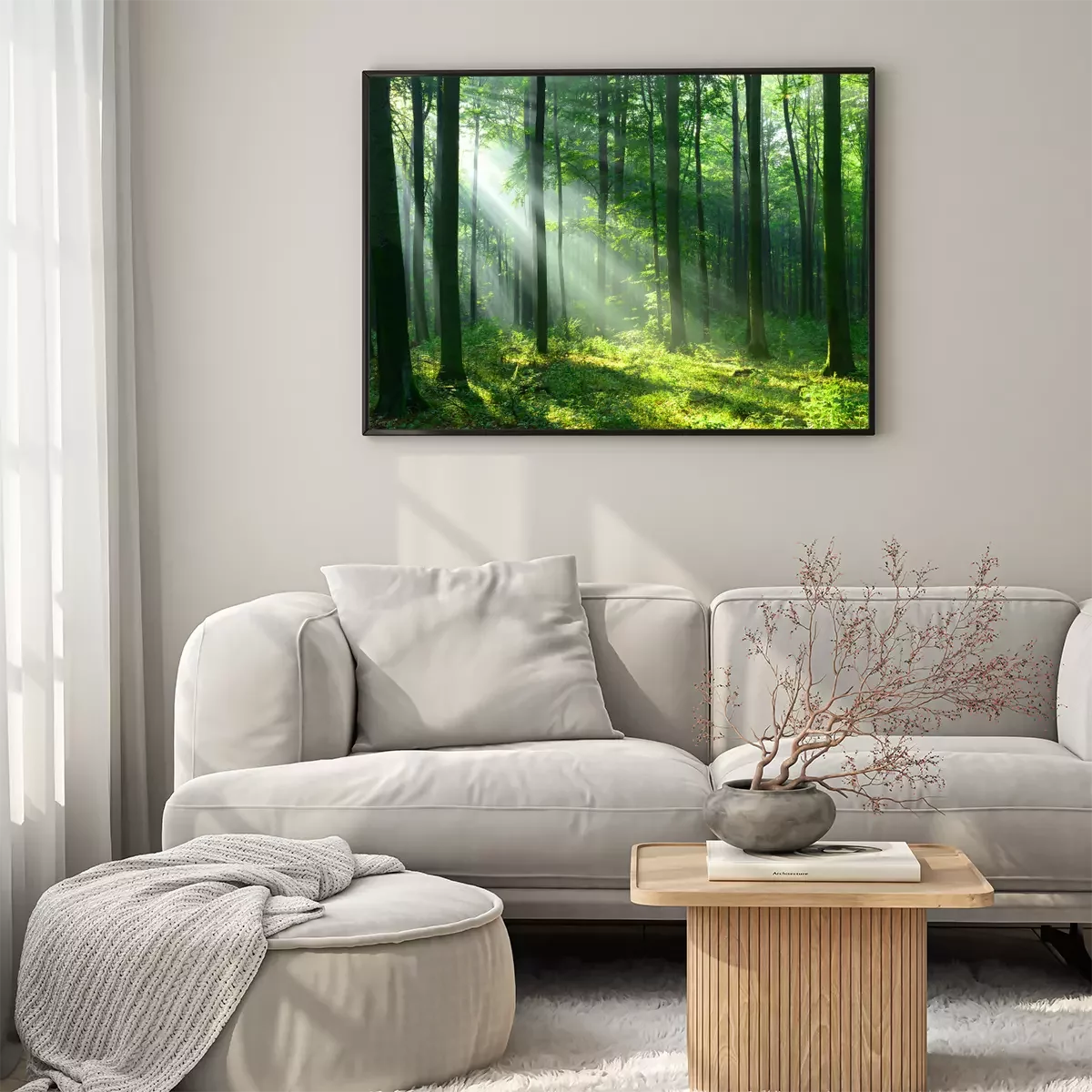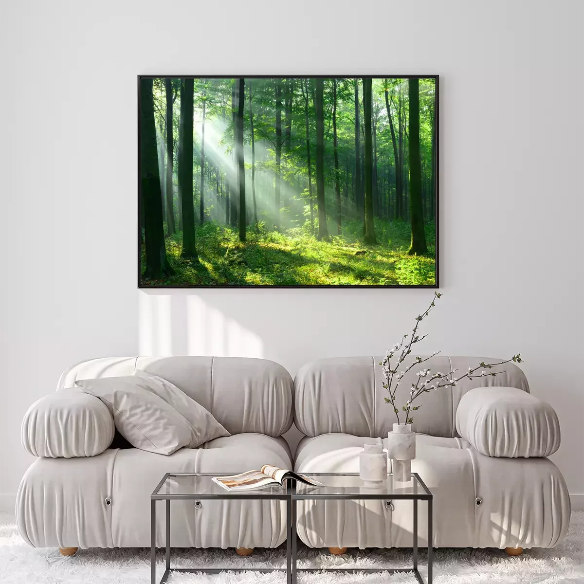 Poster: Boslandschap met zonnestralen tussen de bomen