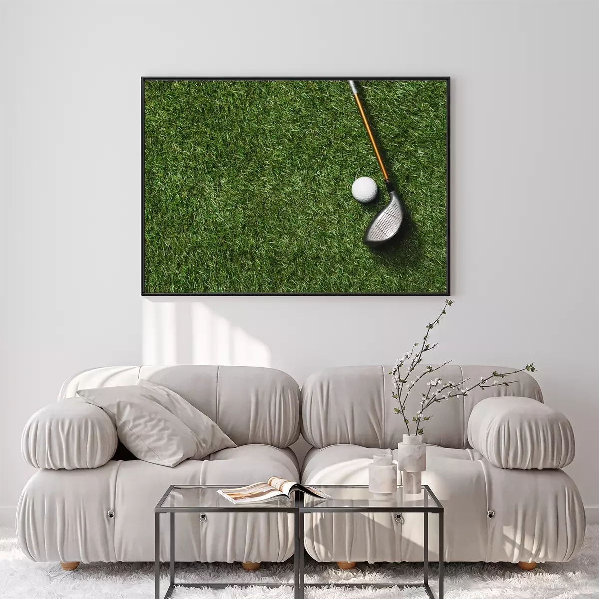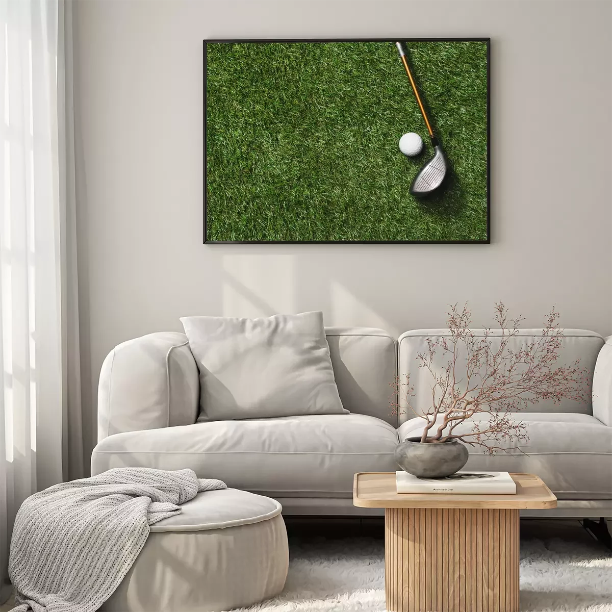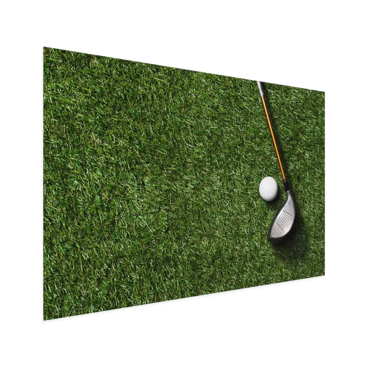 Poster: Bovenaanzicht van golfclub en bal op grasveld