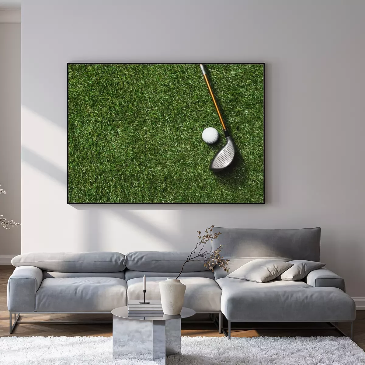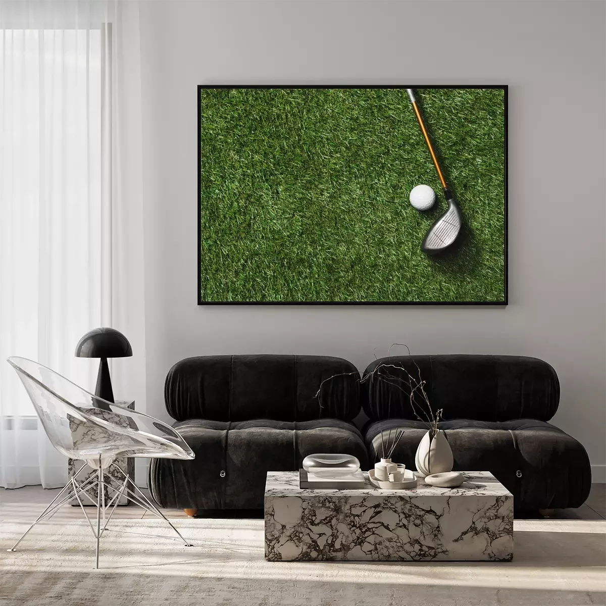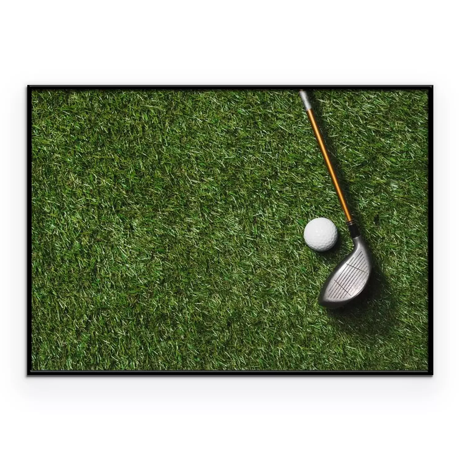 Poster: Bovenaanzicht van golfclub en bal op grasveld