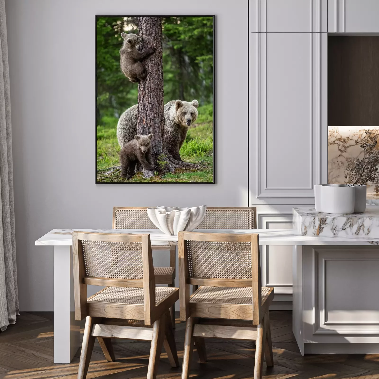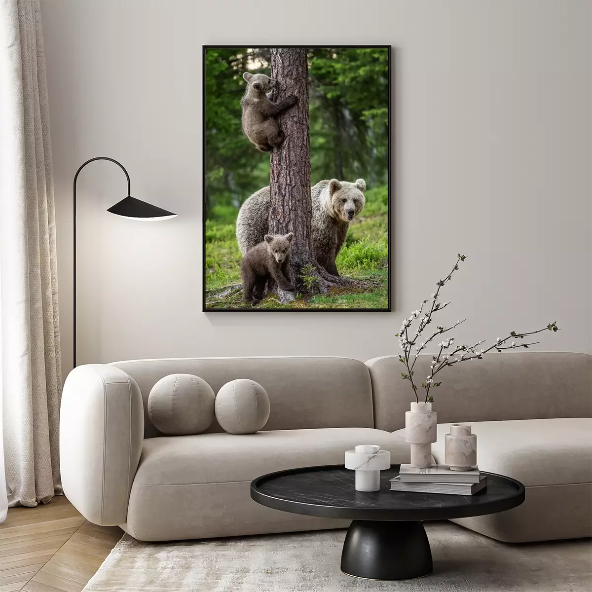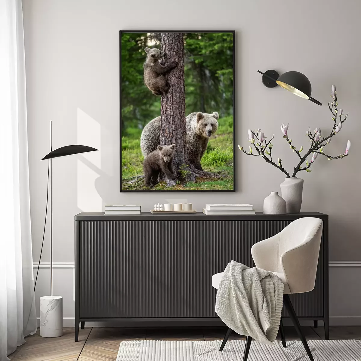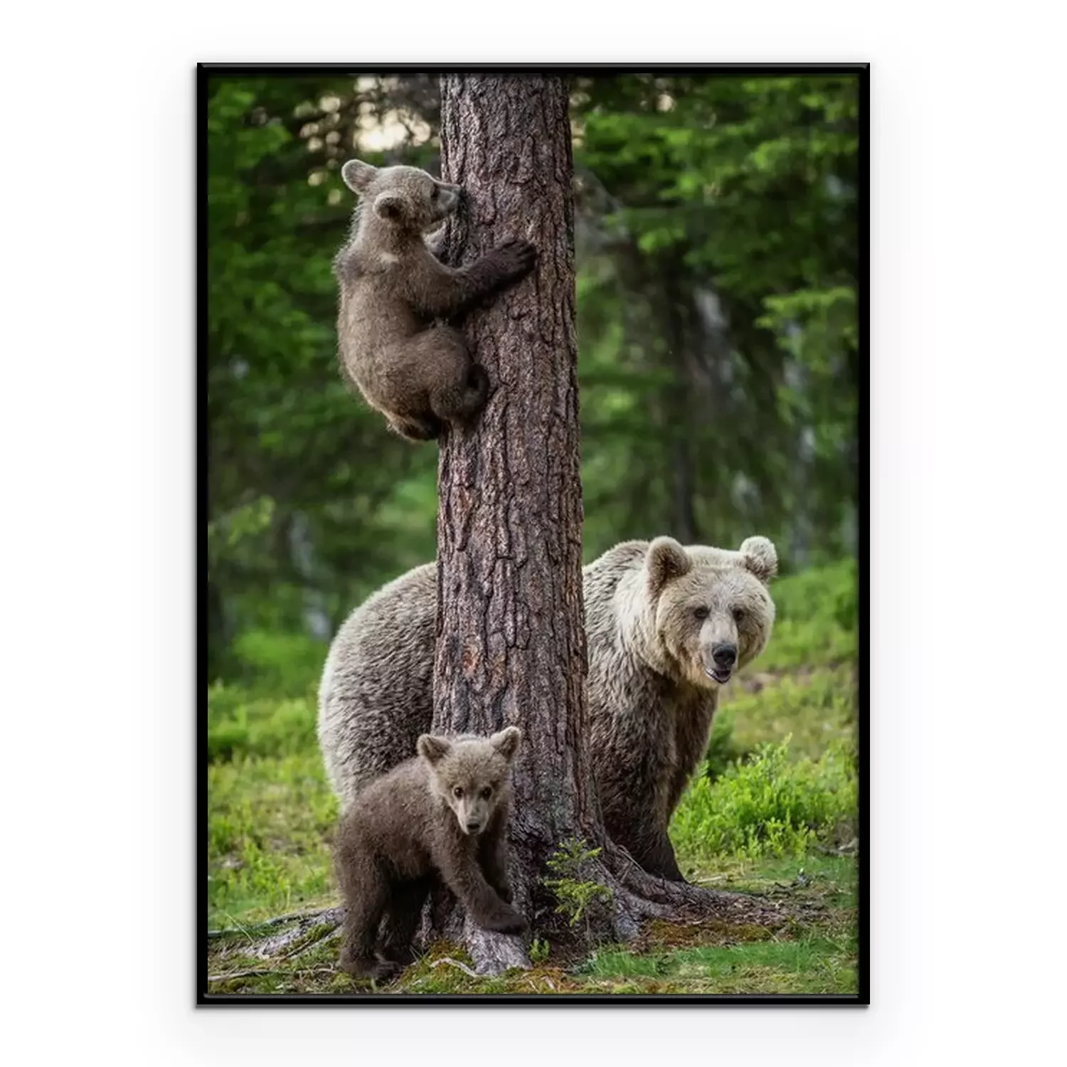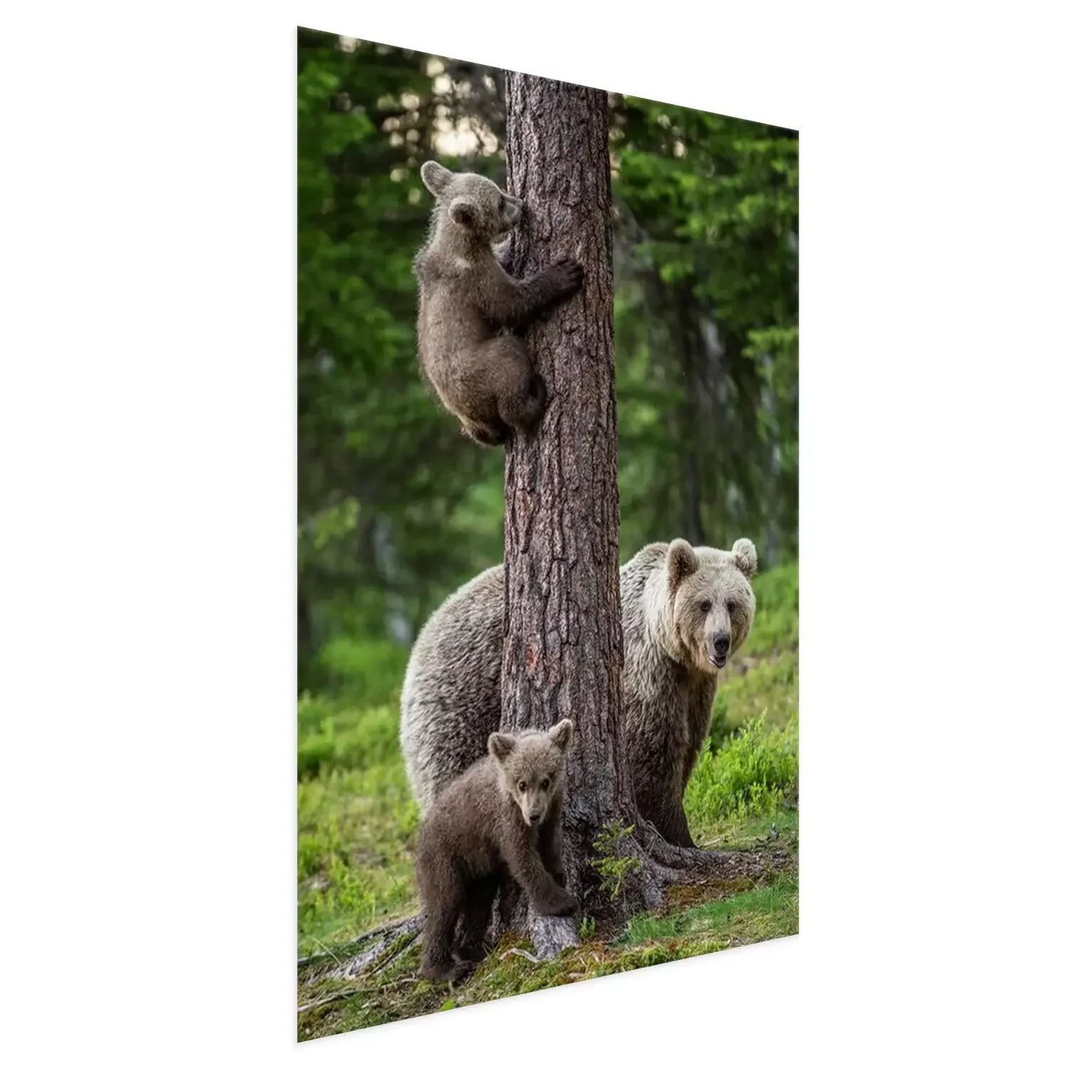 Poster Brown bear cubs climbs a tree. She-bear and cubs in the summer forest. Brown bear. Scientific name: Ursus arctos. Summer season, natural habitat.