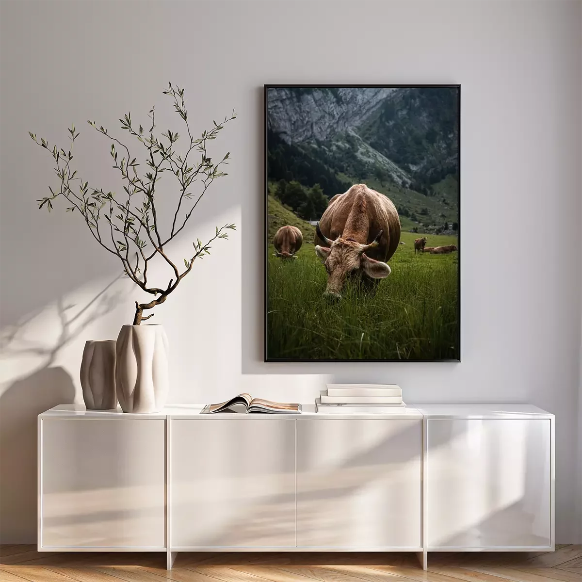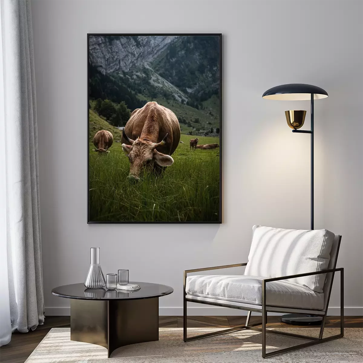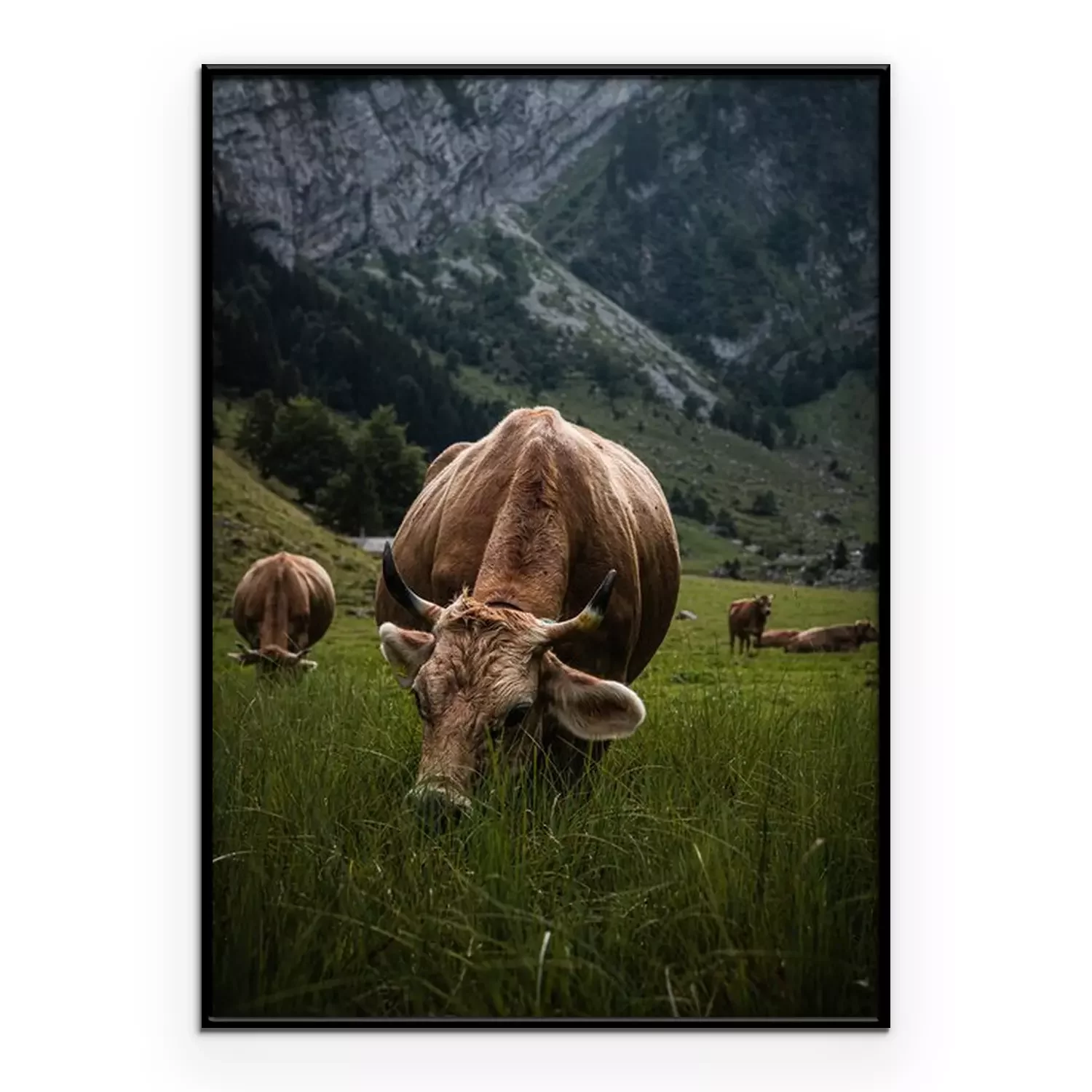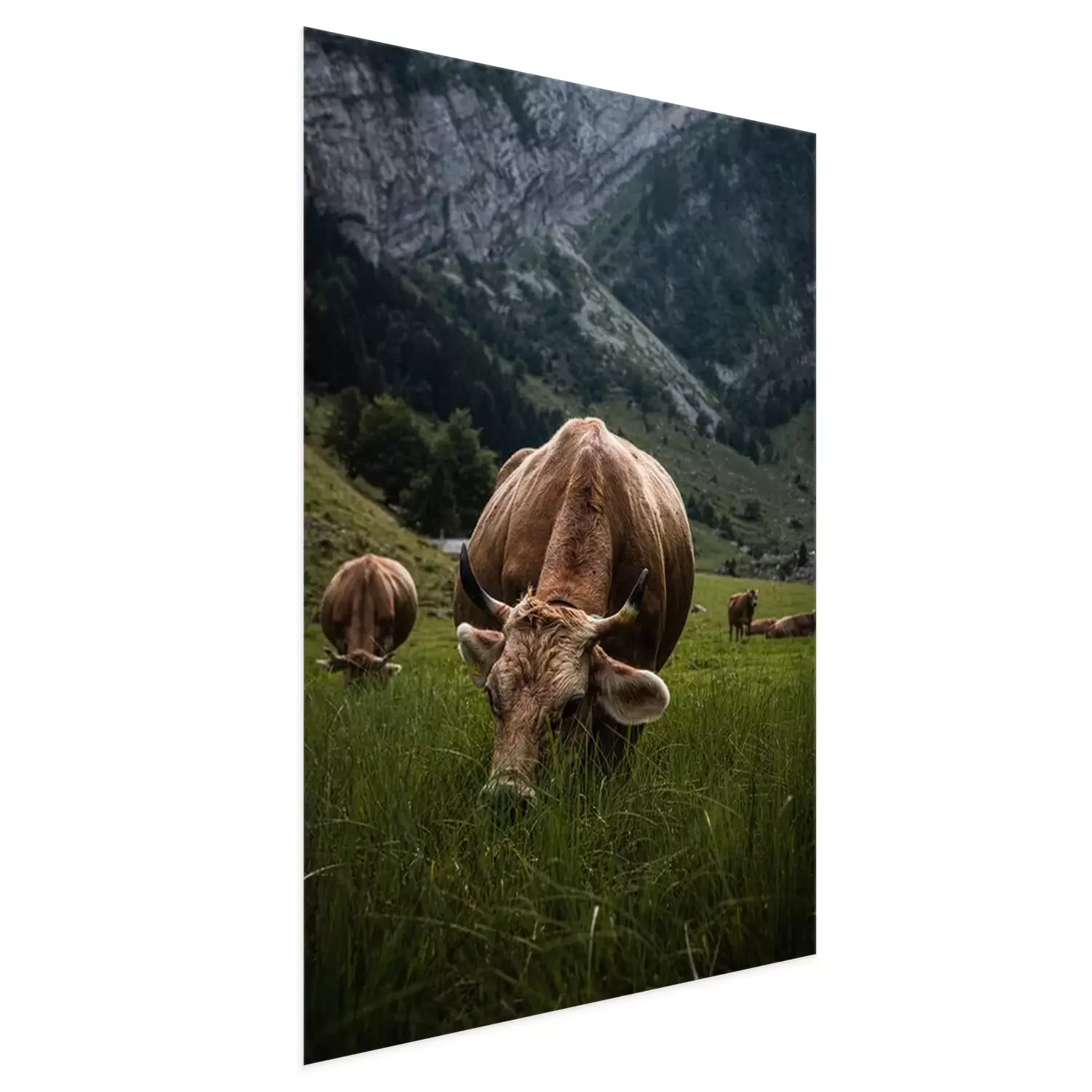 Poster: Bruine koe graast in de Alpen
