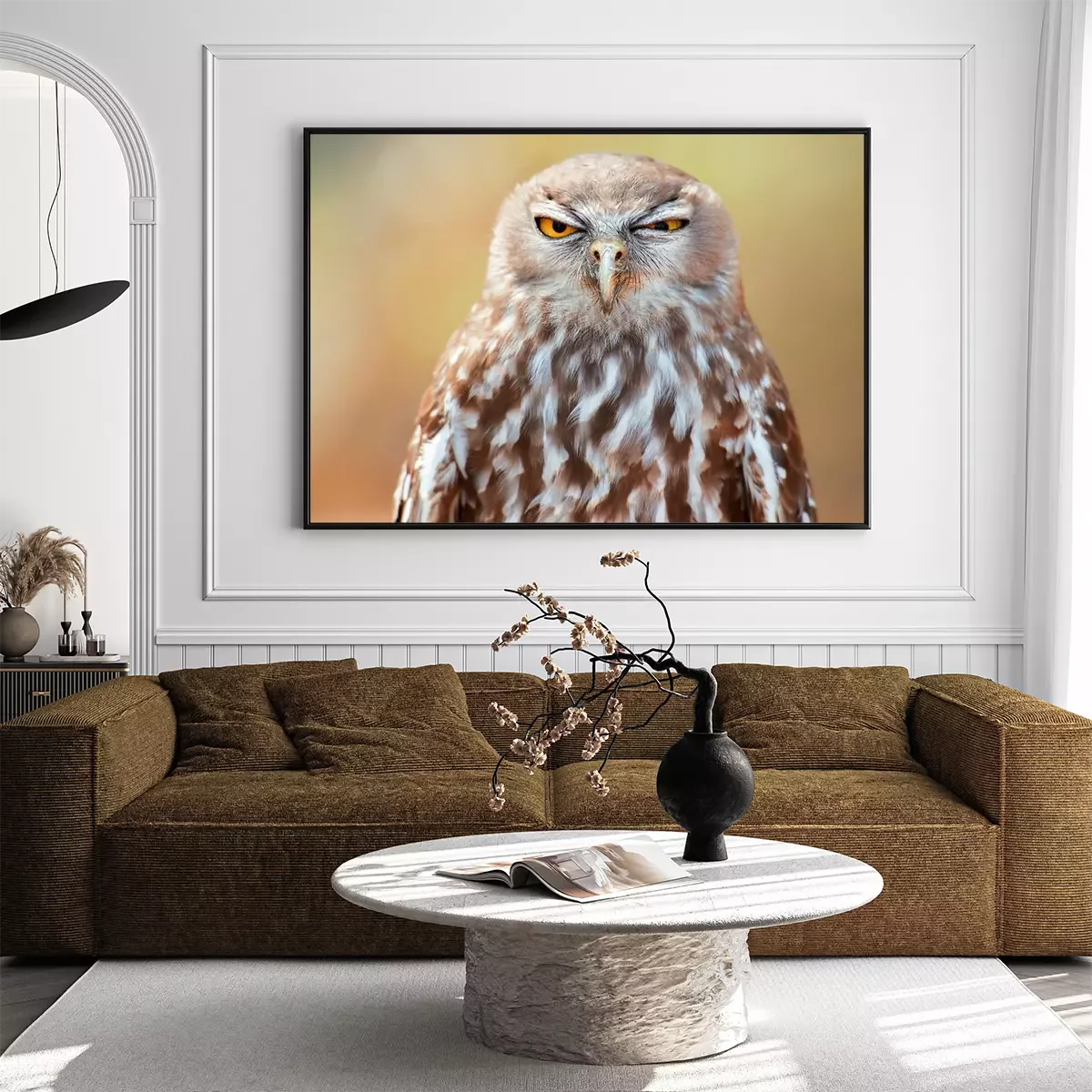 Poster: Bruine uil op een onscherpe achtergrond