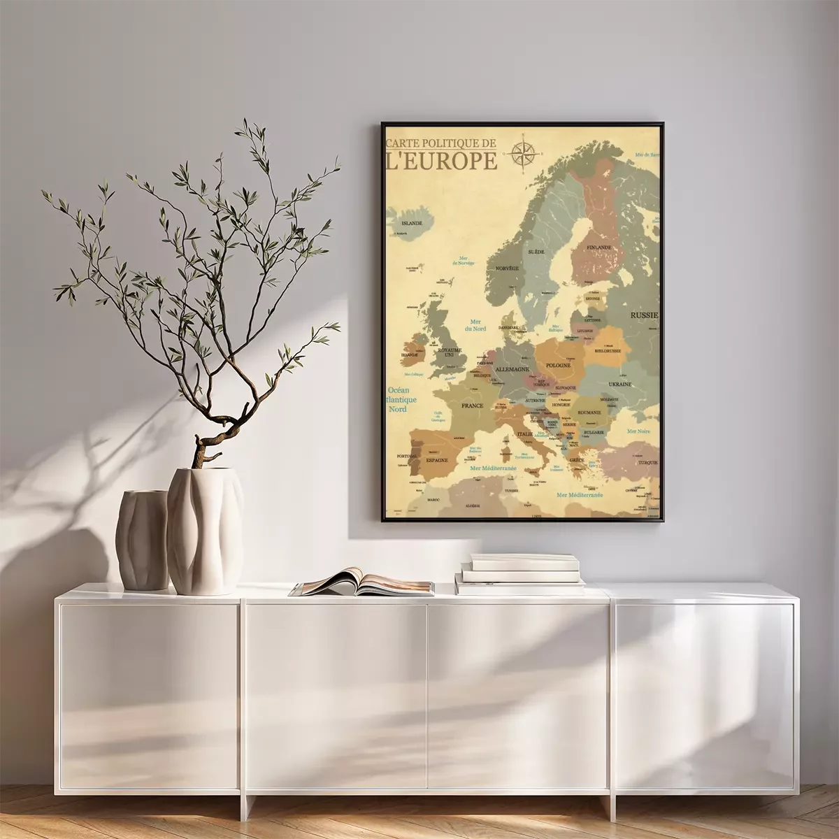 Poster: Carte Europe avec capitales - Textuur vintage rétro - Textes français - Vecteur CMJN