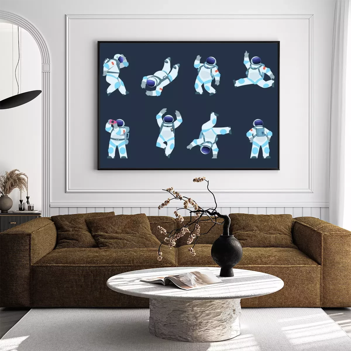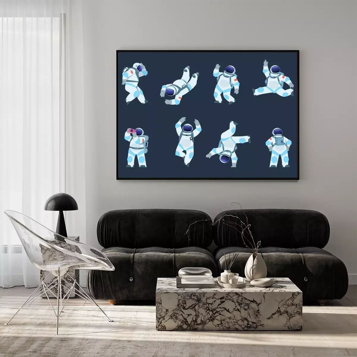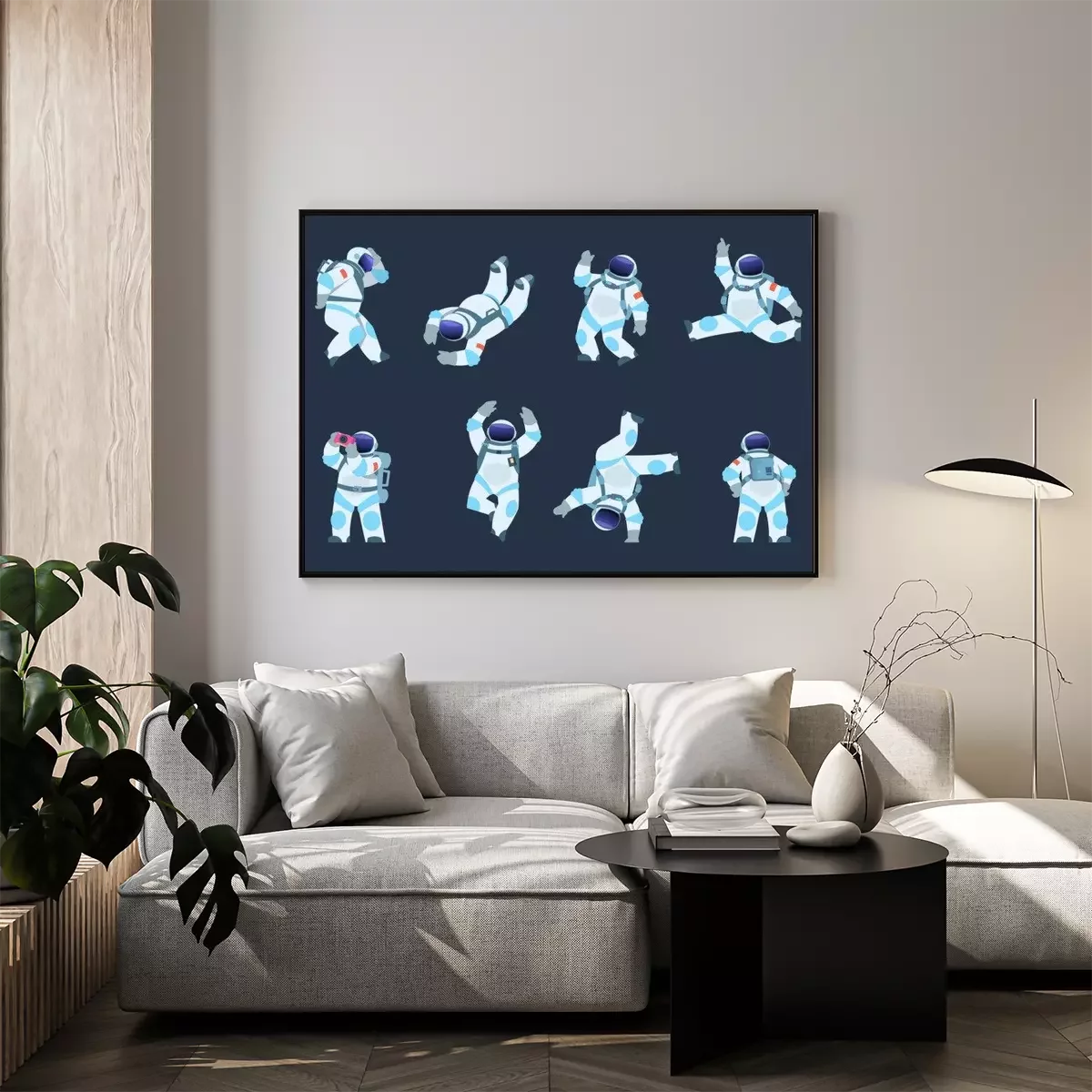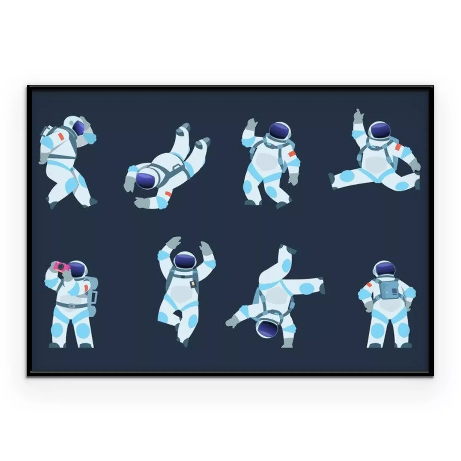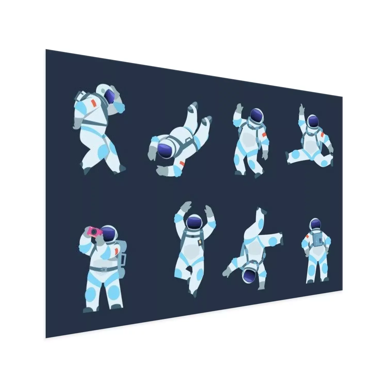 Poster Cartoon astronaut. Dancing party cosmonaut, retro disco spaceman, comic space dancer. Vector comics astronaut illustration in different poses