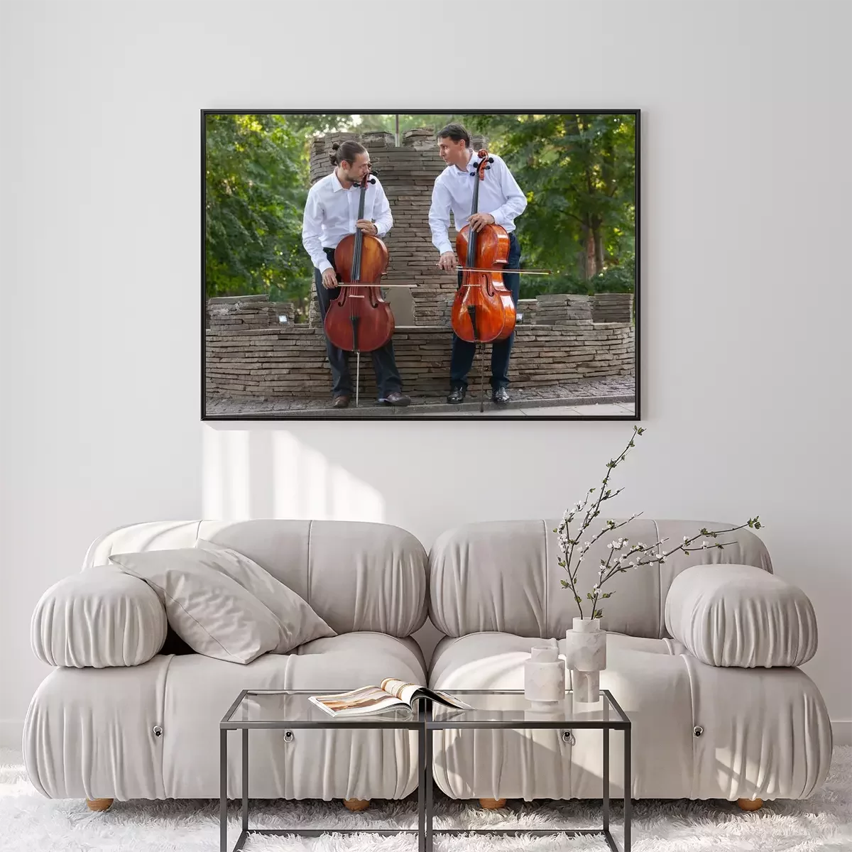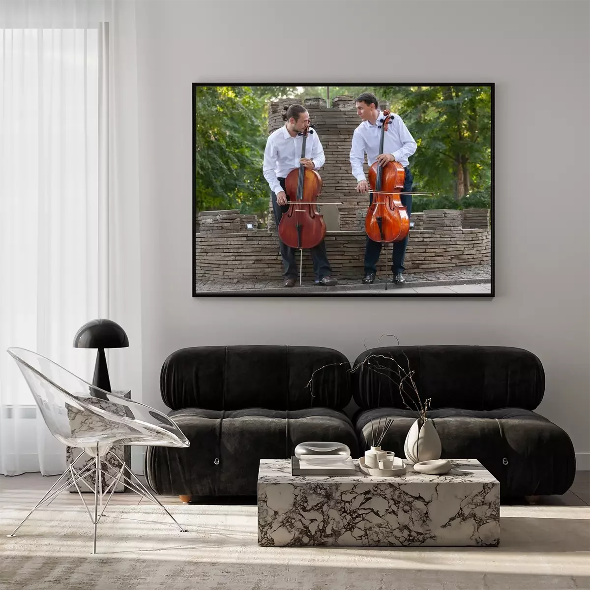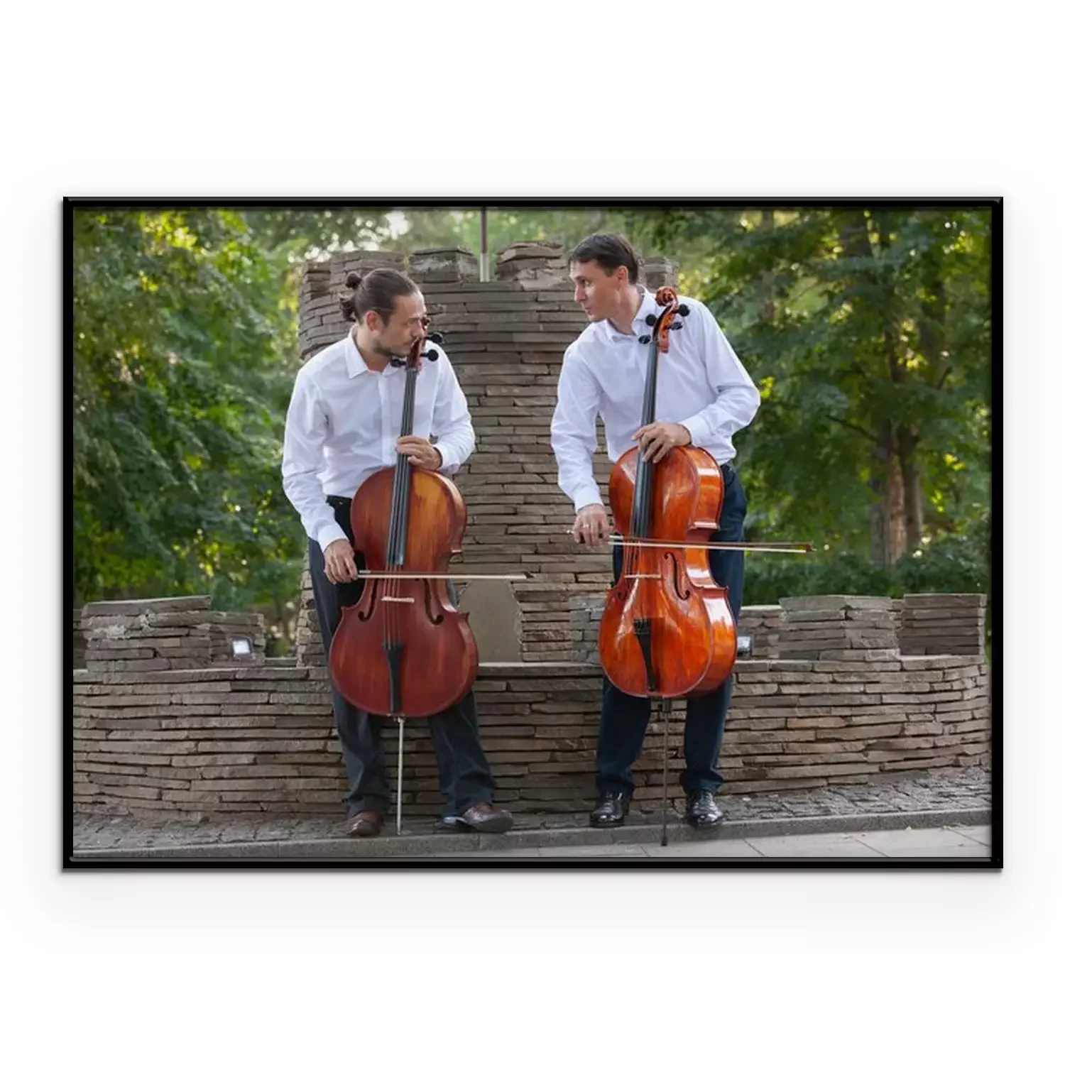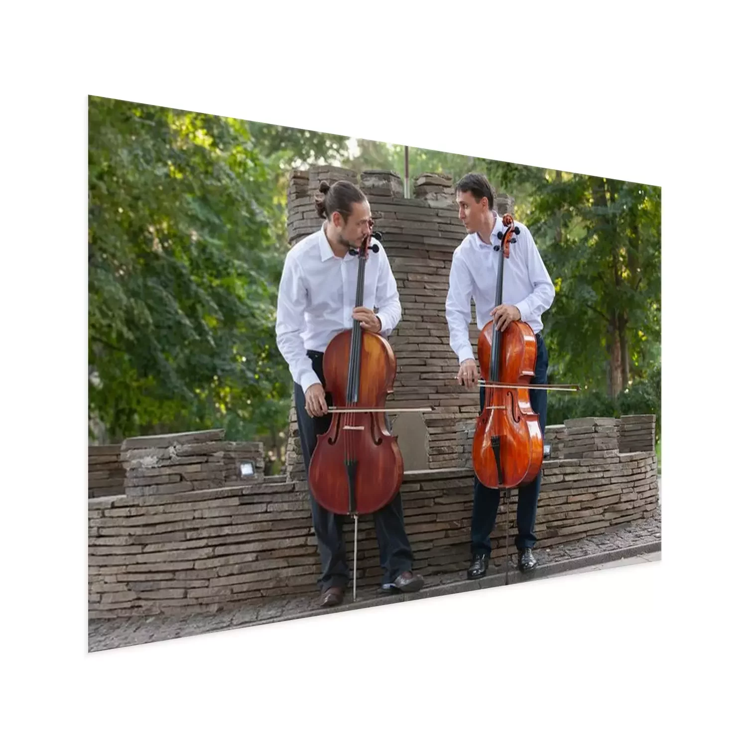 Poster Cellist musician group perform music in the street, close up man playing violin
