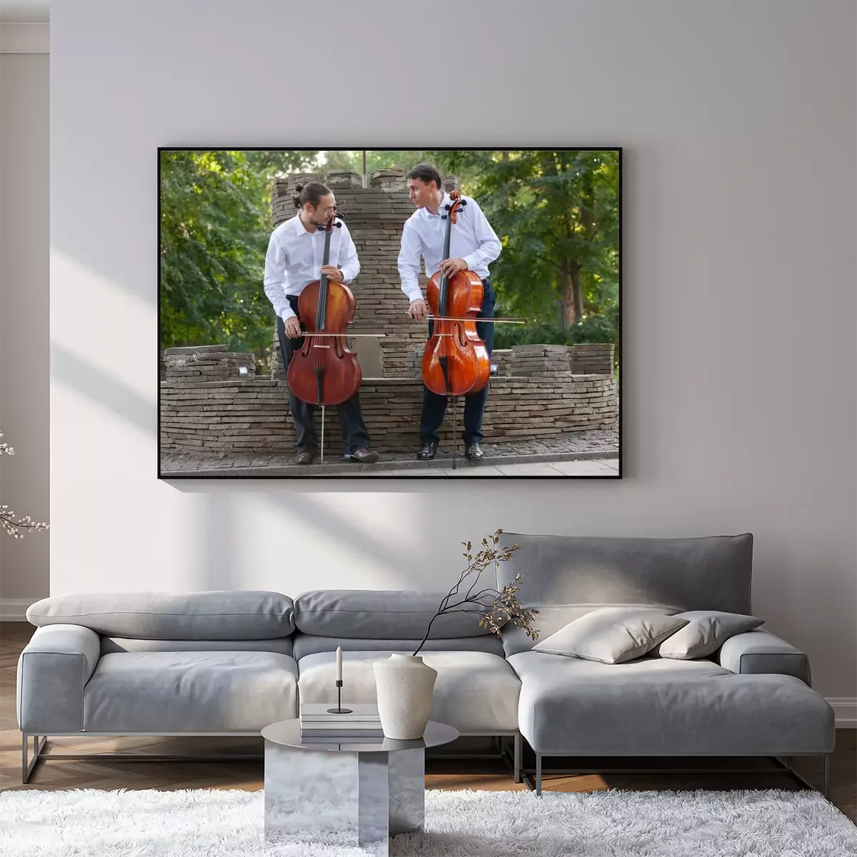Poster: Cellist musician group perform music in the street, close up man playing violin