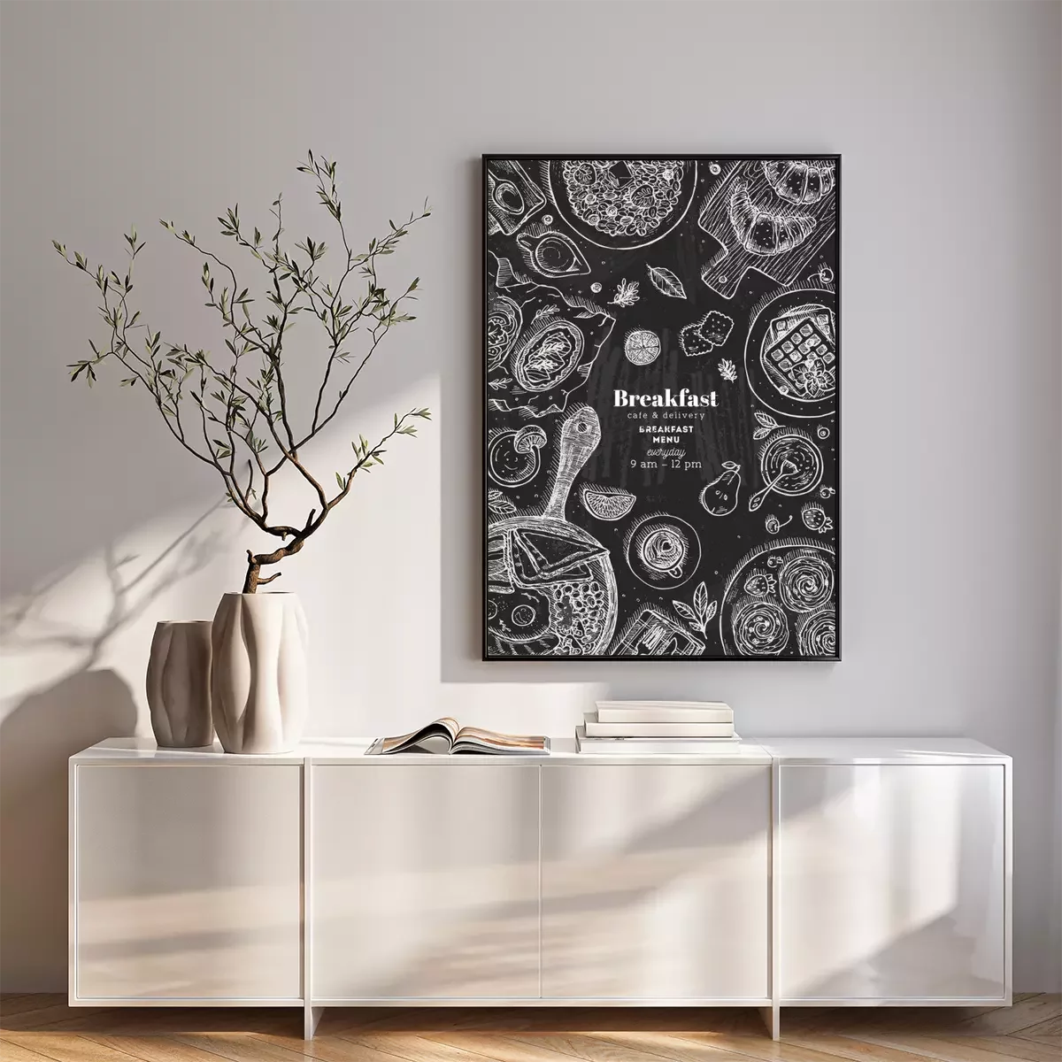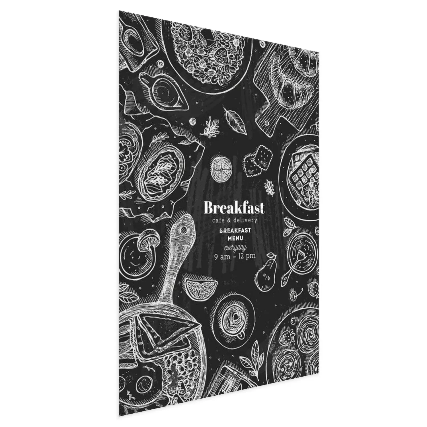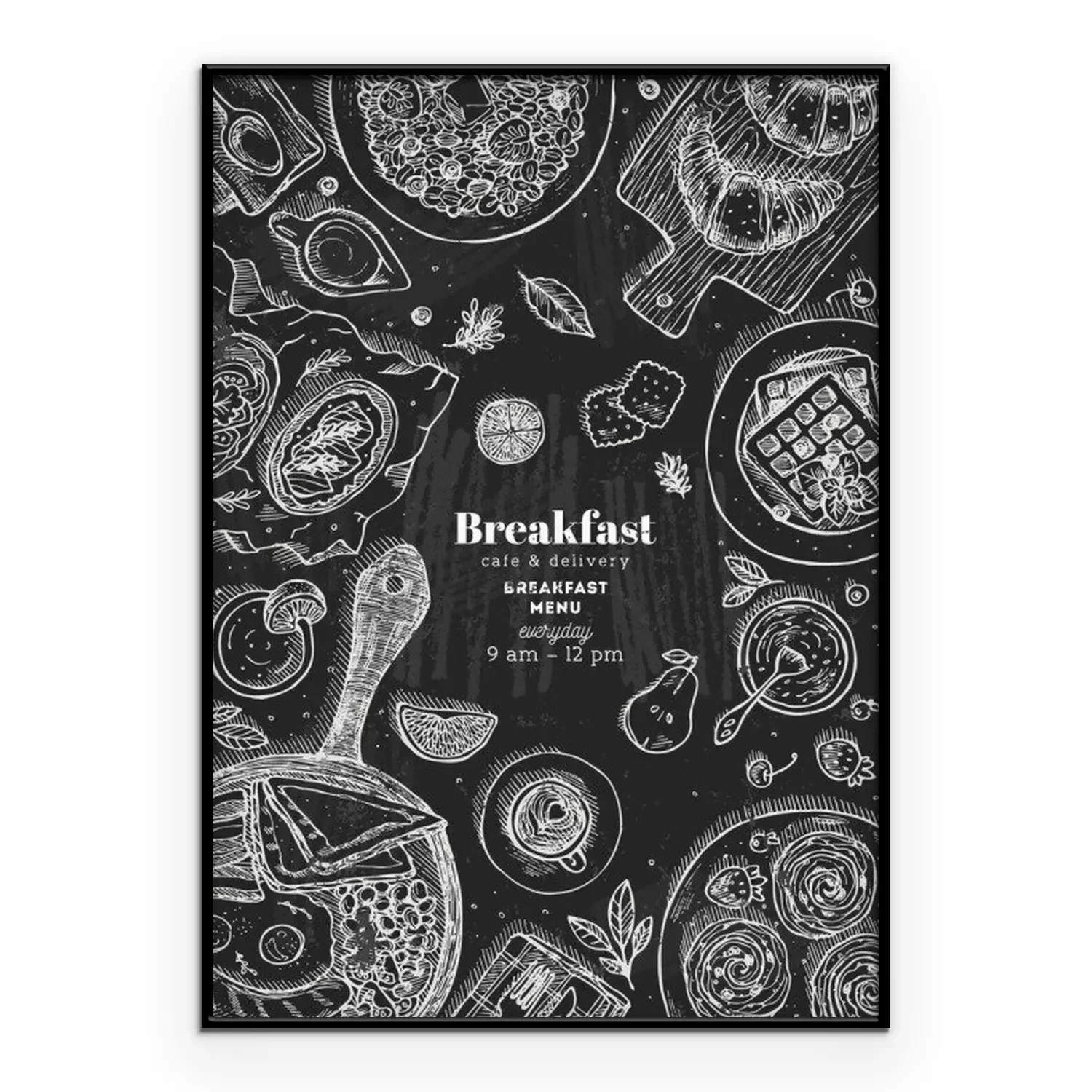 Poster Chalkboard vertical breakfast top view illustration. Various food background. Engraved style illustration. Hero image. Vector illustration