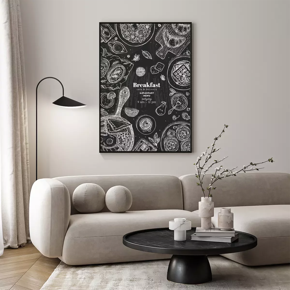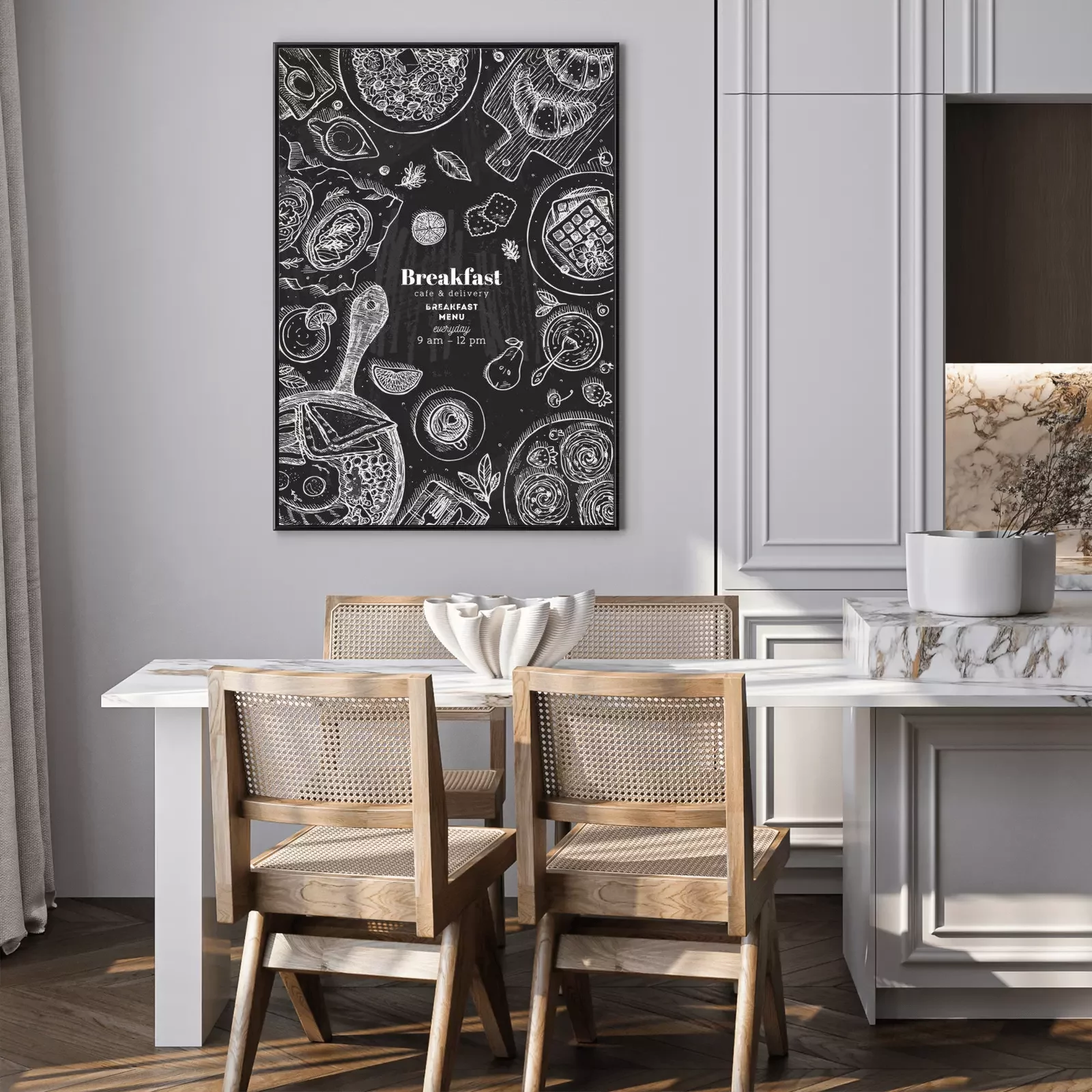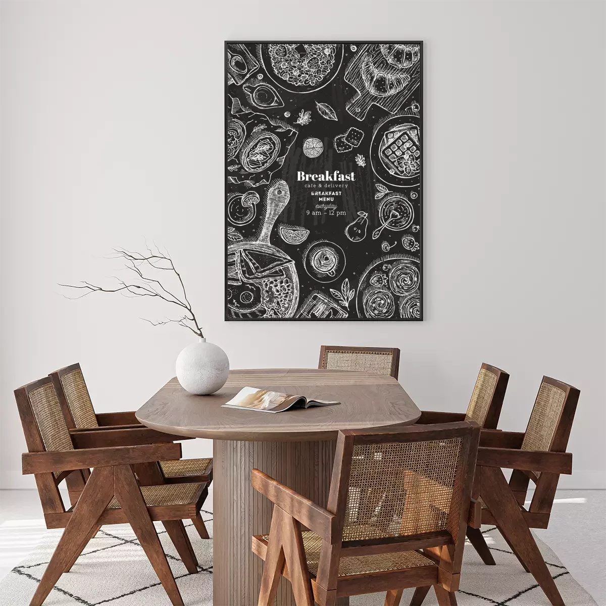 Poster Chalkboard vertical breakfast top view illustration. Various food background. Engraved style illustration. Hero image. Vector illustration