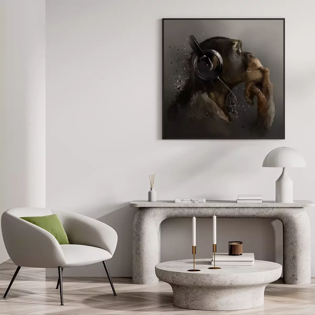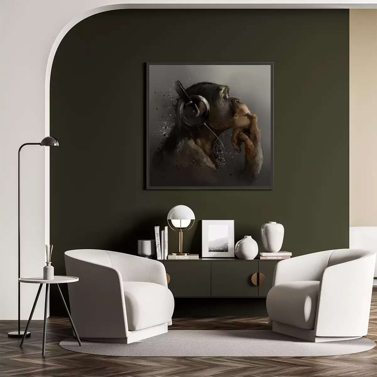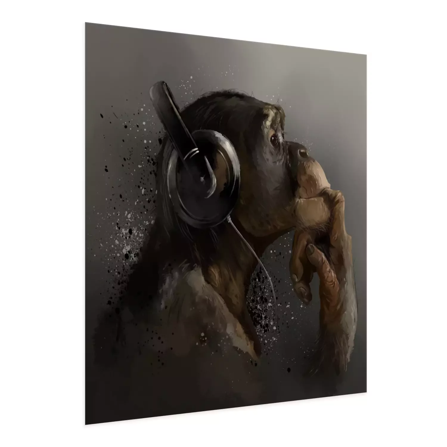 Poster: Chimpanzee listening to music. Watercolor drawing