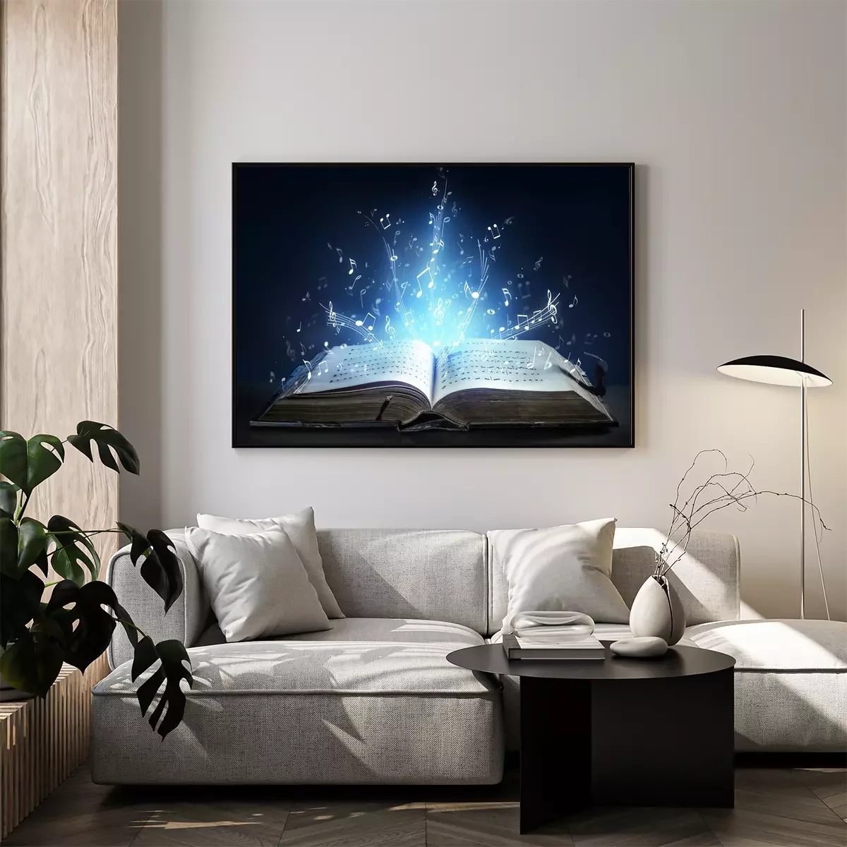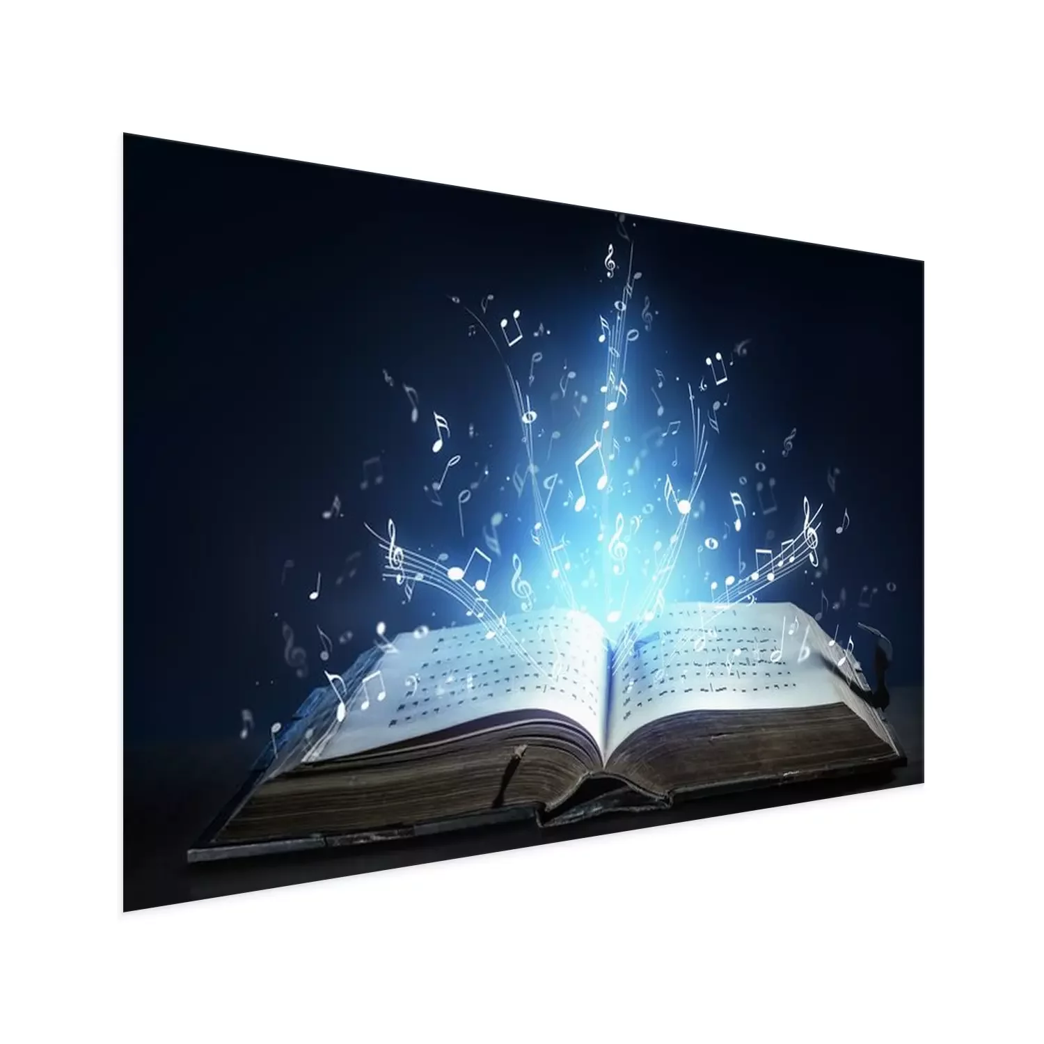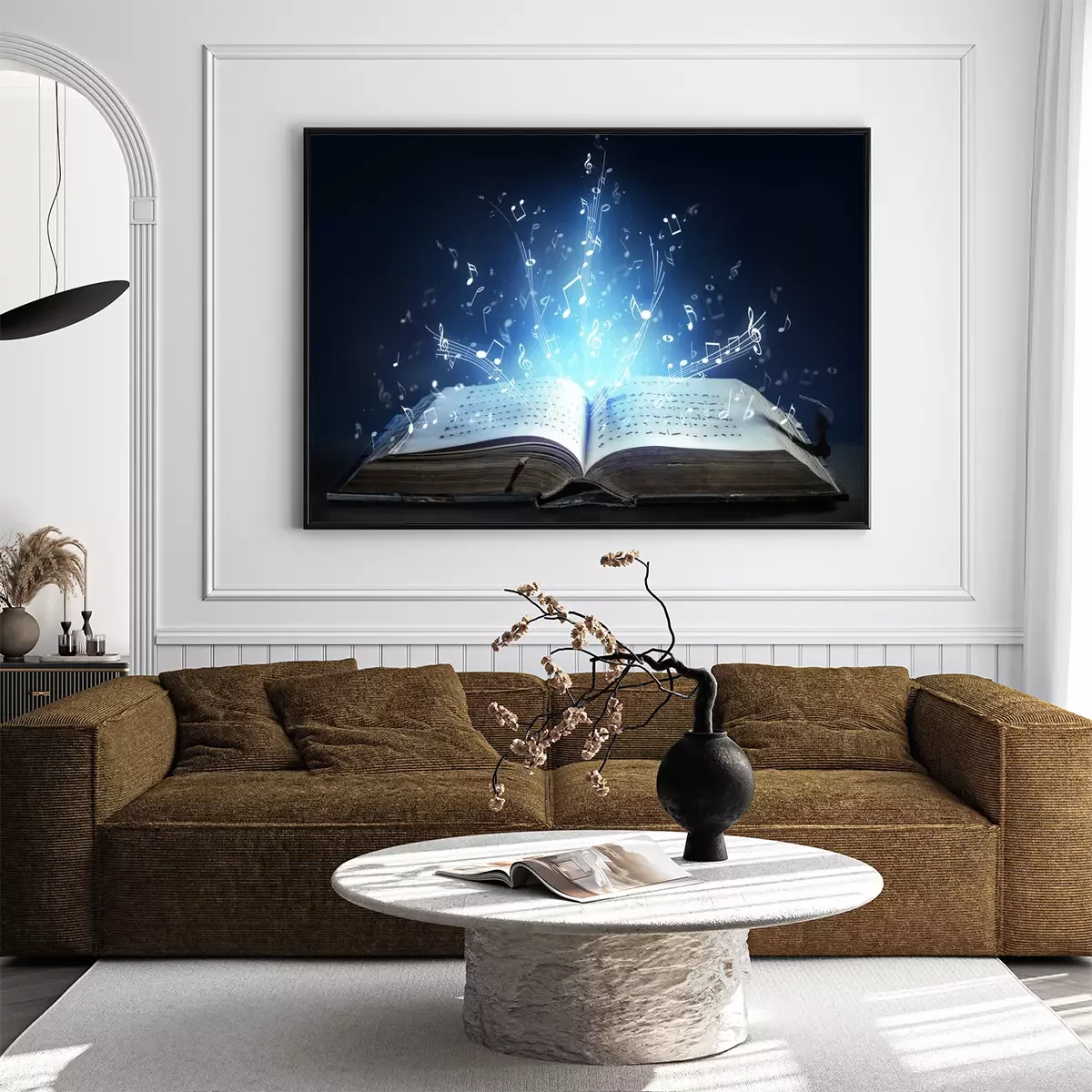 Poster: Classical Symphony schijnt met muzieknoten uit een oud boek van Songs