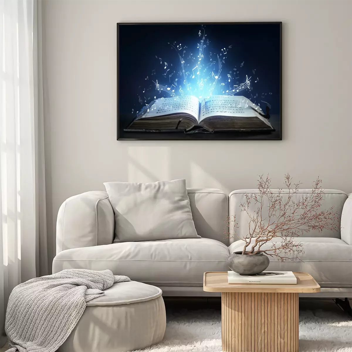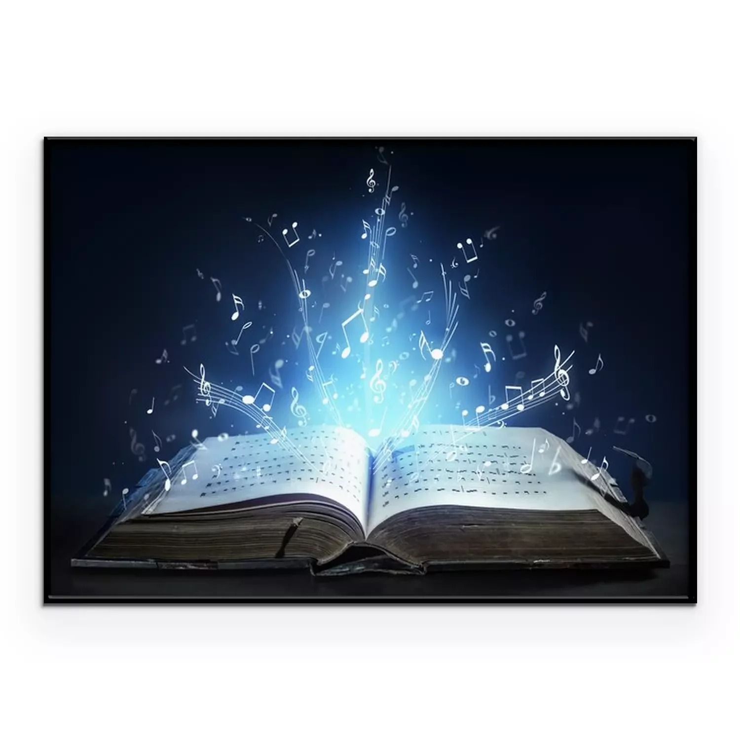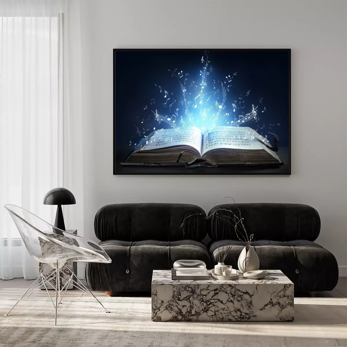 Poster: Classical Symphony schijnt met muzieknoten uit een oud boek van Songs