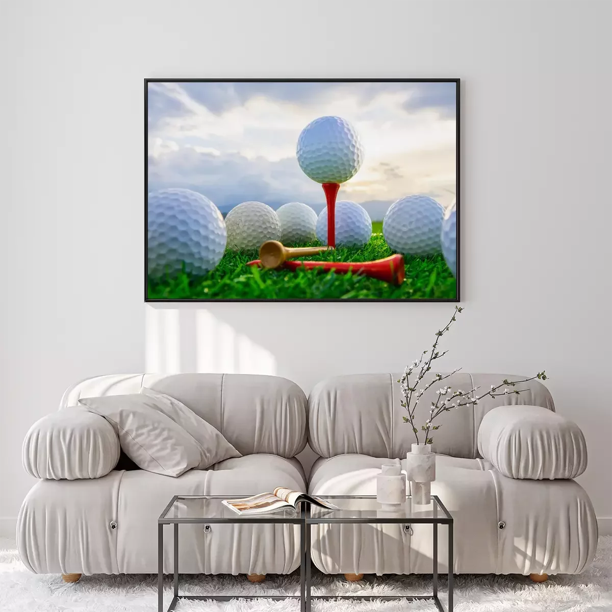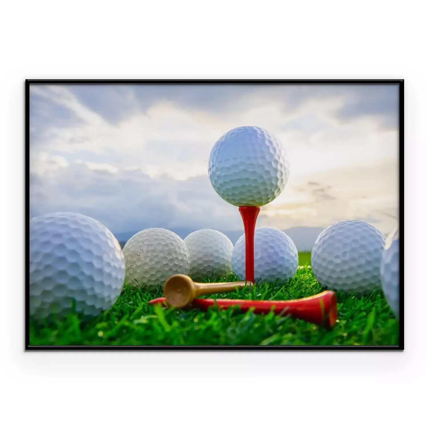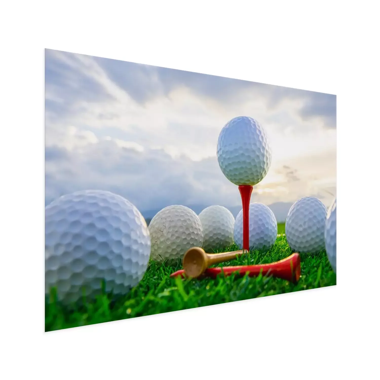 Poster: close-up van de golfbal op tee haringen klaar om te spelen en op groen gras in de natuur achtergrond