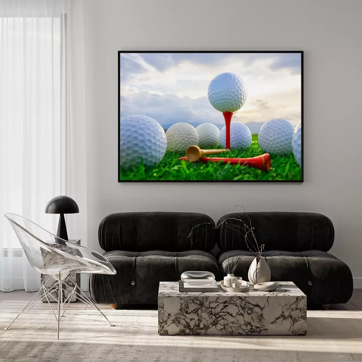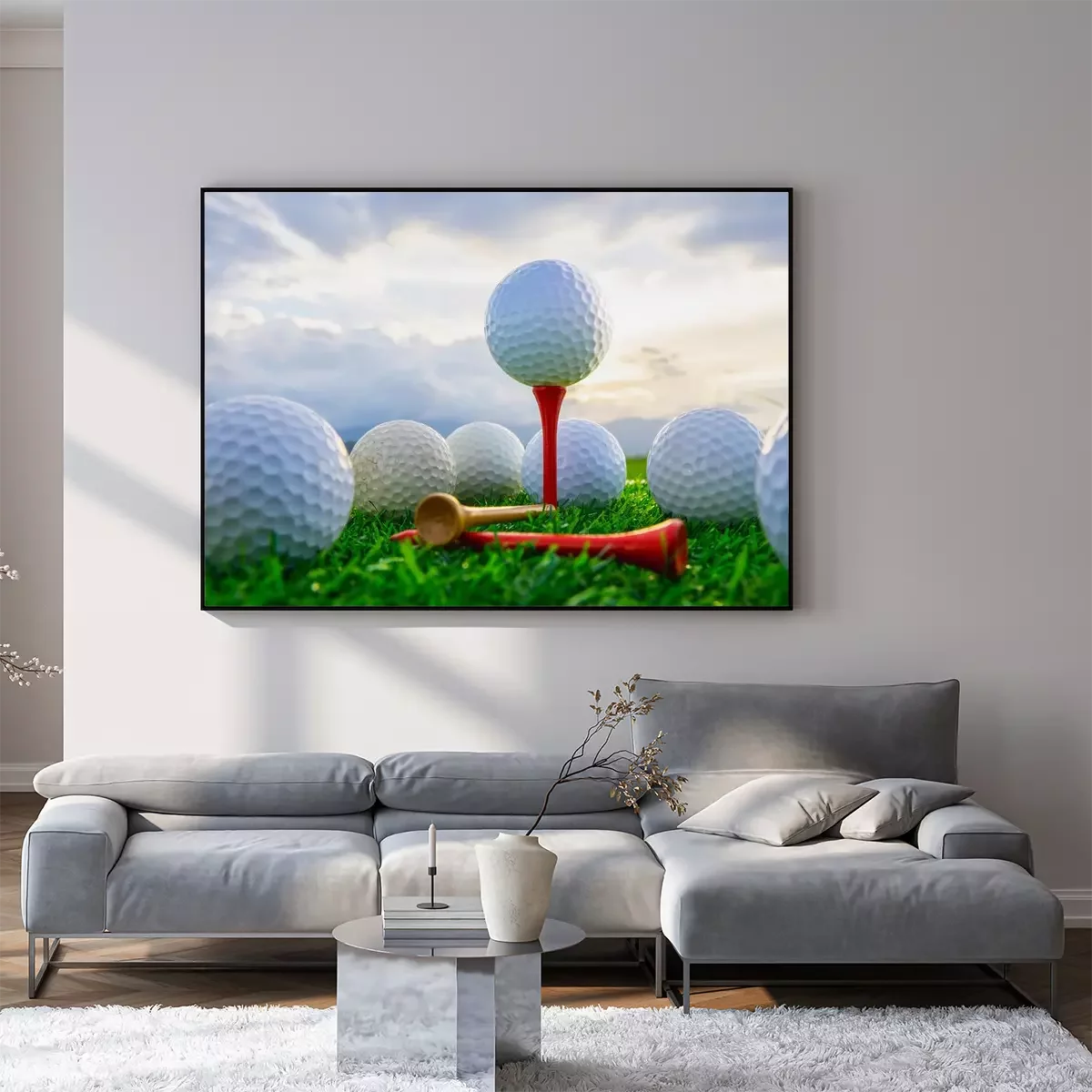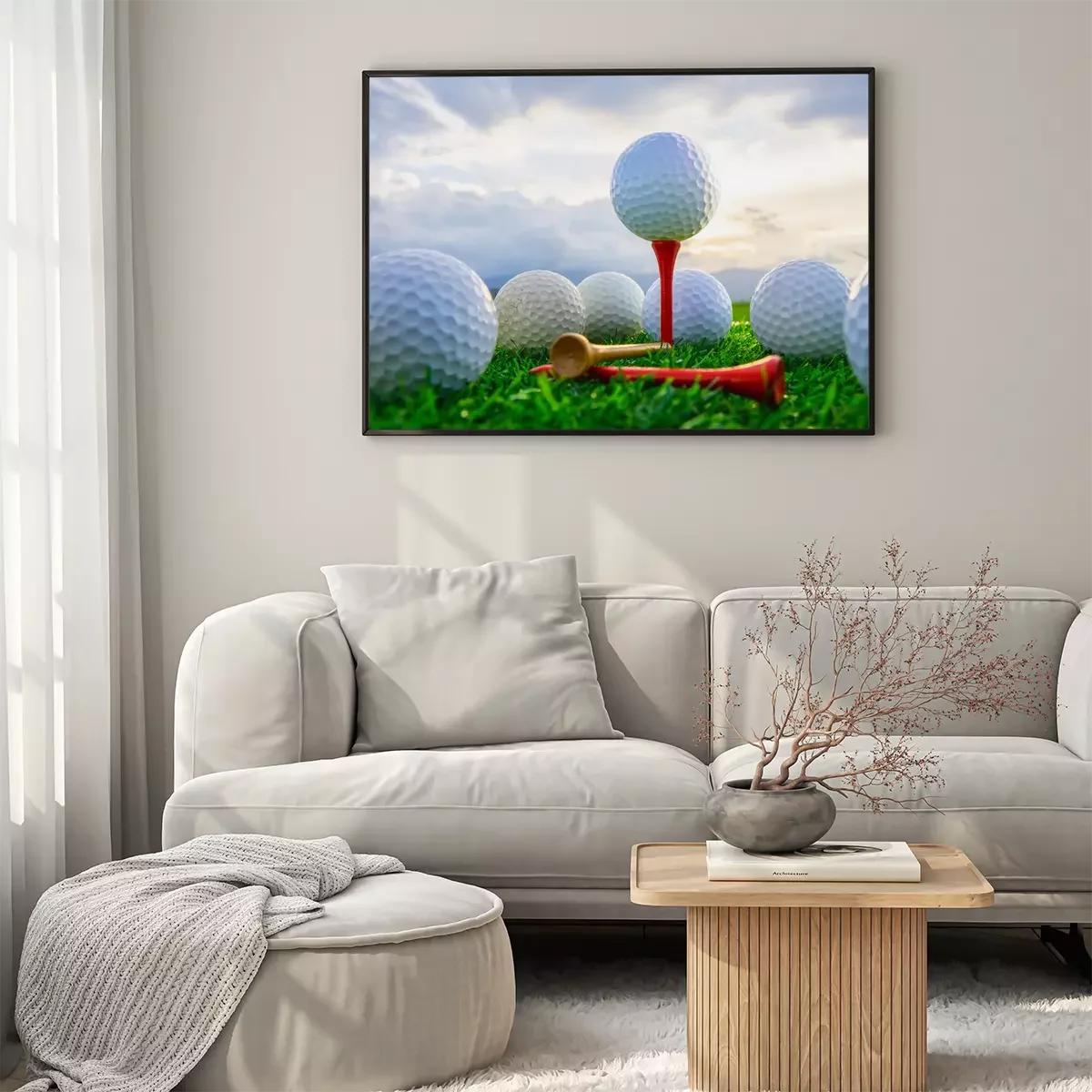 Poster: close-up van de golfbal op tee haringen klaar om te spelen en op groen gras in de natuur achtergrond