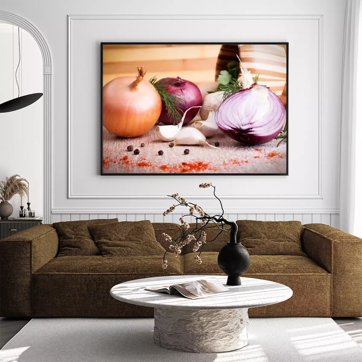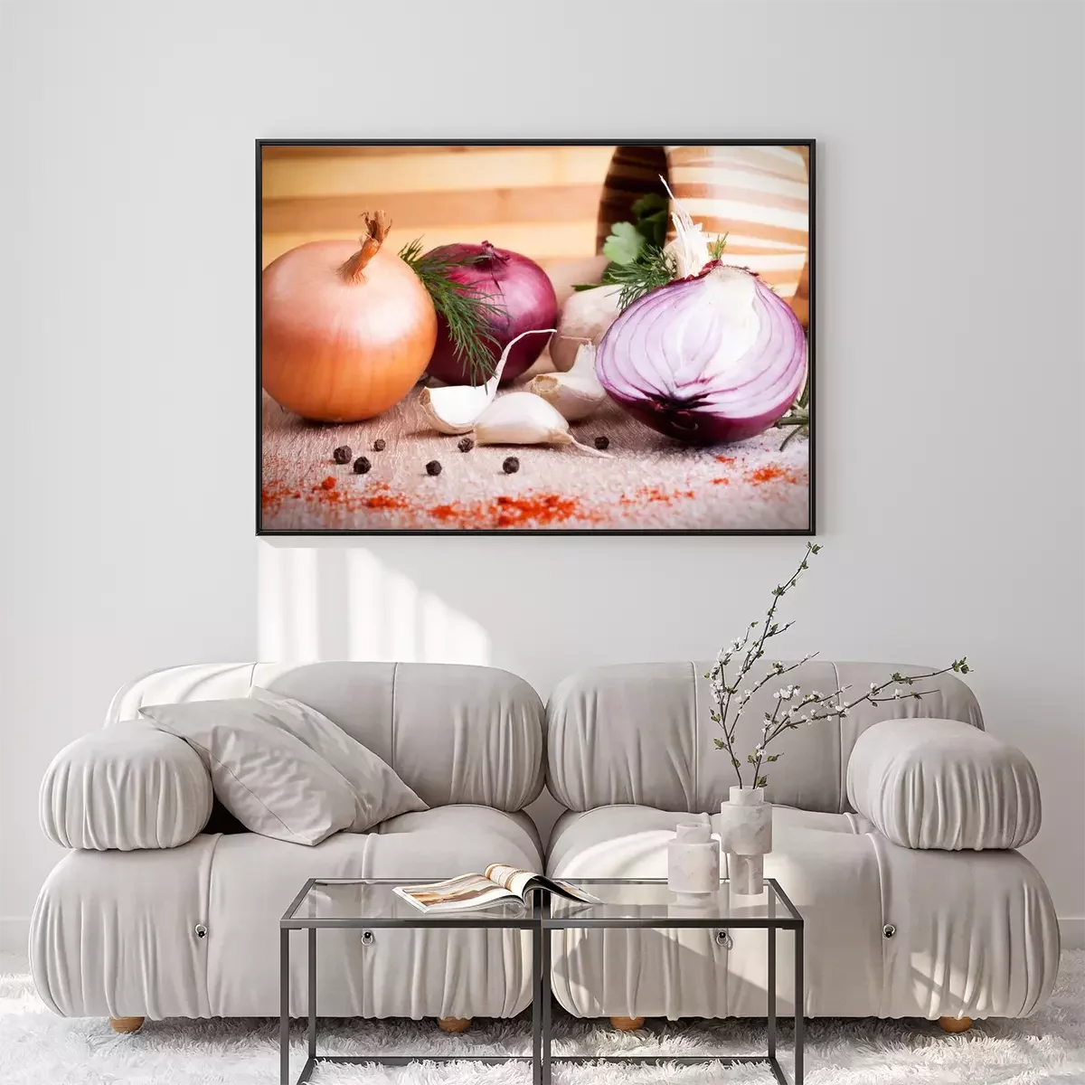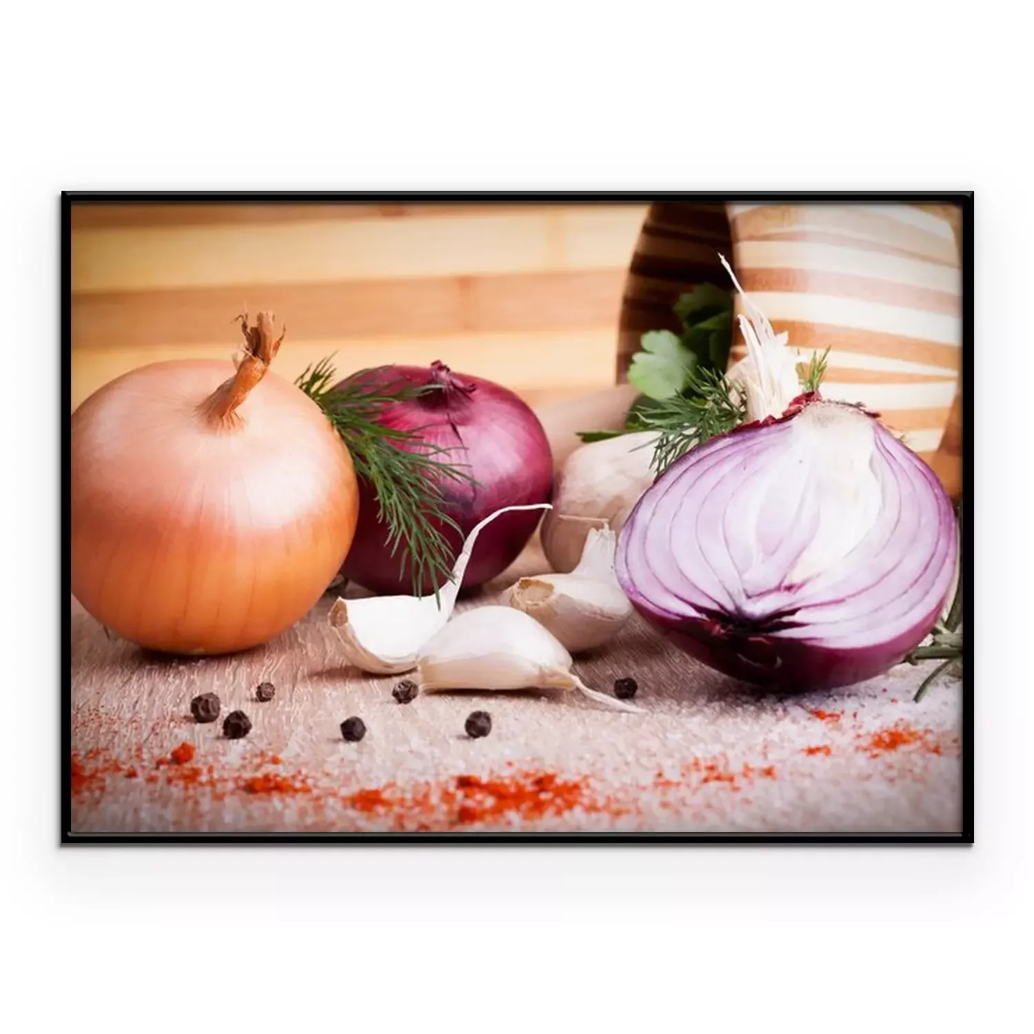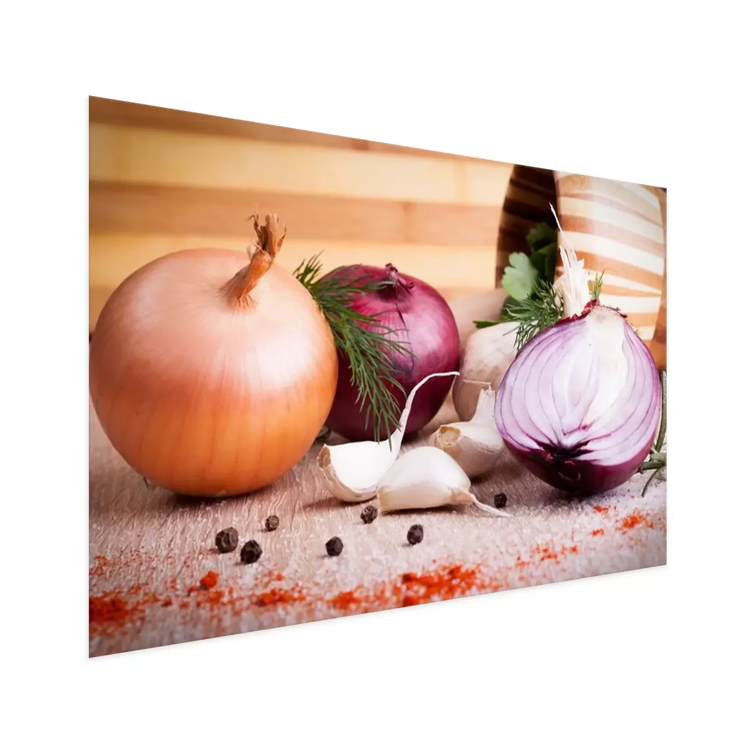 Poster: close up van knoflook, ui verse kruiden op een houten bord
