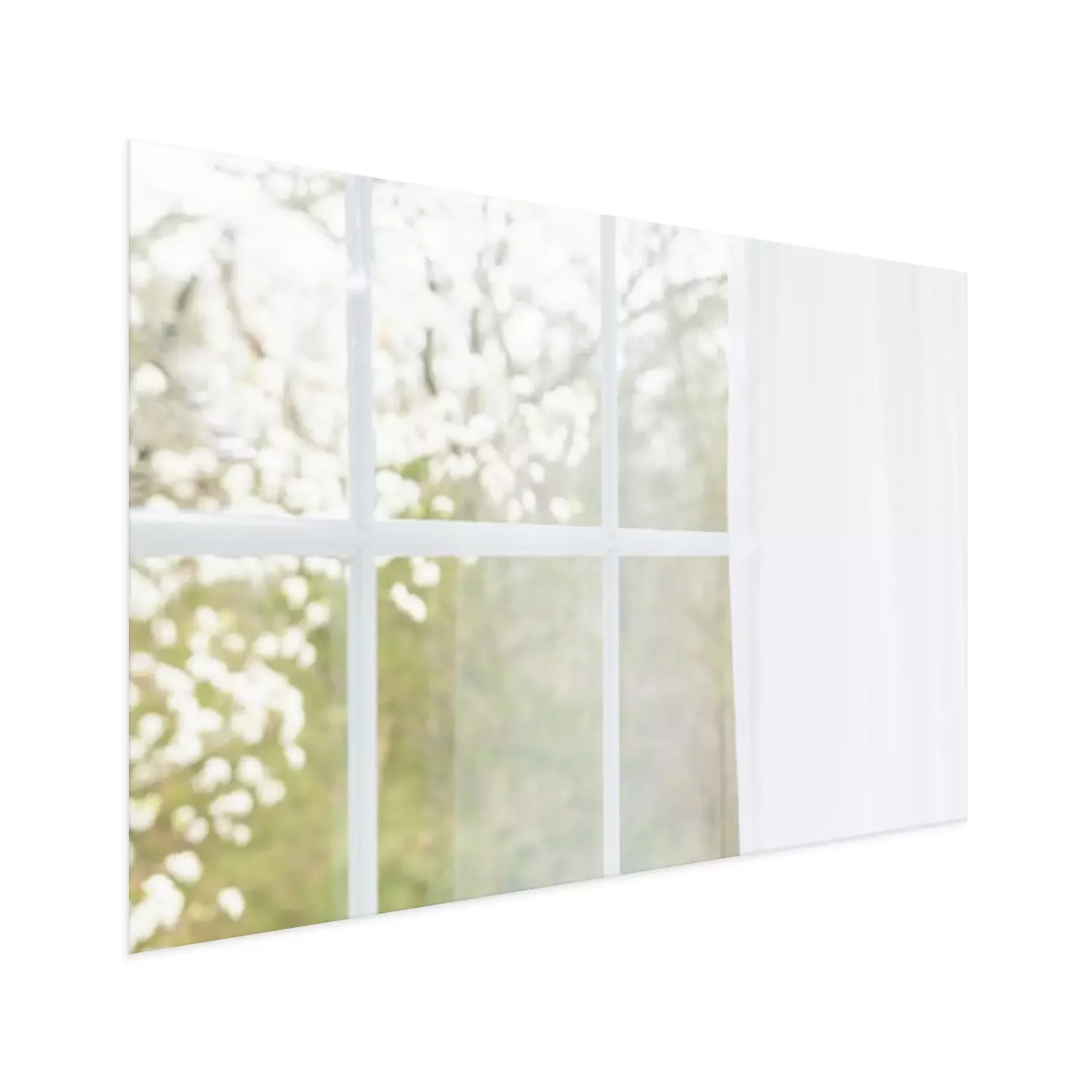 Poster: Close-up van moderne witte kantgordijnen met mening door glasvenster op tuin in de lente of de zomer met sakura, de boom van kersenbloesembloemen