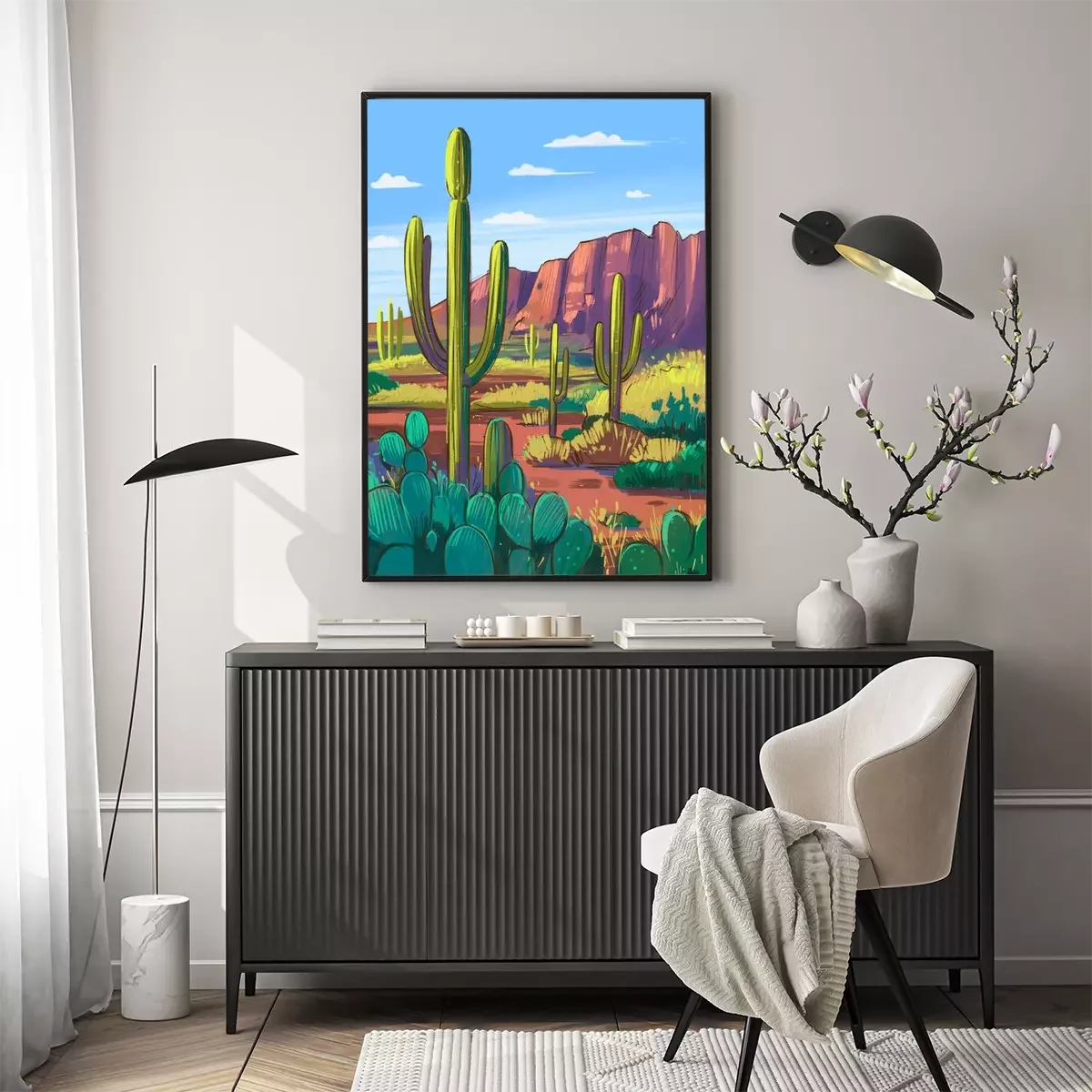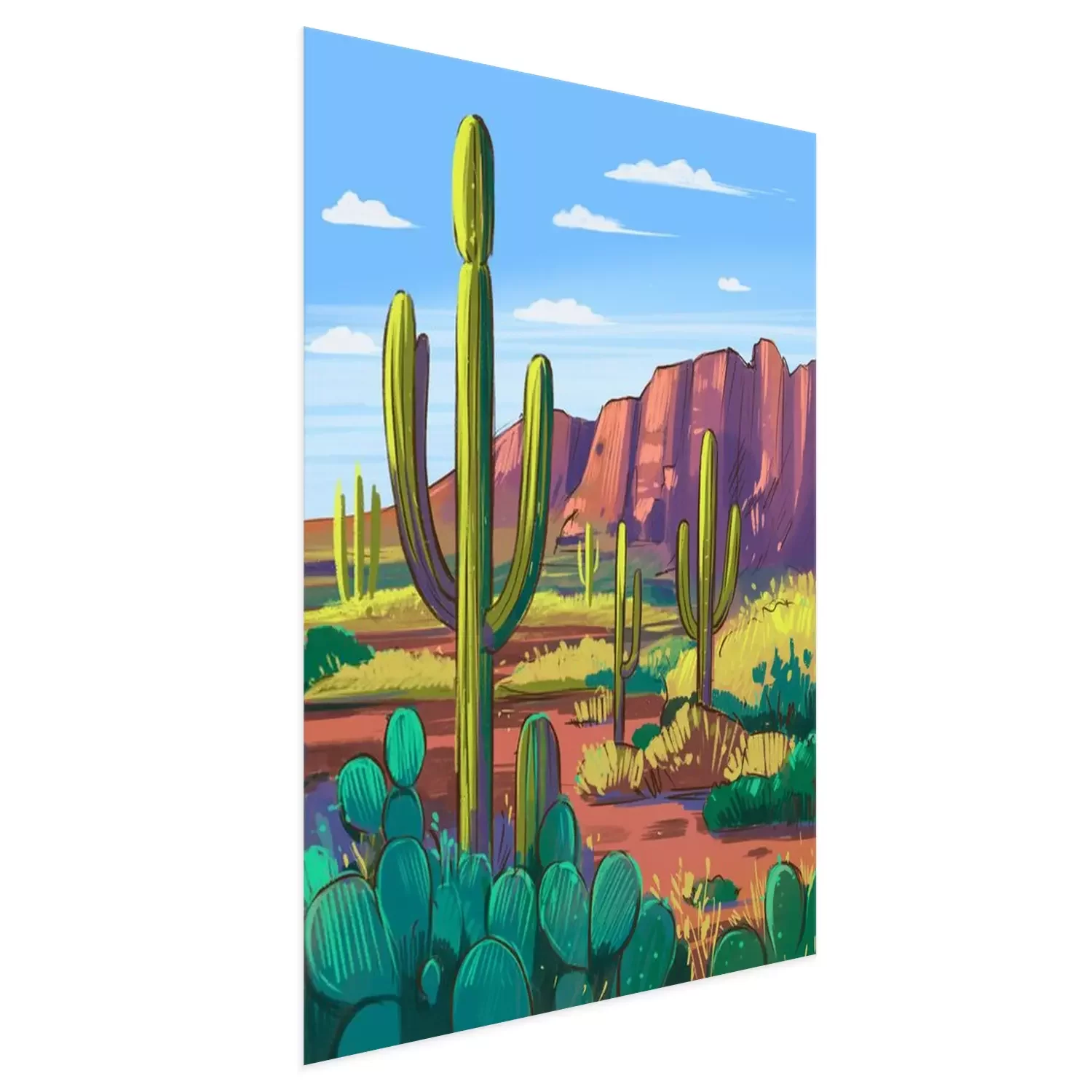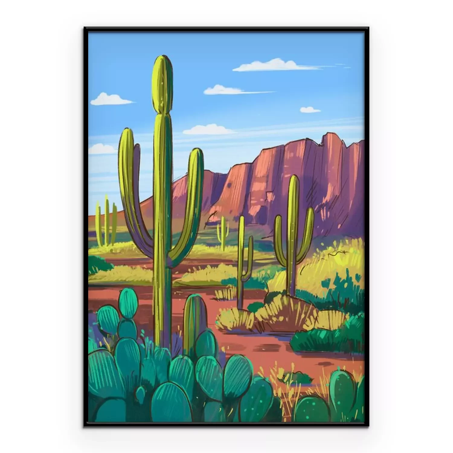 Poster Color sketch of the desert of America with cacti. Arizona desert. Prairie landscape. Hand drawn illustration