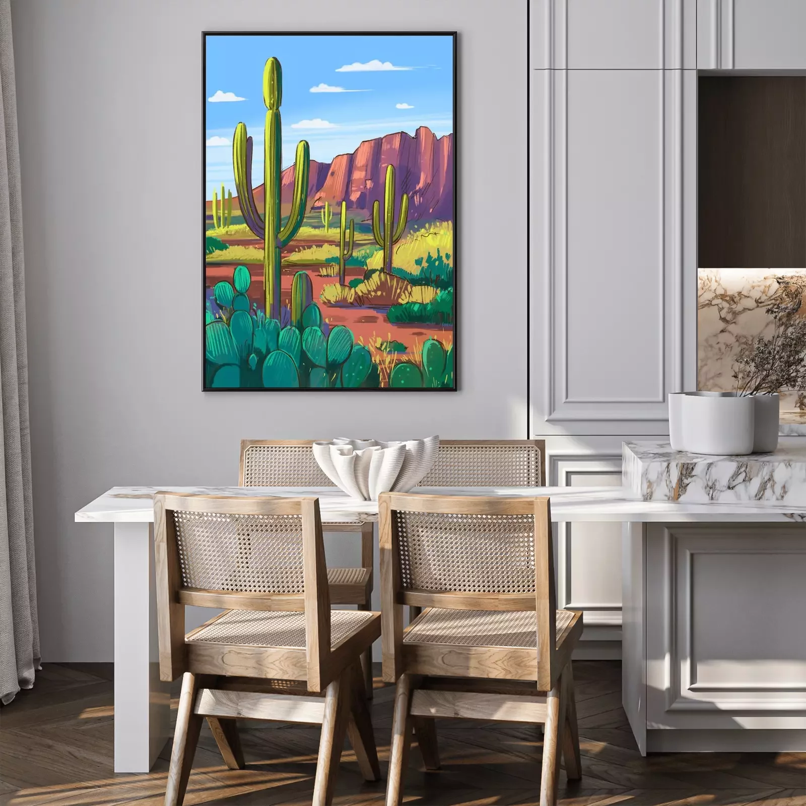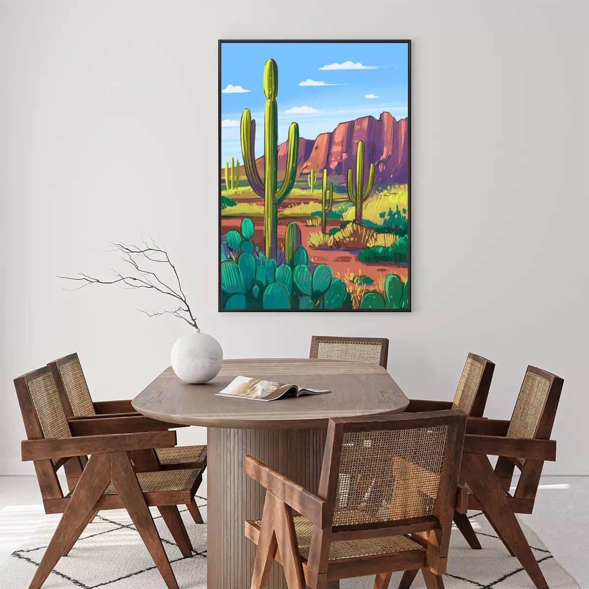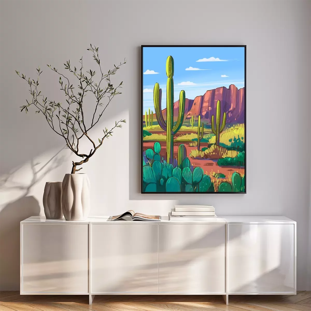Poster Color sketch of the desert of America with cacti. Arizona desert. Prairie landscape. Hand drawn illustration