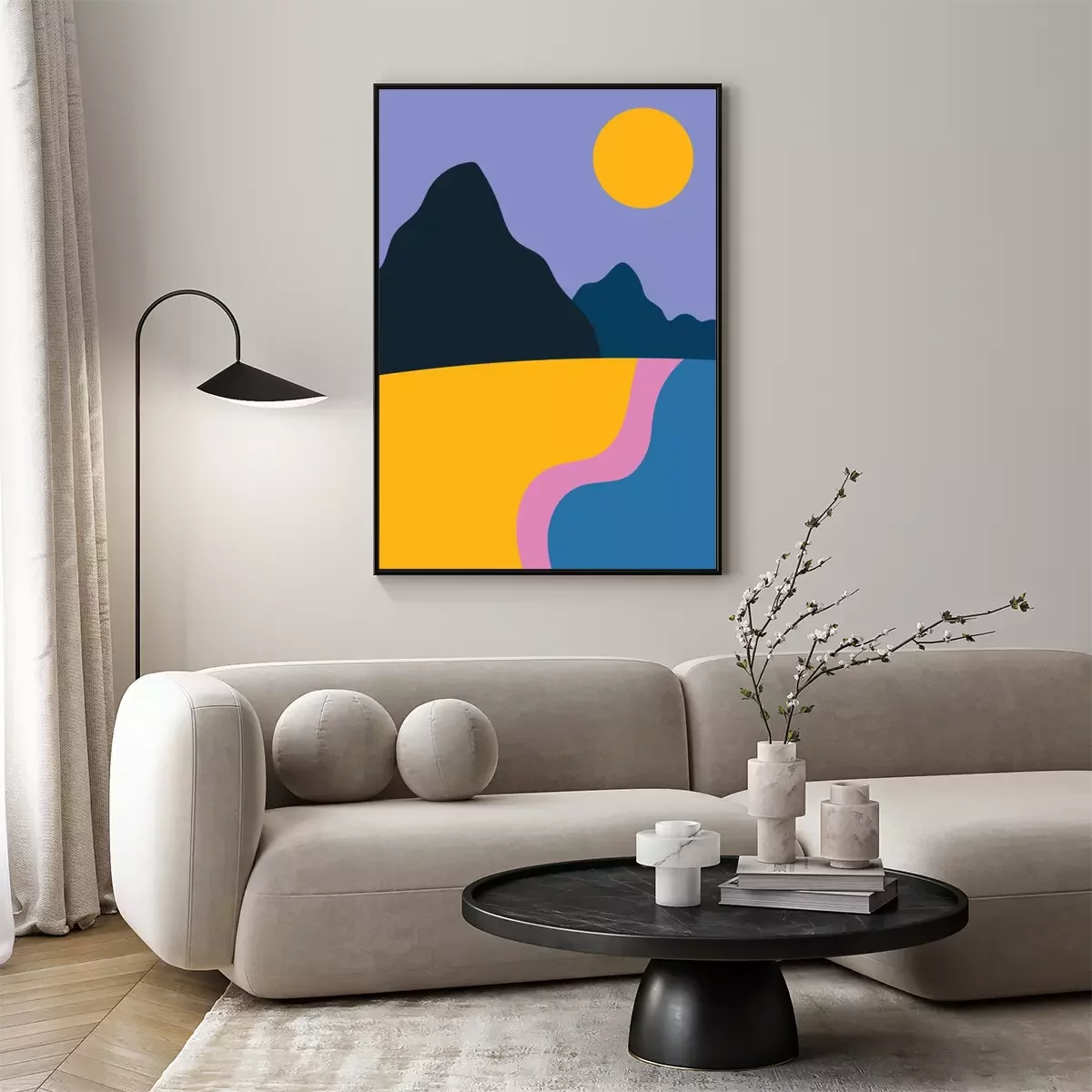 Poster Colorful background with landscape, abstract mountains. Abstract colored backdrop with hand-drawn elements or curves. Creative vector illustration - poster design.