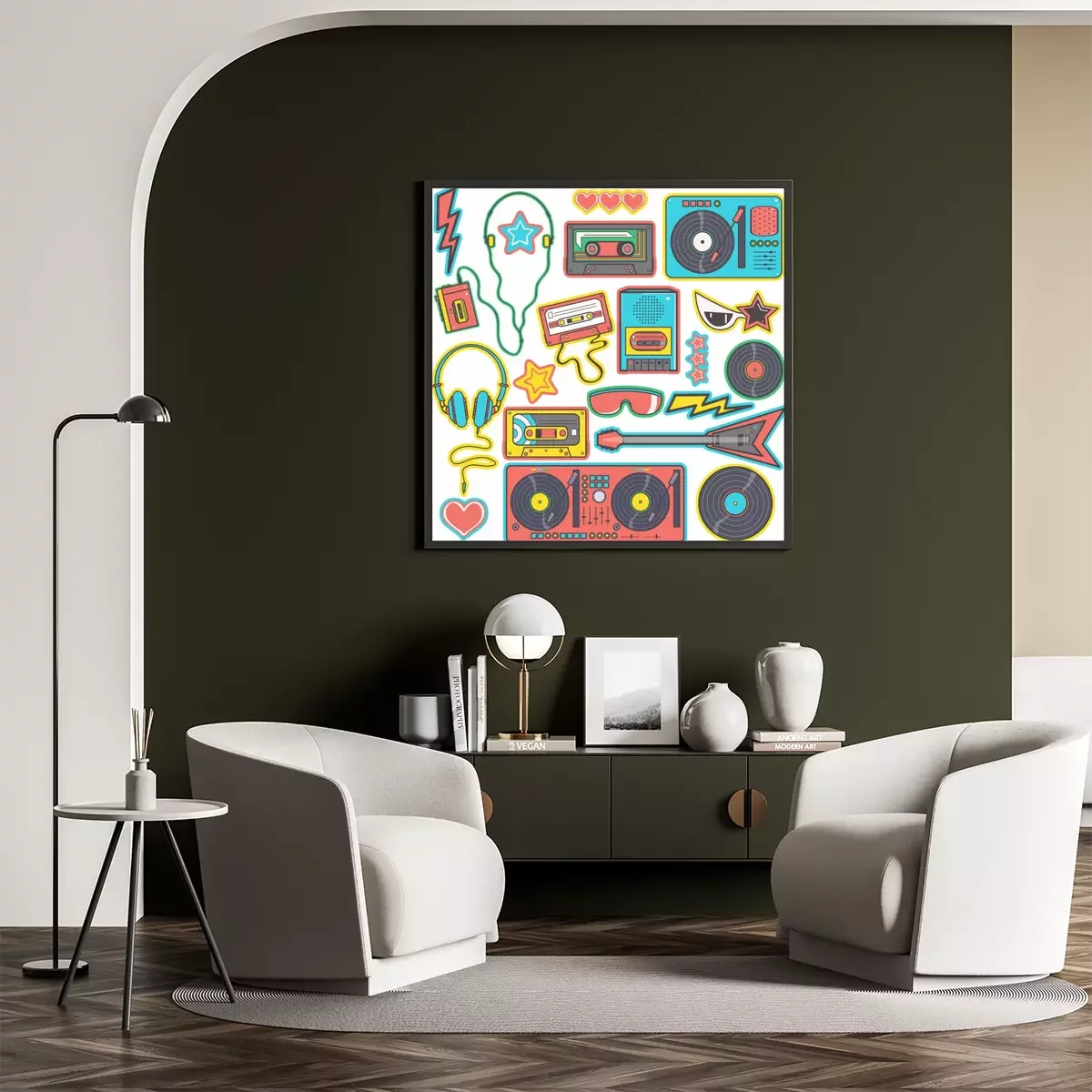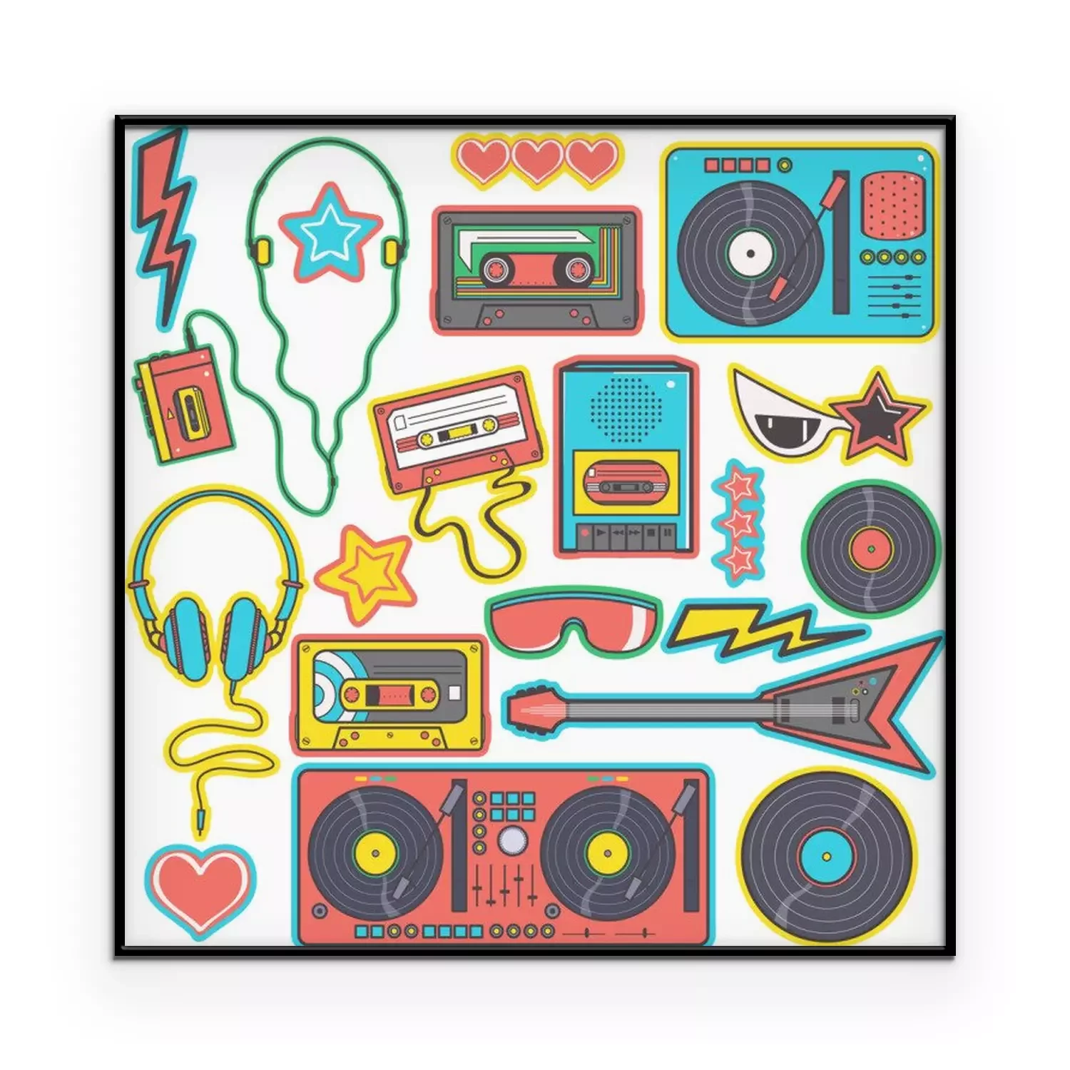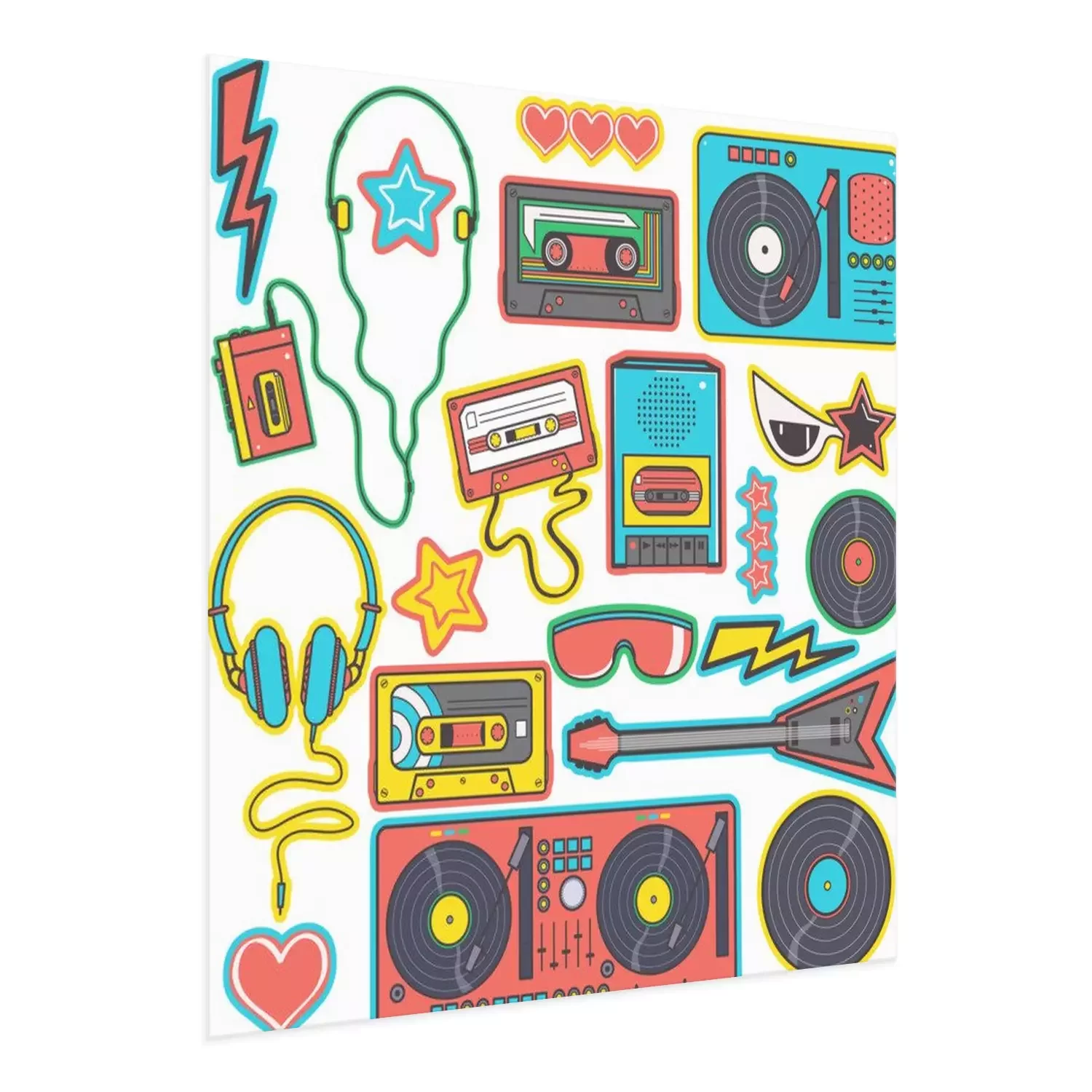 Poster Colorful collection of eighties pop music style stickers, isolated vector designs on white background