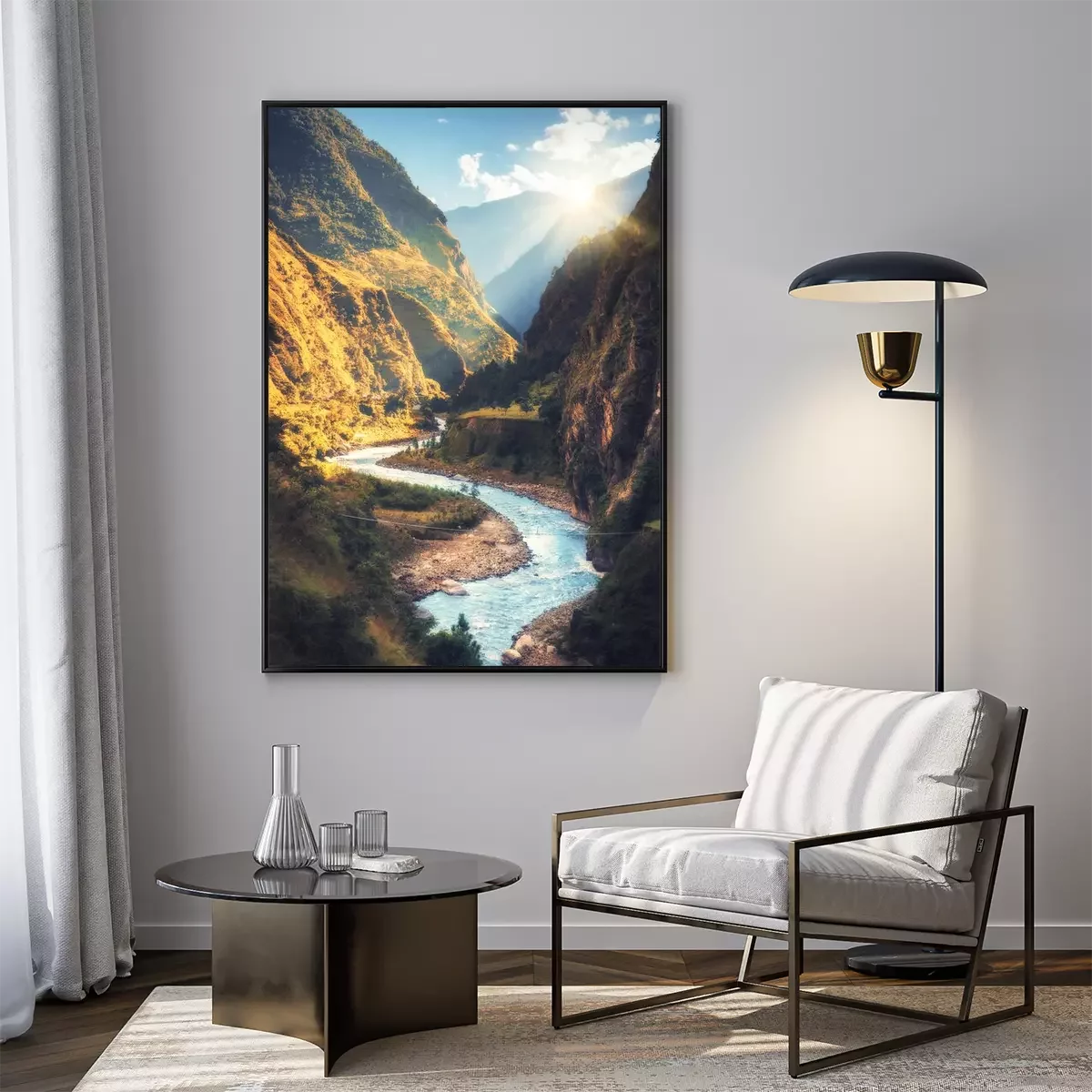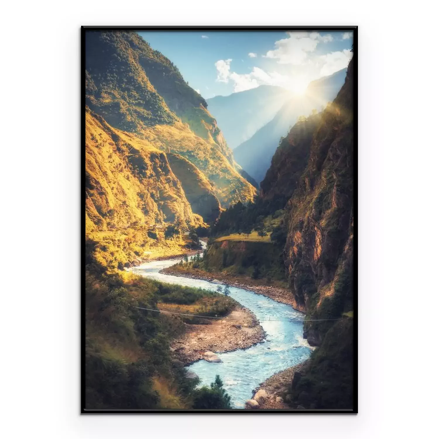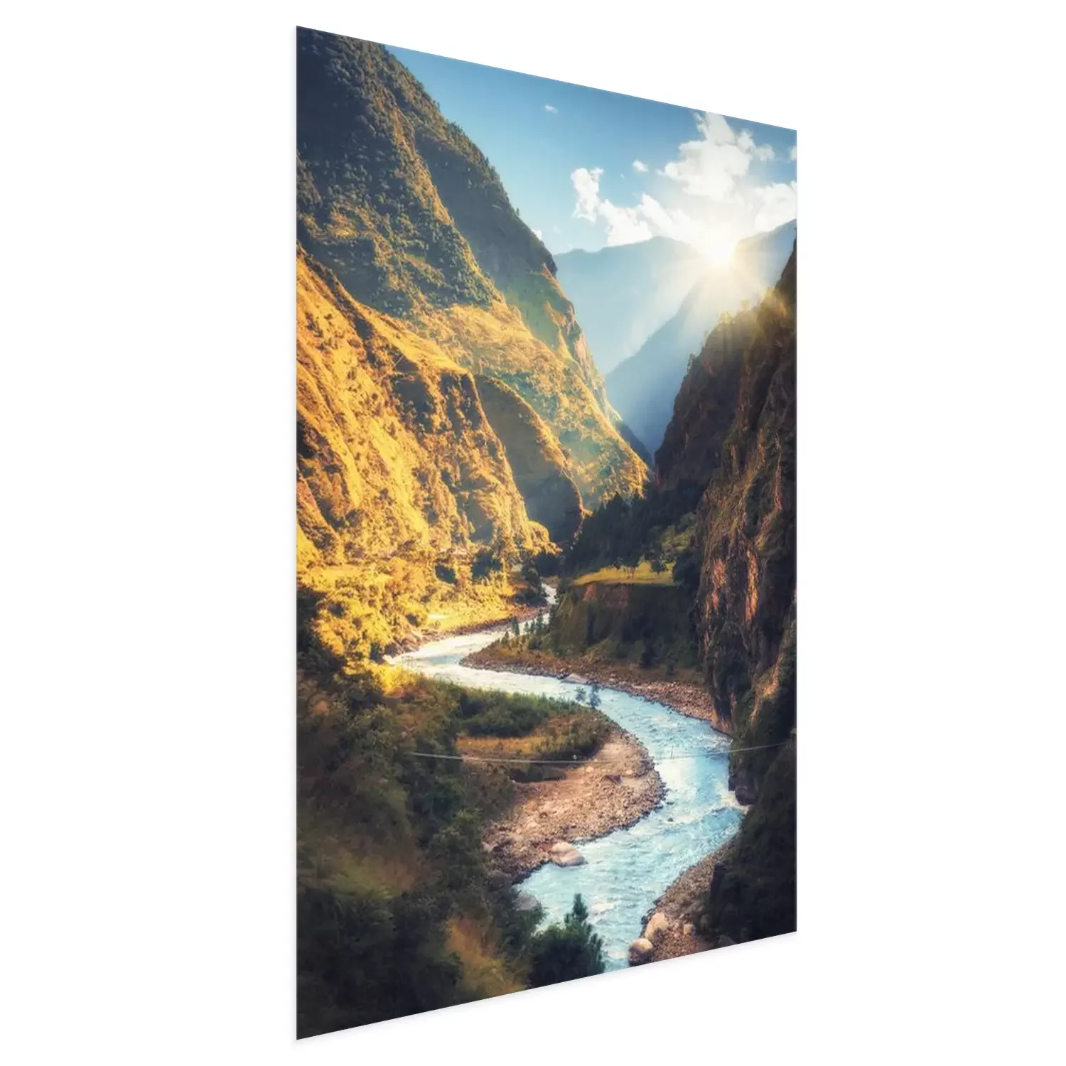 Poster: Colorful landscape with high Himalayan mountains, beautiful curving river, green forest, blue sky with clouds and yellow sunlight at sunset in autumn in Nepal. Mountain valley. Travel in Himalayas