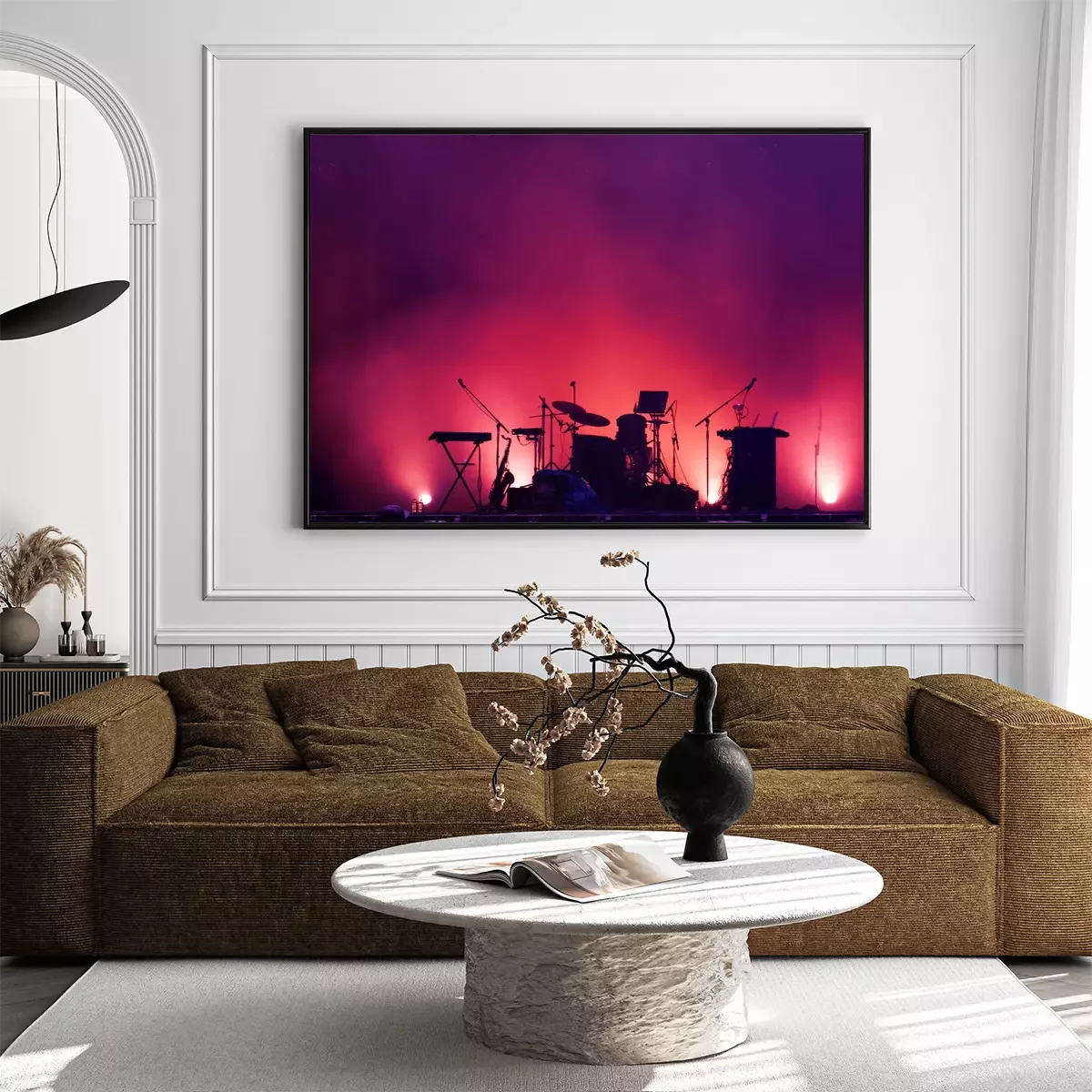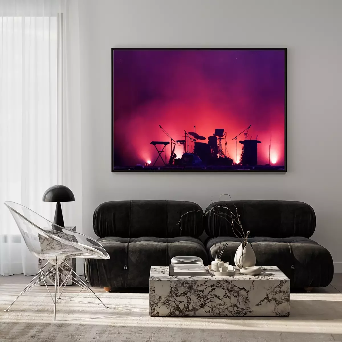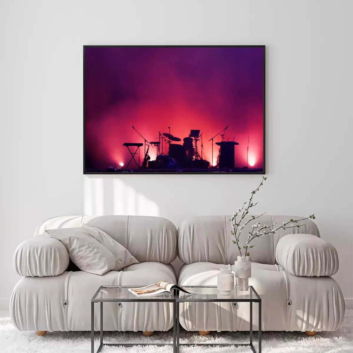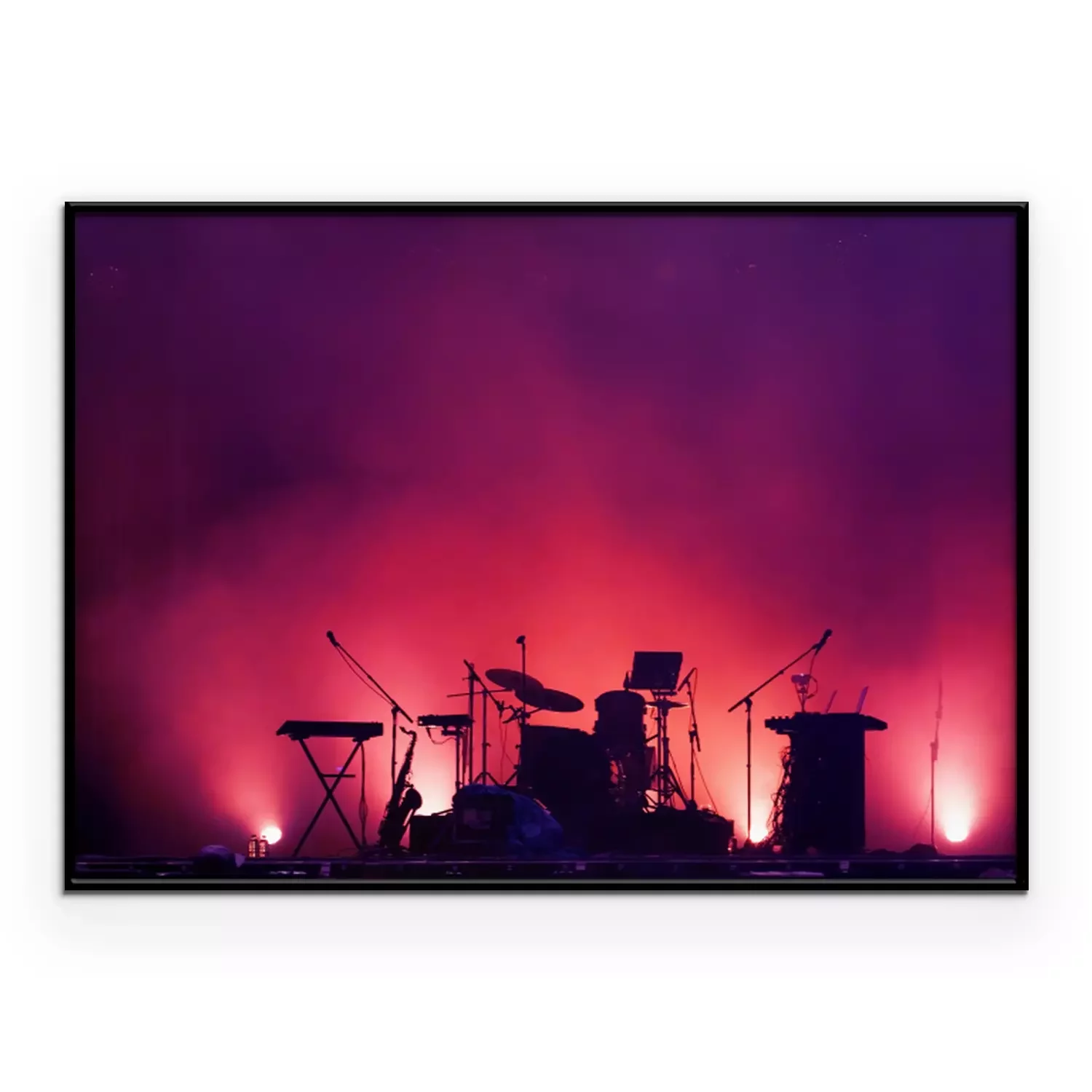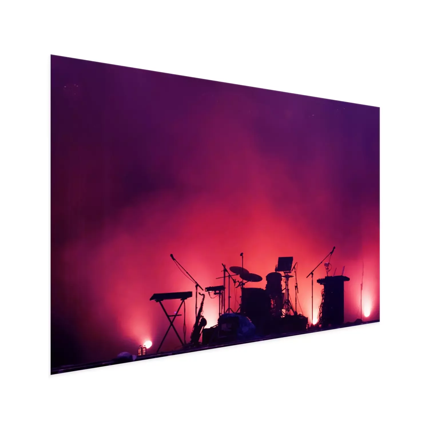 Poster: concert stage on rock festival, music instruments silhouettes, colorful background with copy space