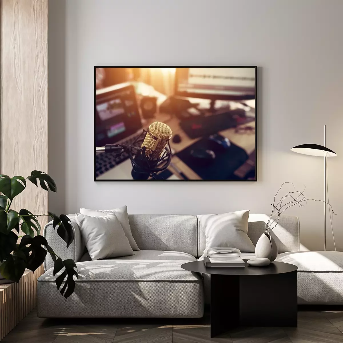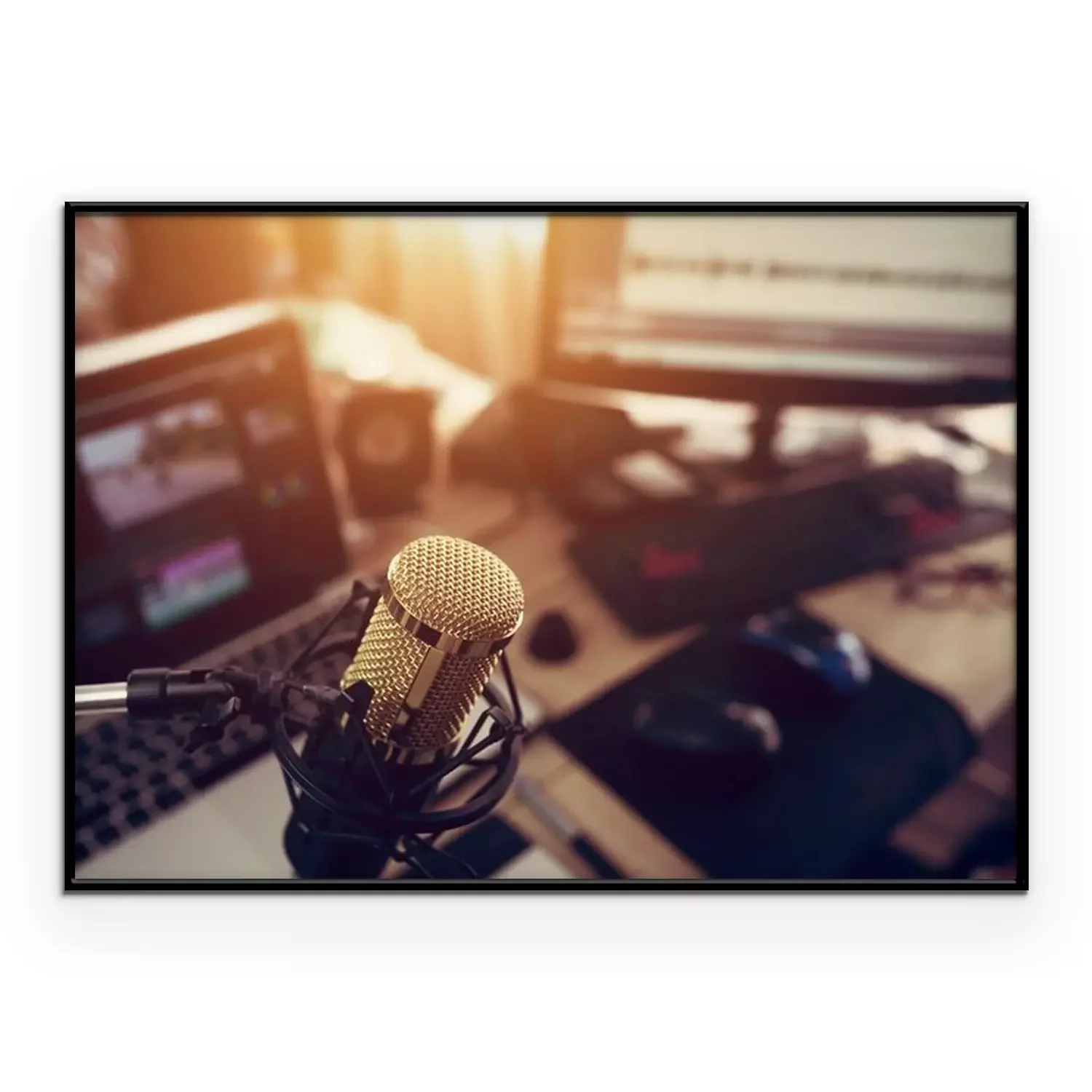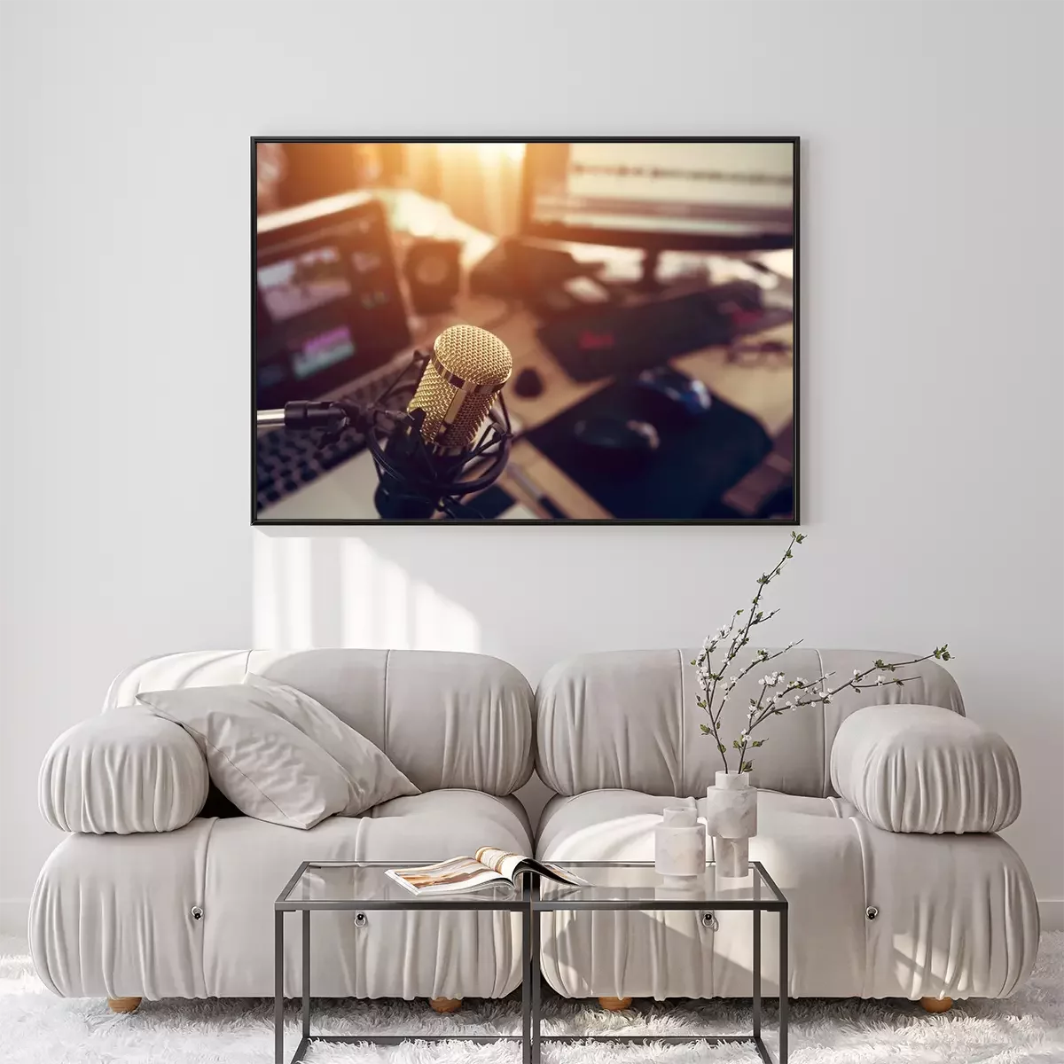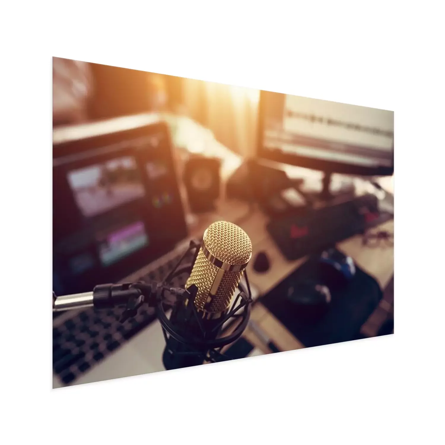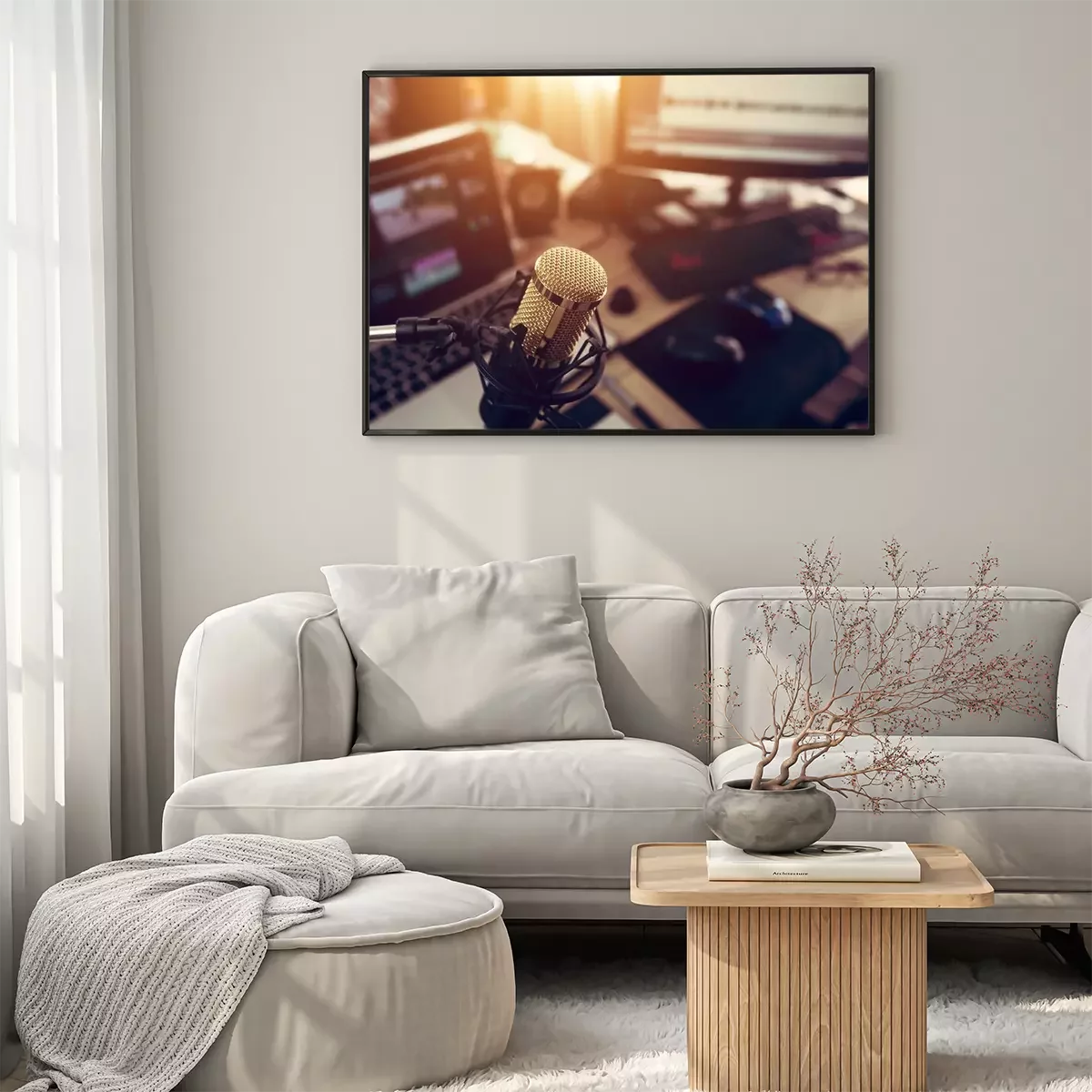 Poster: Condenser microphone golden in the studio recording creating the sound effect for the content creator